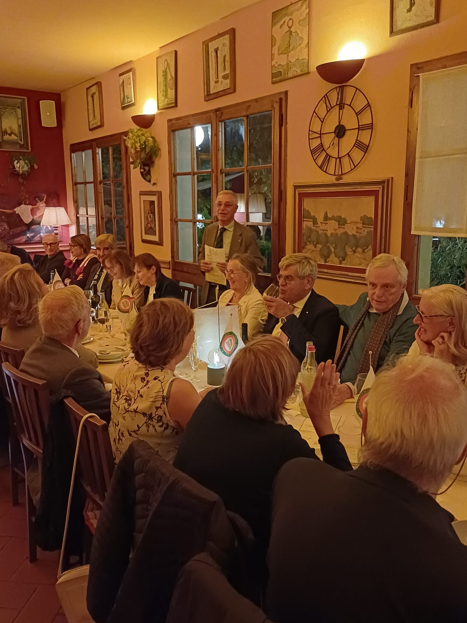 La Conviviale Ecumenica della Delegazione Valdarno Fiorentino si è tenuta al ristorante "Il Caminetto del Chianti". Il Simposiarca Gianni Gerini ha concordato con il cuoco un menù pienamente corrispondente al tema di questo anno “Gli Arrosti, gli umidi e i bolliti”. Pietanze semplici, preparate con ingredienti del territorio, secondo le ricette tipiche del Valdarno Fiorentino. Salsa verde per l'antipasto, tortellini Baragazza in brodo e lesso rifatto con le cipolle per testimoniare il riuso del bollito, come si usava un tempo. Sana abitudine che si tramanda e si mantiene ancora oggi. Alla Ecumenica hanno partecipato numerosi ospiti che insieme agli Accademici hanno contribuito a tenere vivo lo scopo della serata: simboleggiare l'unione spirituale e rafforzare il senso di comunità tra i membri. La serata si è conclusa con i complimenti alla brigata di cucina cui è stato donato il piatto commemorativo dei 70 anni dell'Accademia.