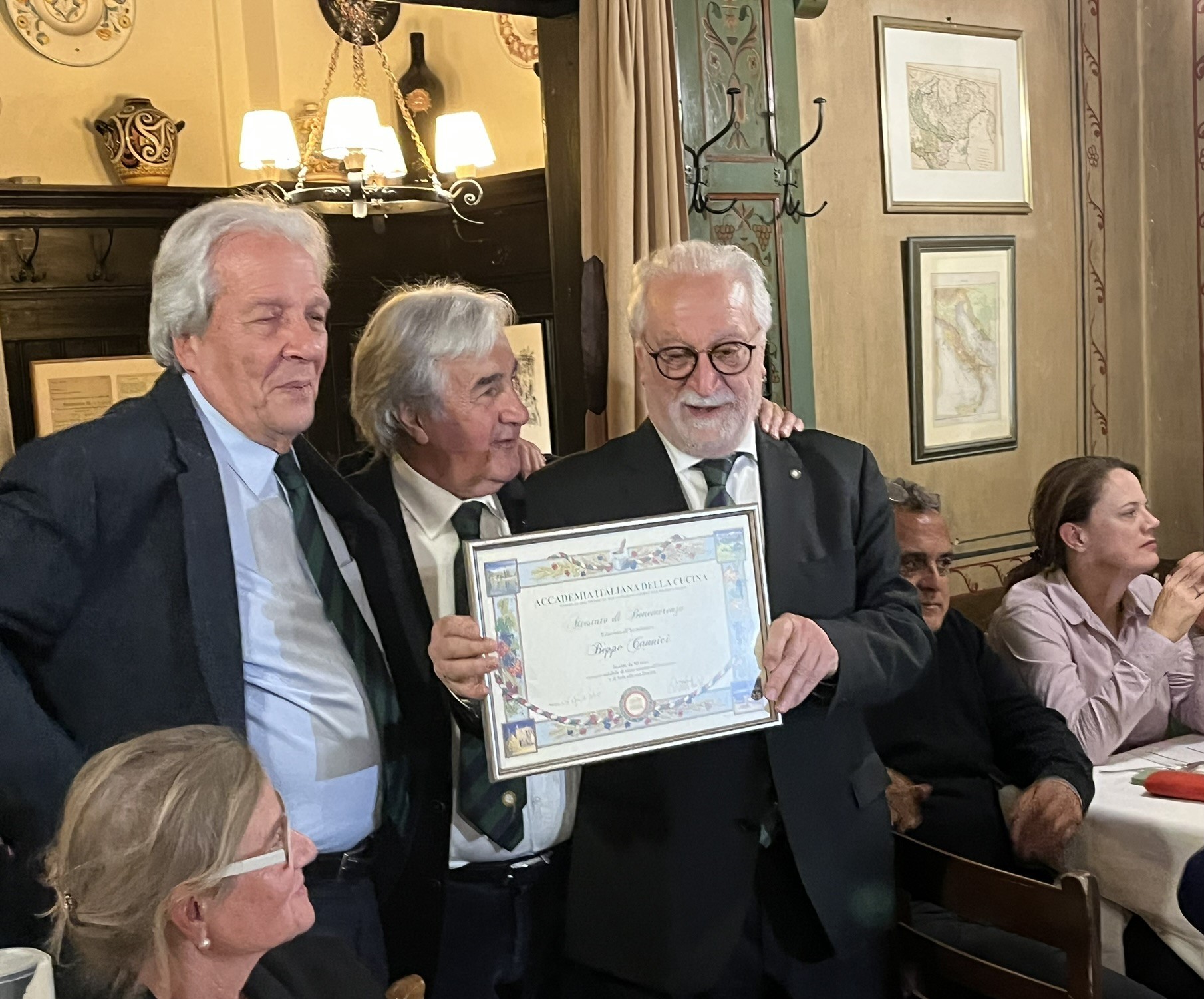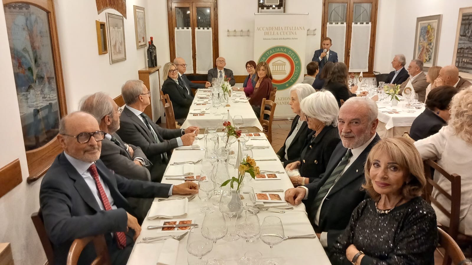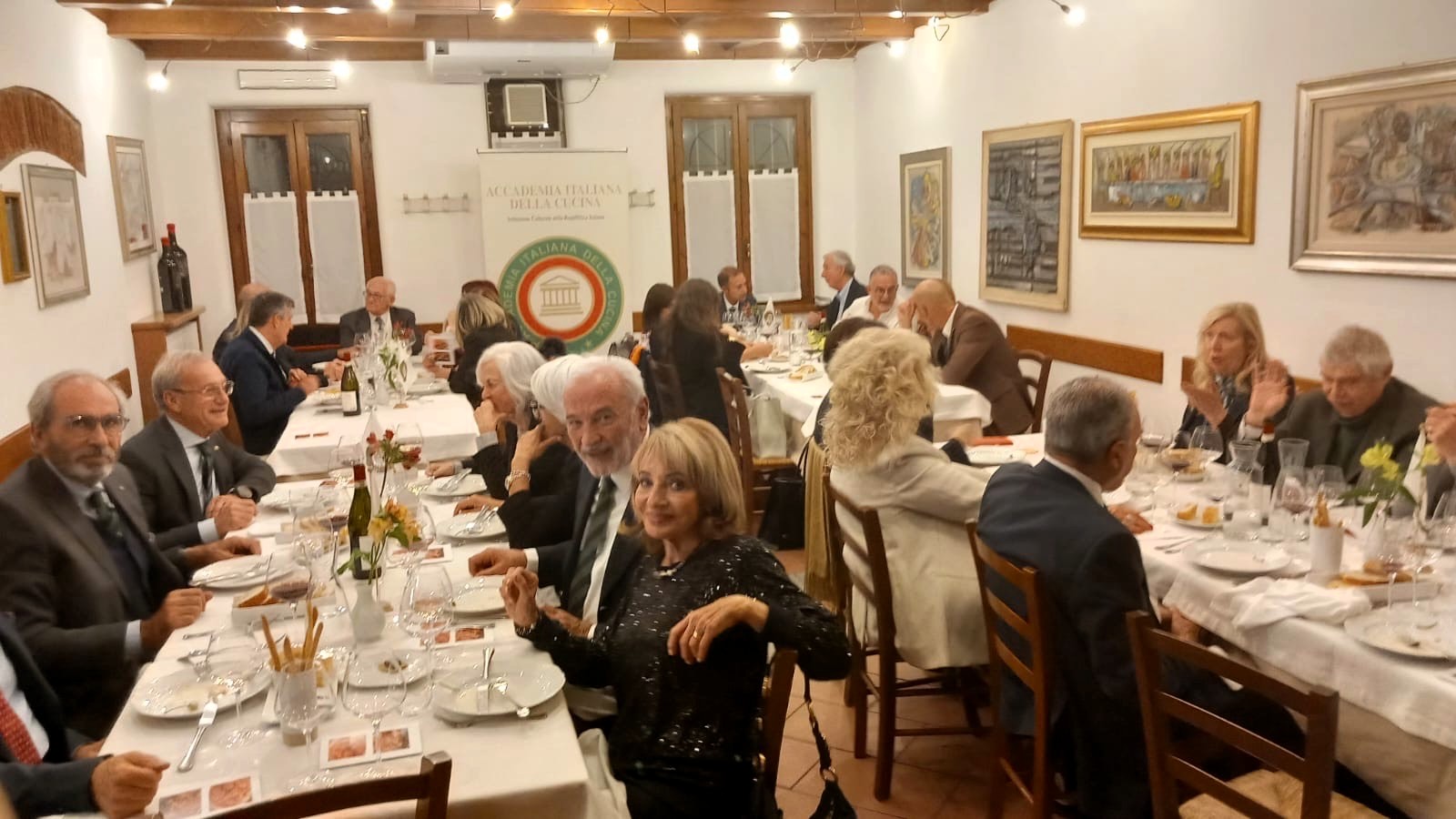 In occasione della cena ecumenica, il Delegato di Roma Eur-Ostiense, Claudio Nacca, ha consegnato il Diploma di Buona Cucina ai fratelli Ennio, Francesco e Marina Mariani, quinta generazione alla guida dello storico locale "Checchino dal 1887", mentre in sala si affaccia già la sesta con i figli di Marina e Francesco. Il riconoscimento premia l’eccellente cucina di Ennio e la custodia della tradizione romanesca, legata alle carni e al celebre quinto quarto: la leggenda vuole che proprio qui sia nata la coda alla vaccinara, creata agli inizi del Novecento dalla bisnonna Fermina. L’ambiente celebra la romanità con il soffitto a botte, gli arredi storici e le stampe originali di Pinelli, donate ai genitori dei fratelli Mariani da Giuseppe Ceccarelli, giornalista nonché primo Delegato dell’Accademia Italiana della Cucina di Roma. Checchino, quindi, è anche la casa della Delegazione romana sin dalla sua fondazione, oltre settant’anni fa. Per questo la Delegazione Roma Eur-Ostiense, competente per territorio, ha voluto condividere la cena ecumenica 2025 con la Delegazione di Roma. Durante la serata, il Delegato di Roma, Giuseppe Florio, ha consegnato i diplomi per i quarant’anni di appartenenza agli Accademici Paolo Basili e Francesco Ricciardi, accolti da calorosi applausi. La Direttrice del CST di Roma, Silvia De Vincentiis, ha infine illustrato il volume dedicato al tema ecumenico dell’anno: “Gli arrosti, gli umidi e i bolliti nella cucina della tradizione regionale”, con un approfondimento sulla Città metropolitana di Roma.