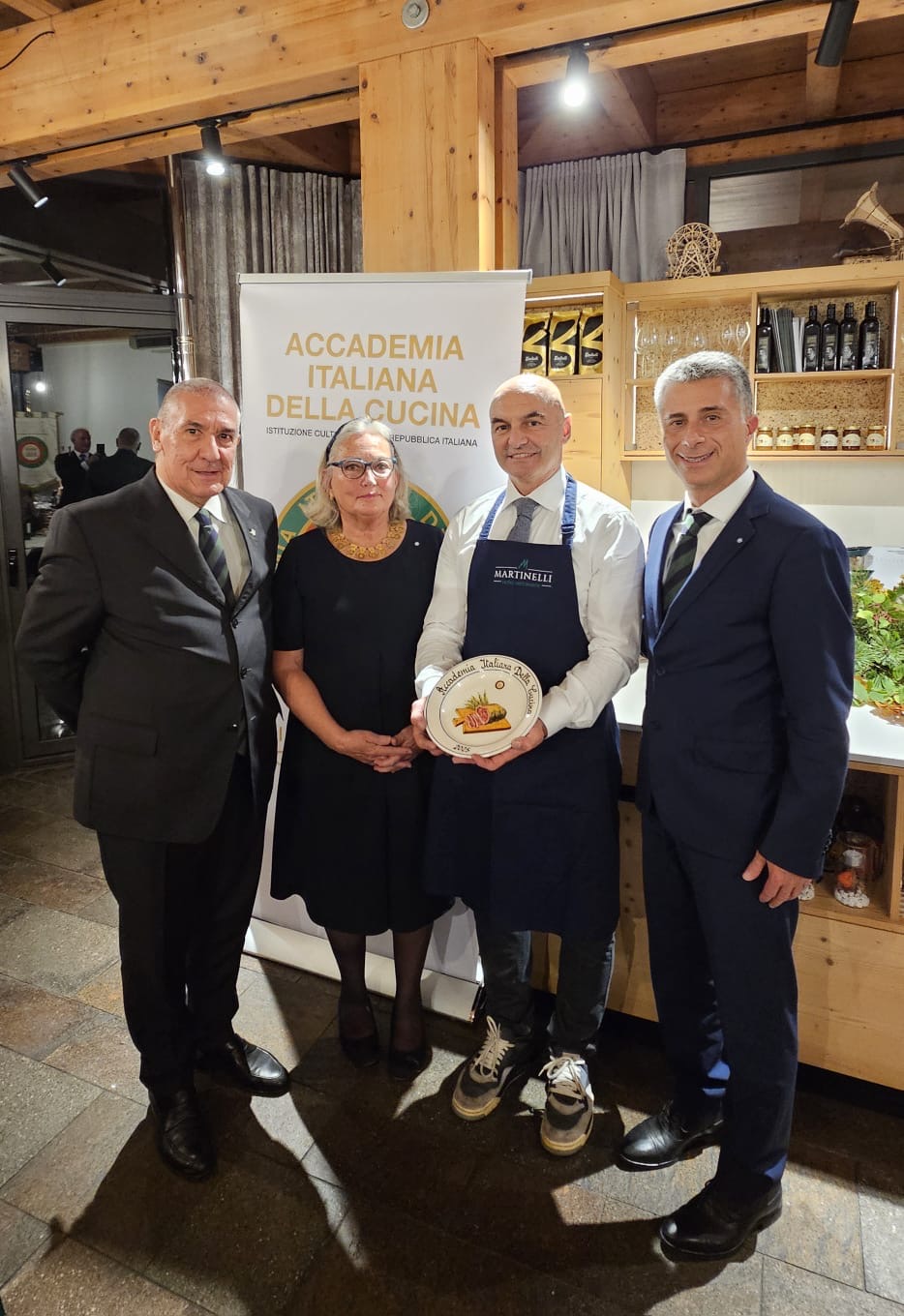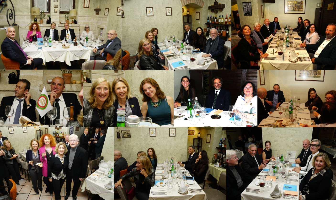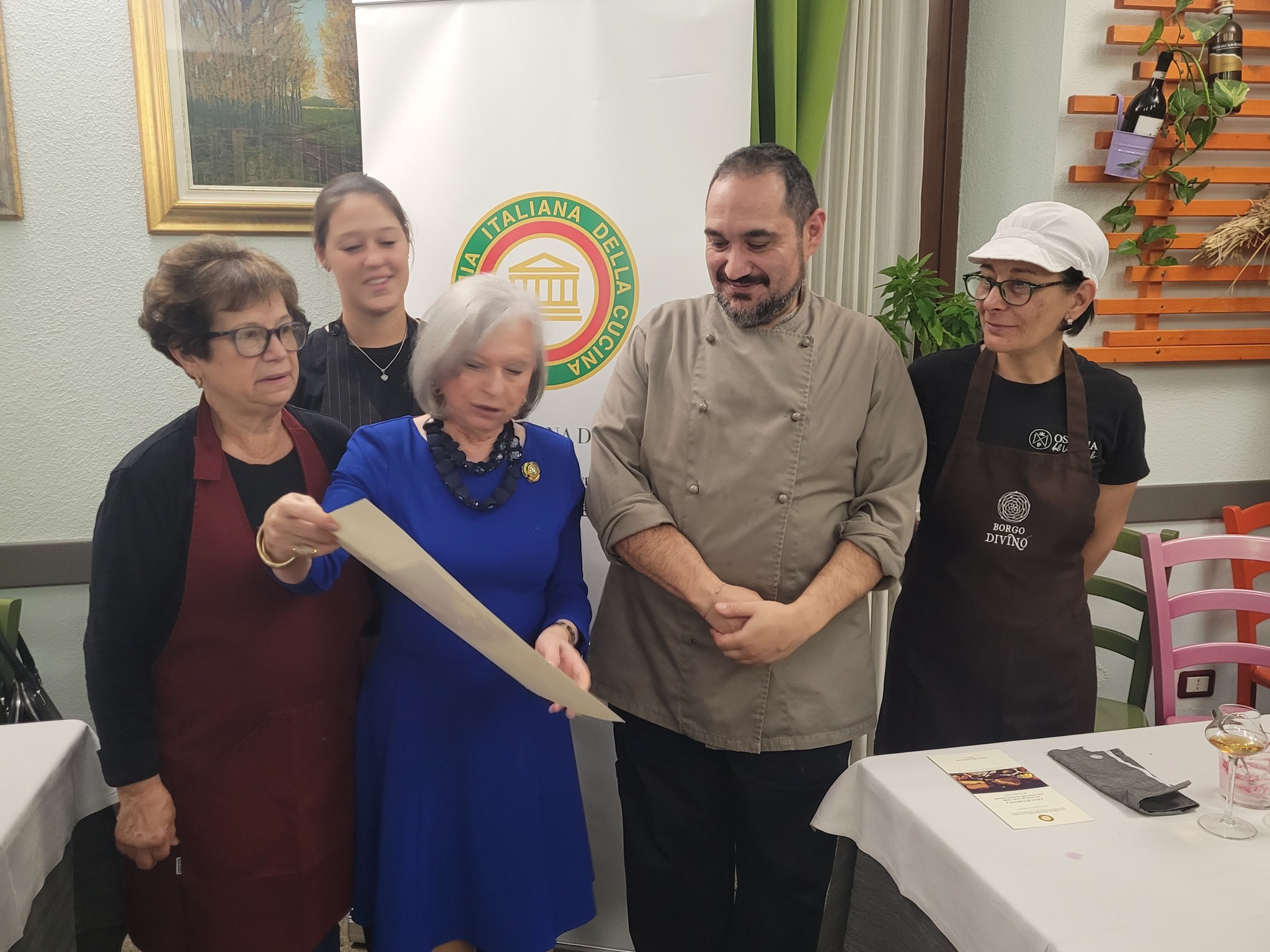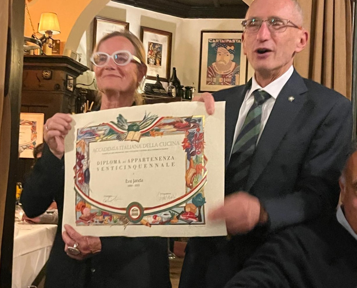 In occasione della cena ecumenica, il Delegato di Roma Eur-Ostiense, Claudio Nacca, ha consegnato il Diploma di Buona Cucina ai fratelli Ennio, Francesco e Marina Mariani, quinta generazione alla guida dello storico locale "Checchino dal 1887", mentre in sala si affaccia già la sesta con i figli di Marina e Francesco. Il riconoscimento premia l’eccellente cucina di Ennio e la custodia della tradizione romanesca, legata alle carni e al celebre quinto quarto: la leggenda vuole che proprio qui sia nata la coda alla vaccinara, creata agli inizi del Novecento dalla bisnonna Fermina. L’ambiente celebra la romanità con il soffitto a botte, gli arredi storici e le stampe originali di Pinelli, donate ai genitori dei fratelli Mariani da Giuseppe Ceccarelli, giornalista nonché primo Delegato dell’Accademia Italiana della Cucina di Roma. Checchino, quindi, è anche la casa della Delegazione romana sin dalla sua fondazione, oltre settant’anni fa. Per questo la Delegazione Roma Eur-Ostiense, competente per territorio, ha voluto condividere la cena ecumenica 2025 con la Delegazione di Roma. Durante la serata, il Delegato di Roma, Giuseppe Florio, ha consegnato i diplomi per i quarant’anni di appartenenza agli Accademici Paolo Basili e Francesco Ricciardi, accolti da calorosi applausi. La Direttrice del CST di Roma, Silvia De Vincentiis, ha infine illustrato il volume dedicato al tema ecumenico dell’anno: “Gli arrosti, gli umidi e i bolliti nella cucina della tradizione regionale”, con un approfondimento sulla Città metropolitana di Roma.