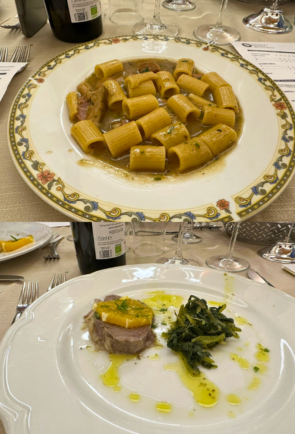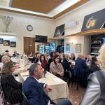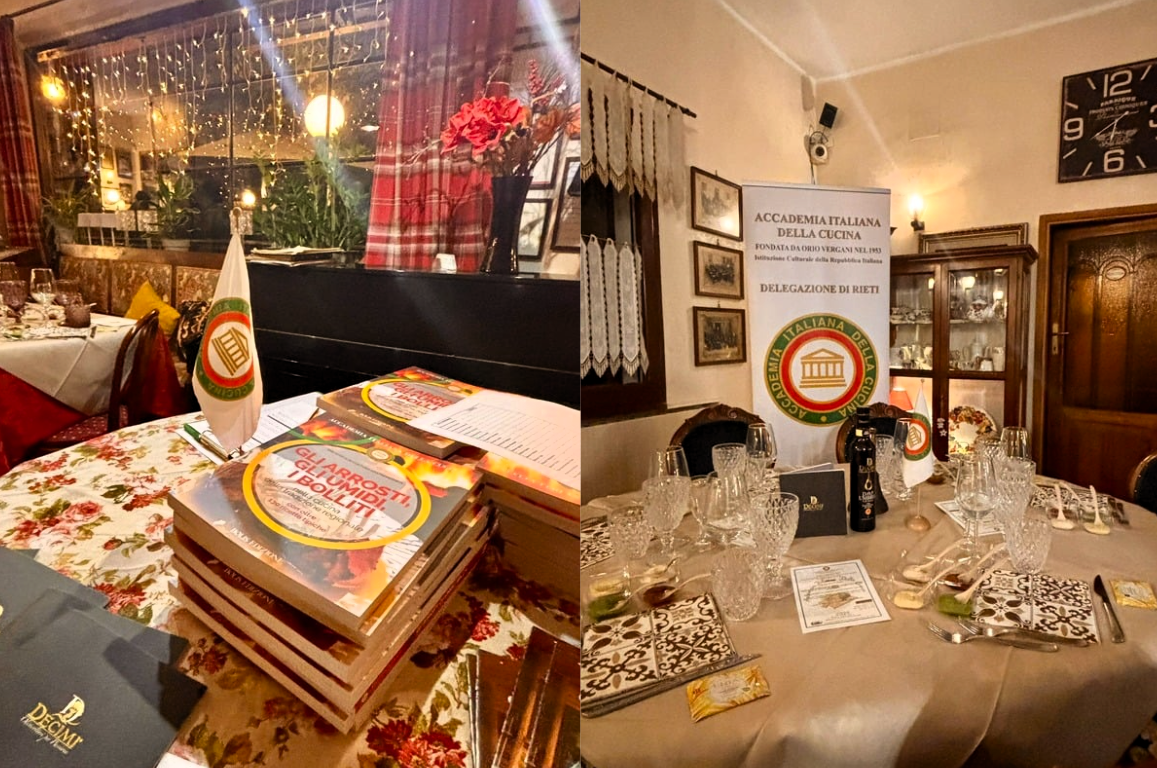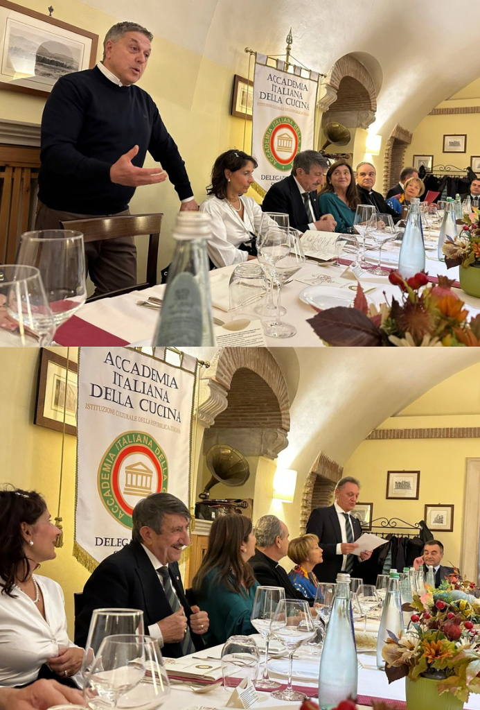 La tradizionale cena ecumenica della Delegazione reatina si è svolta alla trattoria “La Palazzina” di Rieti. Dopo i saluti del Delegato Francesco Maria Palomba e la presentazione del menu nella veste di Simposiarca, l’Accademica Valeria Lettera ha tenuto un intervento culturale. I vini sono stati illustrati da Enrico Maria Concutelli, responsabile di area della Cantina Casale del Giglio. Tra i partecipanti: il Prefetto di Rieti Pinuccia Niglio, il Colonnello Valerio Marra, il Colonnello Gianluca Ferraro e il Dr. Michele Tota, Vice Questore Vicario. Dopo l’aperitivo di polpettine fritte di “allesso”, i partecipanti hanno degustato le porchette PAT di Selci (Giorgio Giorgini), Poggio Bustone (Oreste Battisti) e Cantalice (Enzo Crosti), accompagnate da una giardiniera e da altre preparazioni della chef Oksana Pidhorodetska, eccellente interprete della cucina reatina. Il menù comprendeva polenta in umido con spuntature, salsicce, polpettine e pancetta; “allesso” di gallina, lingua, cotechino, muscolo e biancostato con varie salse; zampetti con salsa verde; patate lesse e fagiolini; e crostata di mele cotogne secondo la ricetta di Bartolomeo Scappi. In abbinamento, i vini di Casale del Giglio.