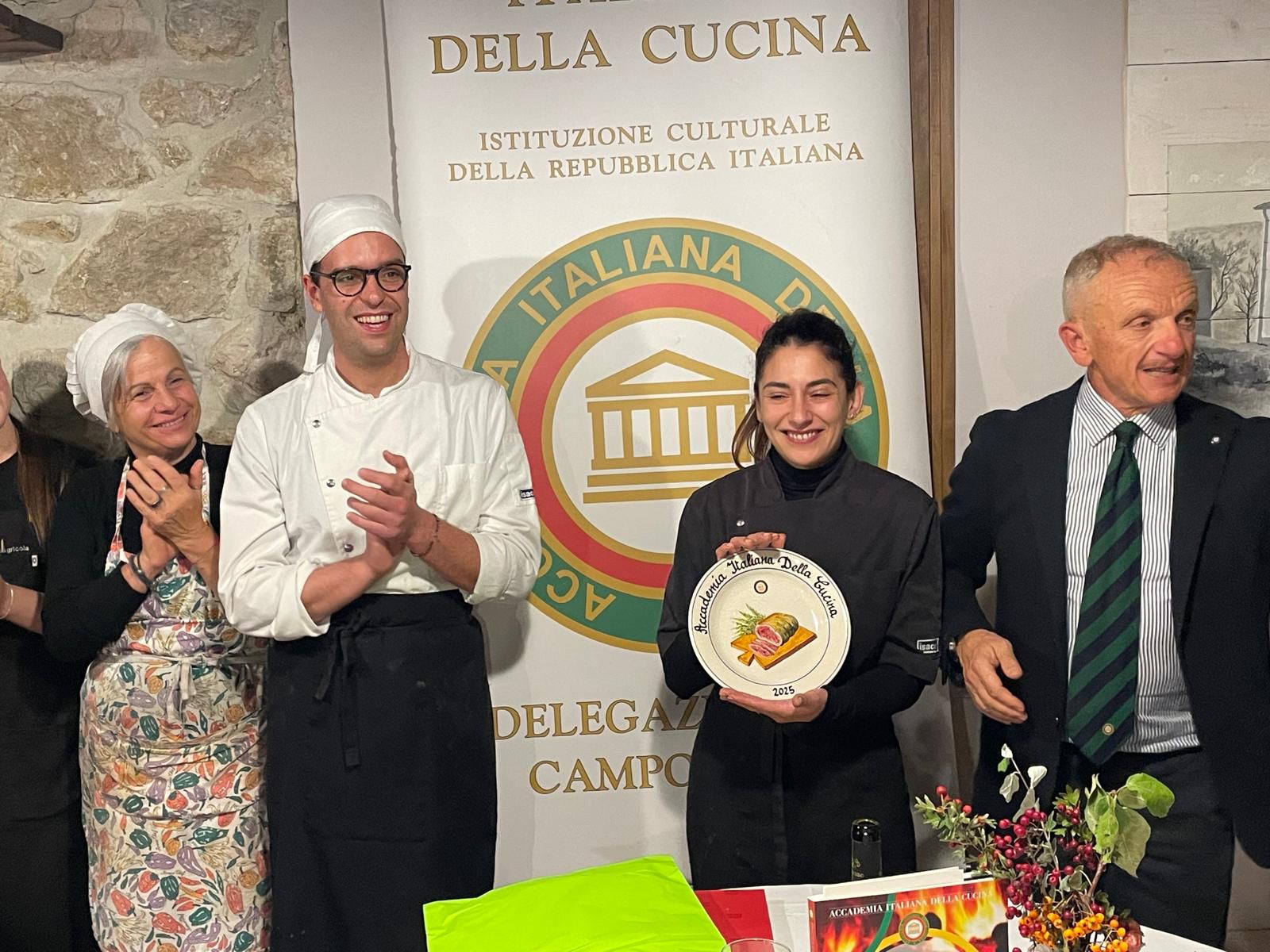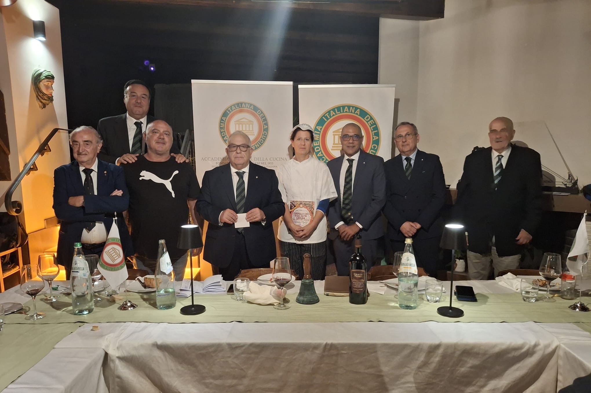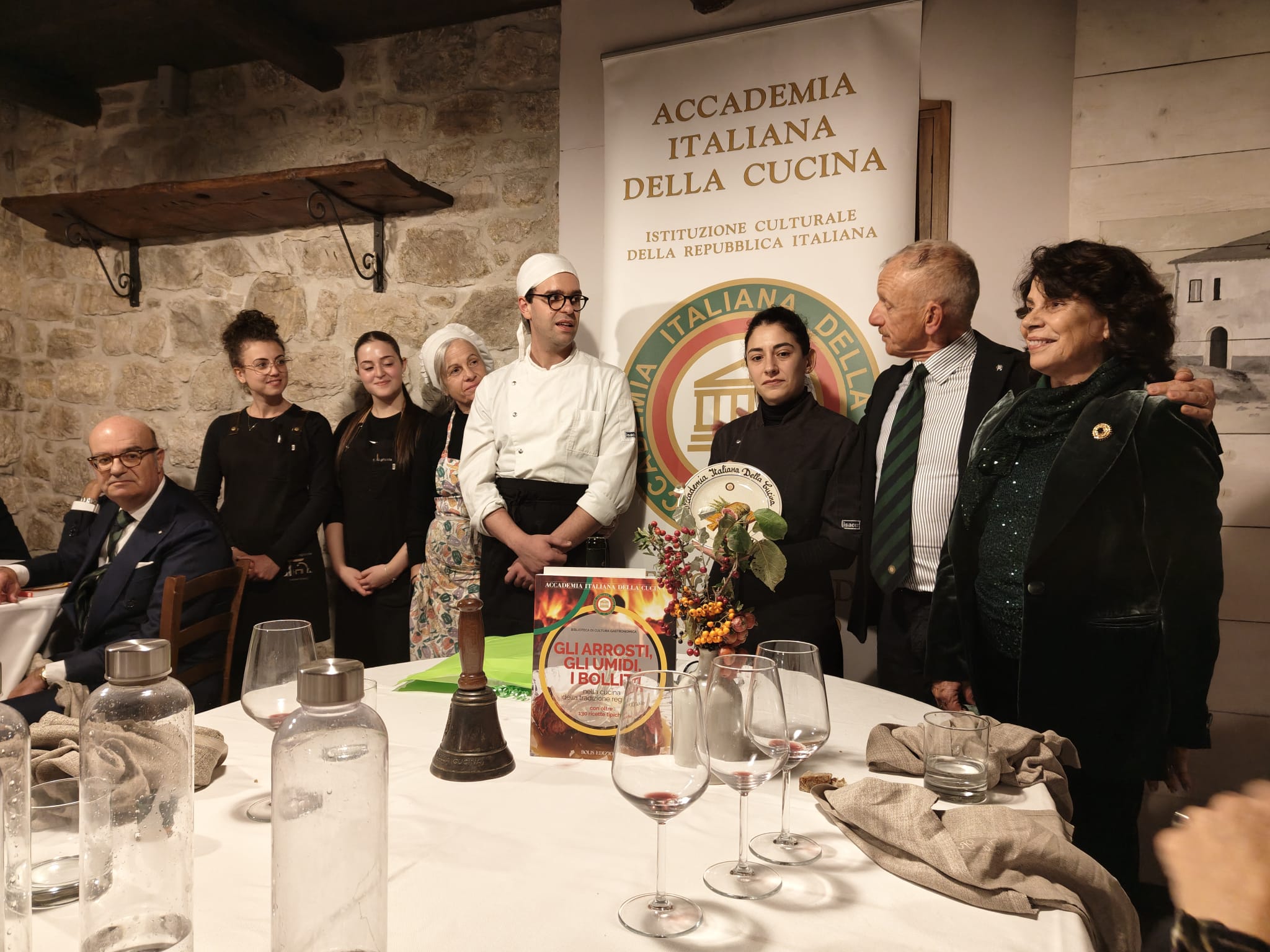La Delegazione di Campobasso, guidata dal Delegato Ernesto Di Pietro, si è riunita per la celebrazione della cena ecumenica presso l’Agriturismo “Taberna Agricola” di Fossalto. Dopo il saluto iniziale, in un clima di amicizia e allegria, la Simposiarca Ernestina Simeone ha presentato il tema gastronomico dell’anno: “Gli arrosti, gli umidi, i bolliti nella cucina della tradizione regionale”. Nel suo intervento ha ripercorso la storia dell’uso della carne, dalle fonti storiche dell’Inchiesta Murattiana del 1811 fino ai giorni nostri. Alle 20.30, al suono della campana, il Delegato ha dato inizio al convivio nella confortevole sala dell’agriturismo. Il menu, curato con maestria dalla brigata di cucina, ha valorizzato i prodotti del territorio e la stagionalità autunnale, proponendo piatti tipici molisani: pizza e minestra con verdure spontanee, pallotte cace e ova in brodo allo zafferano, fagottino di crepes con ricotta e funghi porcini su fonduta di caciocavallo, agnello mollicato su letto di cicoria campestre. Al termine, il Delegato e la Simposiarca hanno chiamato Federica Ciarmela, chef e proprietaria del locale, insieme al suo staff, per consegnarle il “piatto dell’anno”. La serata si è conclusa con il suono della campana e l’applauso degli Accademici, soddisfatti per un incontro conviviale piacevole ed interessante dal punto di vista gastronomico e culturale.