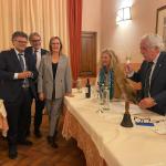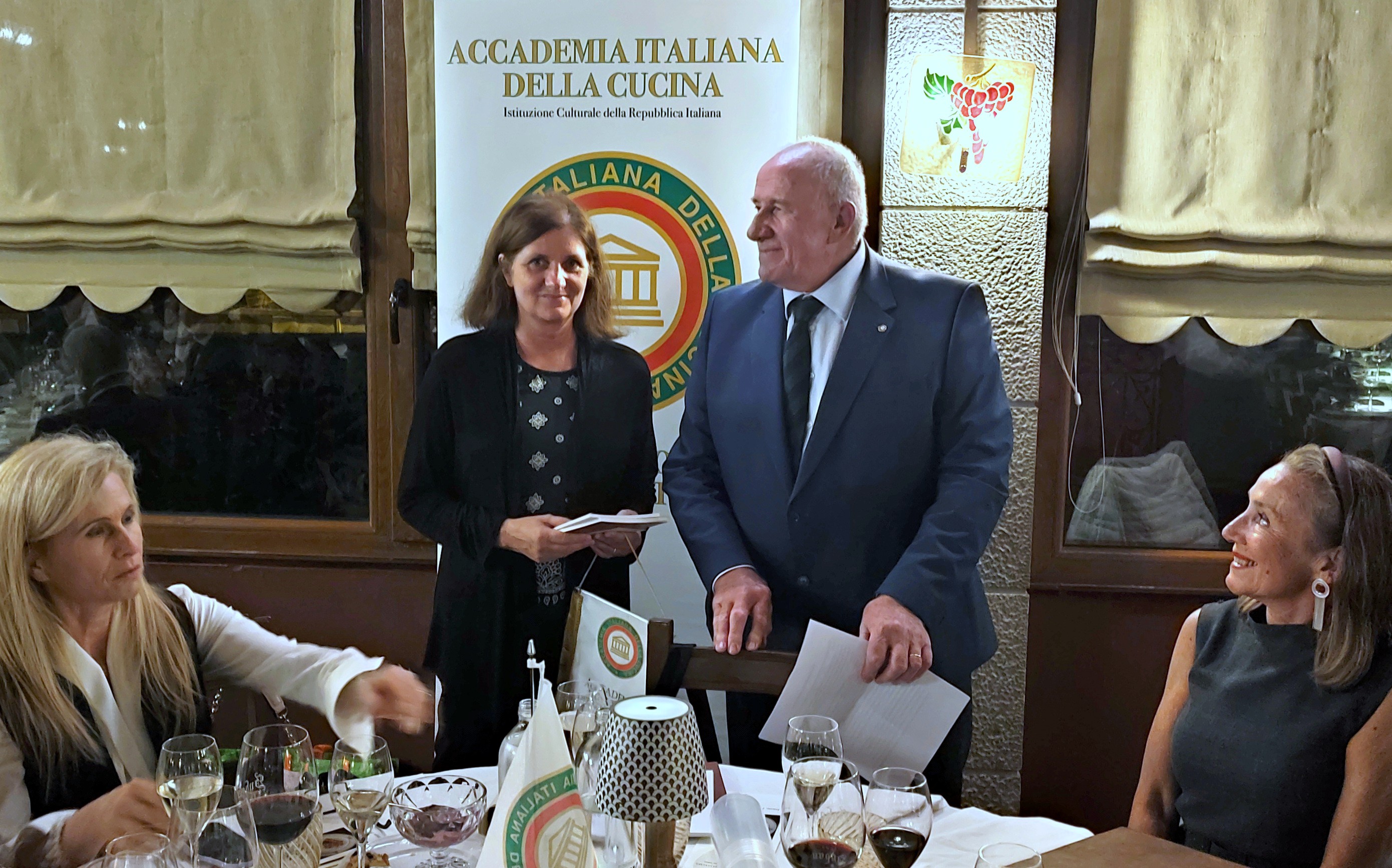 La Cena Ecumenica della Delegazione di Monaco di Baviera si è svolta in un clima di grande convivialità presso l’Osteria Italiana, il più antico ristorante italiano ancora attivo in Germania, fondato nel 1890. Durante la serata sono stati consegnati due riconoscimenti: l’Attestato di Benemerenza a Beppe Cannici, per i quarant’anni di appartenenza all’Accademia, e il Diploma di Appartenenza venticinquennale ad Eva Janda. Entrambi hanno espresso gratitudine verso l’istituzione e gli altri membri, sottolineando il ruolo dell’Accademia nella diffusione della cultura gastronomica italiana. Stephanie Deiters, Simposiarca dell’evento, insieme al gestore Prisco De Stefano e allo chef Umberto Bressanin, ha sviluppato il tema dell’anno proponendo un bollito misto servito al carrello, accompagnato da salse preparate in cucina. Il menù, aperto e concluso da portate dai sapori autunnali e da un primo dedicato alle carni arrosto, ha ottenuto grande apprezzamento, anche per la scenografia del bollito e la preparazione a vista dello zabaione. L’abbinamento dei vini e l’eccellente servizio di sala hanno completato la serata.