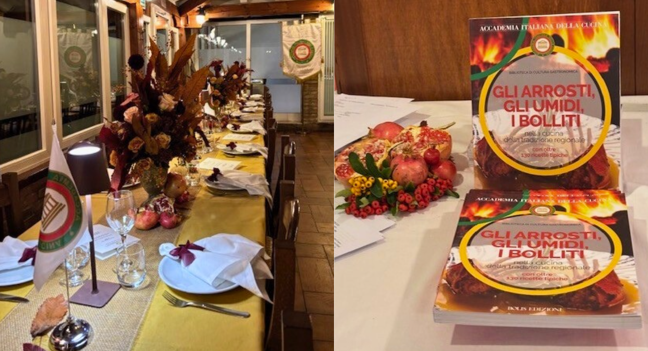 Splendida Cena Ecumenica 2025 dedicata ad "Arrosti, Umidi e Bolliti" presso il ristorante modenese La Bianca, da sempre rinomato per i suoi carrelli colmi dei classici bolliti della tradizione. Dopo un’entrée di tortellini in brodo di cappone, servita “per aprire lo stomaco al pasto”, gli Accademici hanno potuto scegliere tra i vari tagli: manzo, lingua, testina, zampone, cotechino, cappello del prete, accompagnati dai tradizionali purè di patate e spinaci. I fagioli in umido con le cotenne, proposti come omaggio al tema dell’anno, si sono rivelati di una bontà squisita. Augusto Ascari, rappresentante della Delegazione nel Centro Studi Territoriale Emilia, ha presentato la pubblicazione 2025 dedicata all’argomento, seguita dalla distribuzione del volume a cura di Marco Righi. Il padrone di casa Giuseppe Tartarini, anima de La Bianca, ha voluto rendere omaggio al tema servendo anche la sua celebre arista di maiale arrosto con patate al forno, piatto “espresso” richiesto dal Delegato e Simposiarca della serata Mario Baraldi. Un delizioso gelato di crema con amarene ha concluso una Cena Ecumenica da ricordare. Nel saluto finale, il Delegato ha ricordato l’impegno dell’Accademia Italiana della Cucina nel sostenere la candidatura della Cucina Italiana a patrimonio immateriale dell’UNESCO.