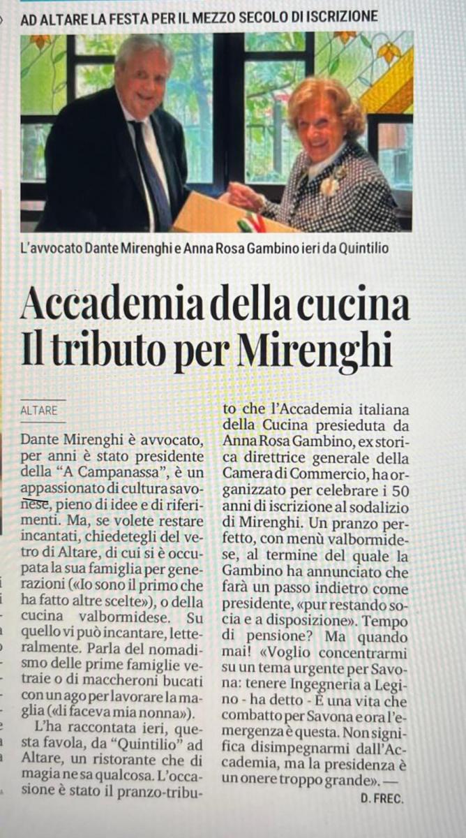 Delegazione Riviera dei Fiori: festeggiato i 50 anni di appartenenza dell'Accademico Mirenghi