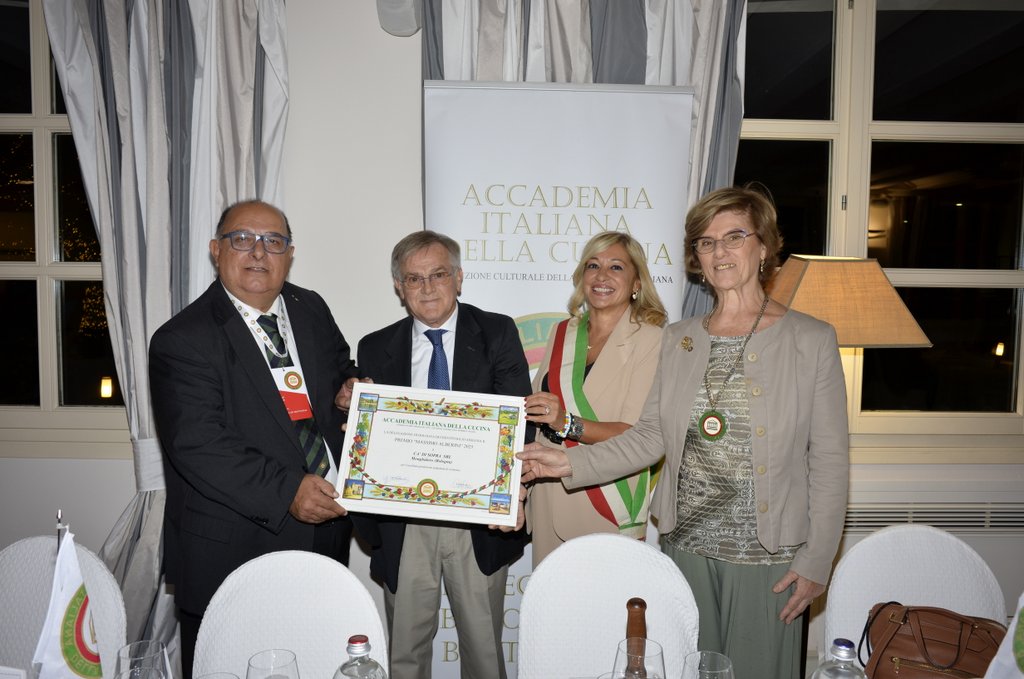 Il Ristorante Valfiore di S. Lazzaro di Savena (BO) ha ospitato la Cena Ecumenica in elegante sala riservata, aperta sul parco che circonda la struttura. Il tema dell’anno, “Arrosti, umidi e bolliti” è stato sviluppato dalla relazione “L’Emilia e i piaceri della carne” tenuta dalla Simposiarca Rosanna Scipioni, vice Delegata e direttrice del Centro Studi Territoriale Emilia, che ha toccato vari aspetti della cultura delle carni nei tempi, dalla Mesopotamia di 3800 anni fa alla “virilità alimentare” di Carlo Magno, al significato sociale delle carni utilizzate in Emilia tra la fine del Medioevo e i primi secoli dell’età moderna, al valore dell’arrosto nella cucina del Settecento e del Novecento. Per il menu la Simposiarca ha scelto piatti rappresentativi di diversi contesti territoriali dell’Emilia, da Bologna a Parma, e delle tre tipologie di preparazione indicate nel tema dell’anno. Il Delegato Mauro Taddia ha consegnato il Premio Massimo Alberini a Ubaldo Salomoni, titolare dell’attività Cà di Sopra di Monghidoro, alla presenza del Sindaco Barbara Panzacchi. Il premio è stato assegnato per la lavorazione artigianale di cereali e frutti antichi del territorio appenninico tosco-emiliano, in produzione biologica certificata e con trasformazione in prodotti tipici della tradizione locale. Il Delegato ha inoltre accolto un nuovo Accademico e ha consegnato al ristorante, già insignito del Diploma di Buona Cucina, la vetrofania dell’anno in corso.