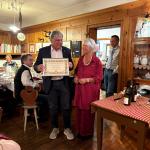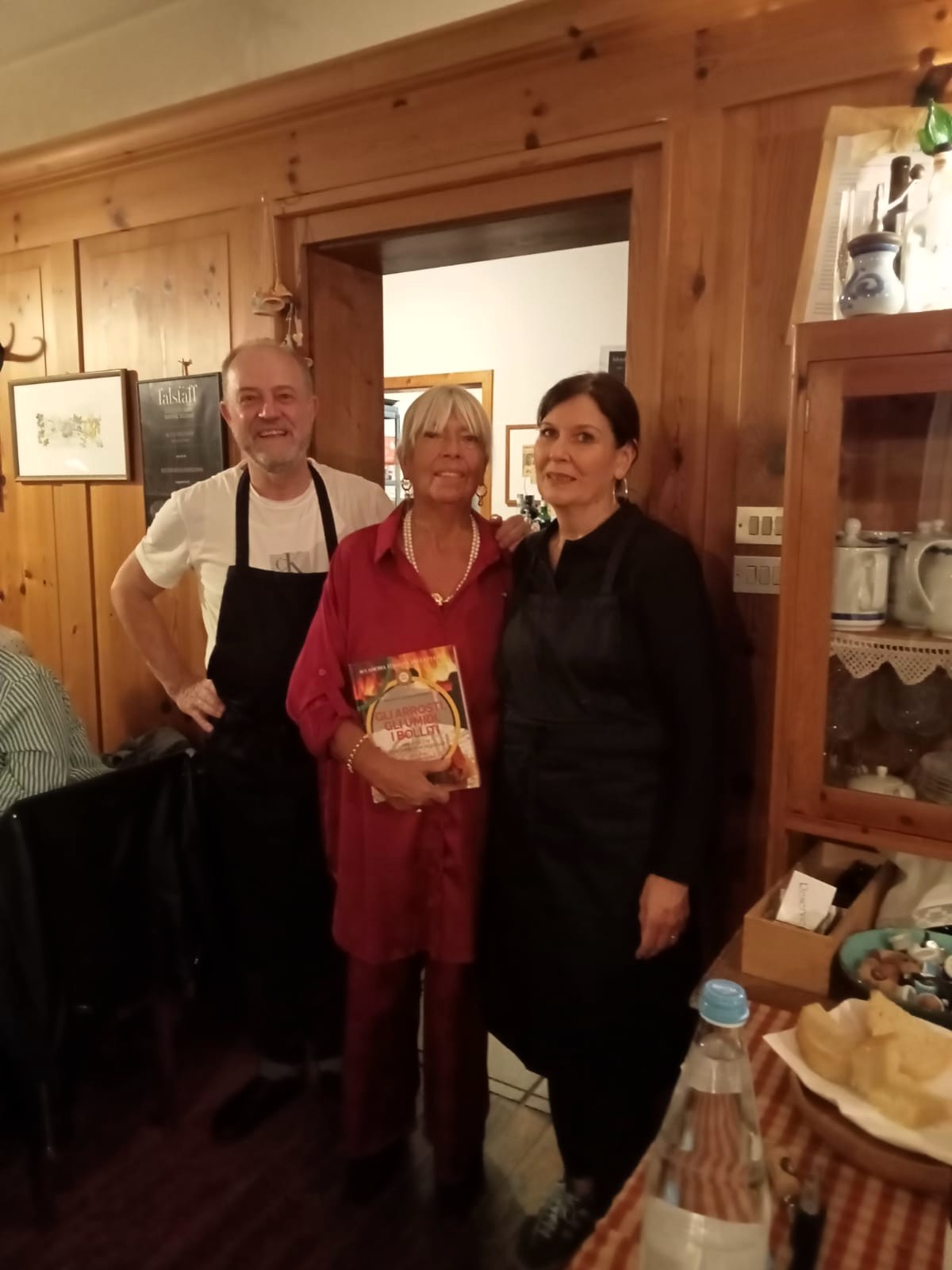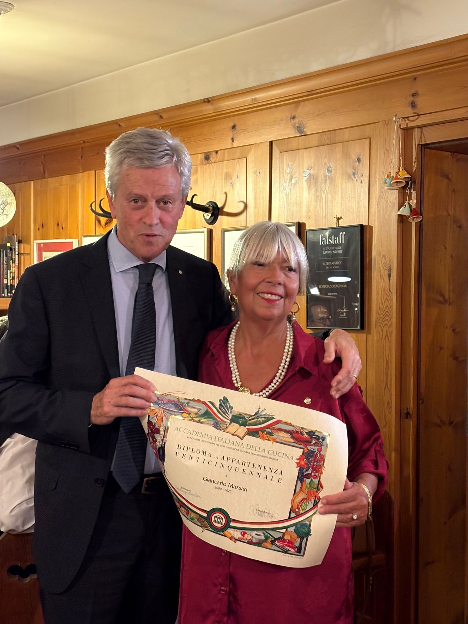 Riuscitissima conviviale ecumenica sul tema “Gli arrosti, gli umidi, i bolliti” alla Trattoria Vecchio Faust di Fiè allo Sciliar, che è uno dei ristoranti della Buona Tavola. Martha Fink ha accolto i presenti assieme al marito Gerhard nella sala da pranzo che sembra quella di una casa privata, tanto l’ambiente è caldo ed accogliente, e poi ha deliziato tutti con la sua meravigliosa cucina che riprende le ricette della nonna. Molto buoni ed accattivanti gli antipasti serviti a tavola come finger food, buone i tirtelen (frittelle) ed il formaggio grigio, degno di nota il sanguinaccio fatto come mousse con le mele. Eccezionale la crema di castagne. Morbidissimo lo stinco di vitello cotto al forno per sei ore a bassa temperatura e servito con le buone verdure, in particolare la zucca al forno. Squisita la mousse di castagne, leggeri e croccanti i krapfen, ottima anche la torta di mele. Durante la cena sono stati illustrati i piatti della tradizione inerenti al tema ecumenico. Non ci sarebbe stata serata migliore per consegnare i diplomi di 25 anni di appartenenza all’Accademia a Giancarlo Massari (foro 1) e di addirittura 40 anni a Paolo Pantozzi (foto 2). Alla fine con i ringraziamenti è stato consegnato a Martha e Gerhard libro “Gli arrosti, gli umidi, i bolliti” (foto 3).