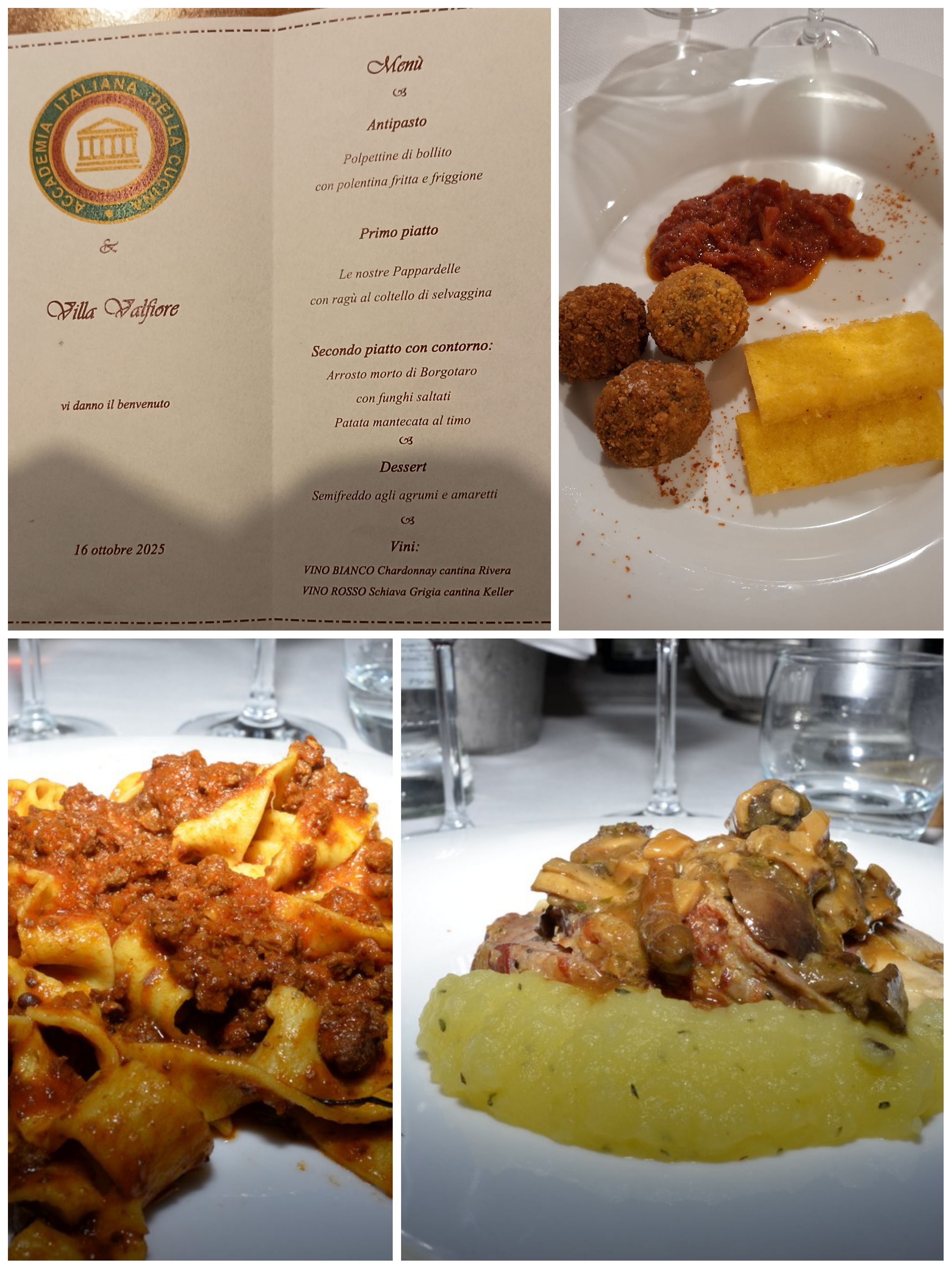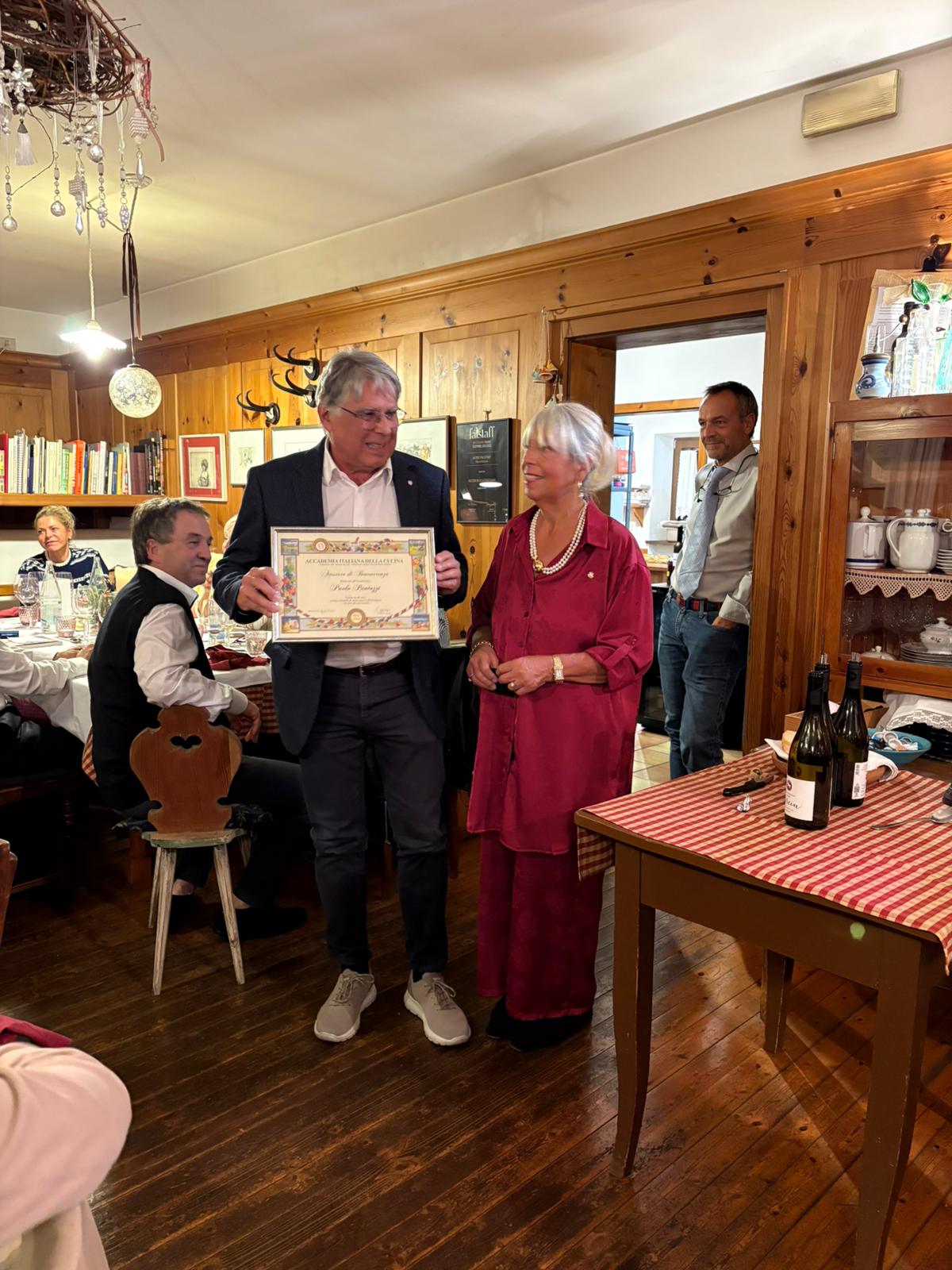La Cena Ecumenica della Delegazione di Monaco di Baviera si è svolta in un clima di grande convivialità presso l’Osteria Italiana, il più antico ristorante italiano ancora attivo in Germania, fondato nel 1890. Durante la serata sono stati consegnati due riconoscimenti: l’Attestato di Benemerenza a Beppe Cannici, per i quarant’anni di appartenenza all’Accademia, e il Diploma di Appartenenza venticinquennale ad Eva Janda. Entrambi hanno espresso gratitudine verso l’istituzione e gli altri membri, sottolineando il ruolo dell’Accademia nella diffusione della cultura gastronomica italiana. Stephanie Deiters, Simposiarca dell’evento, insieme al gestore Prisco De Stefano e allo chef Umberto Bressanin, ha sviluppato il tema dell’anno proponendo un bollito misto servito al carrello, accompagnato da salse preparate in cucina. Il menù, aperto e concluso da portate dai sapori autunnali e da un primo dedicato alle carni arrosto, ha ottenuto grande apprezzamento, anche per la scenografia del bollito e la preparazione a vista dello zabaione. L’abbinamento dei vini e l’eccellente servizio di sala hanno completato la serata.