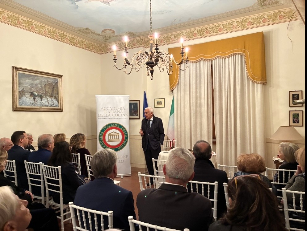 L’interessante tema della Conviviale Ecumenica ha esaltato le indubbie abilità di Graziano Cattaneo, veterano degli chef a Budapest ed importante punto di riferimento della identità gastronomica italiana nel Paese. Alla presenza del neo Ambasciatore S.E. Giuseppe Scognamiglio e di un buon numero di Accademici e ospiti, il Simposiarca Vice Delegato Maria Carmela Gaetani Aronica ha gestito l’evento in maniera impeccabile. Attenta e meticolosa, ha declinato con chiarezza espositiva le varie portate del menu, risultato di altissima qualità per sapiente combinazione di gusti e sapori tradizionali. Relatore il Delegato e unanime il giudizio di apprezzamento anche per l’ottimo servizio e gli eccellenti vini serviti.