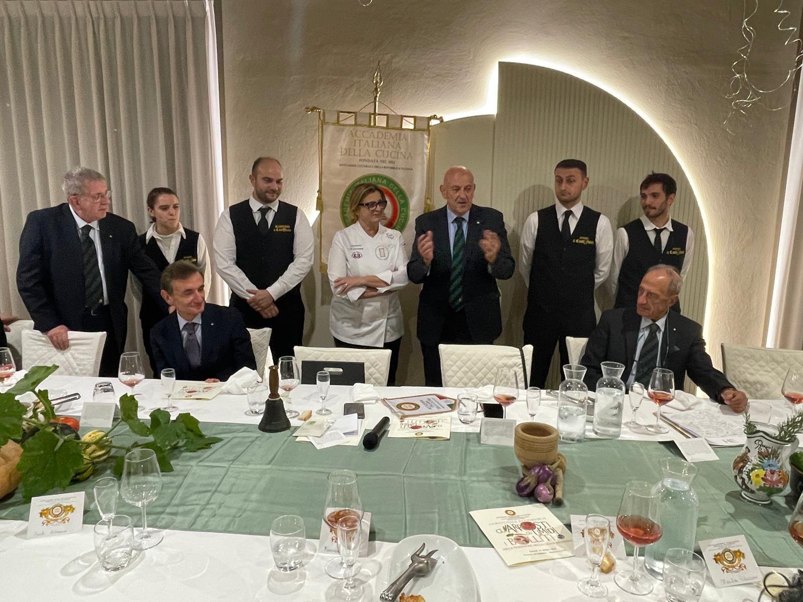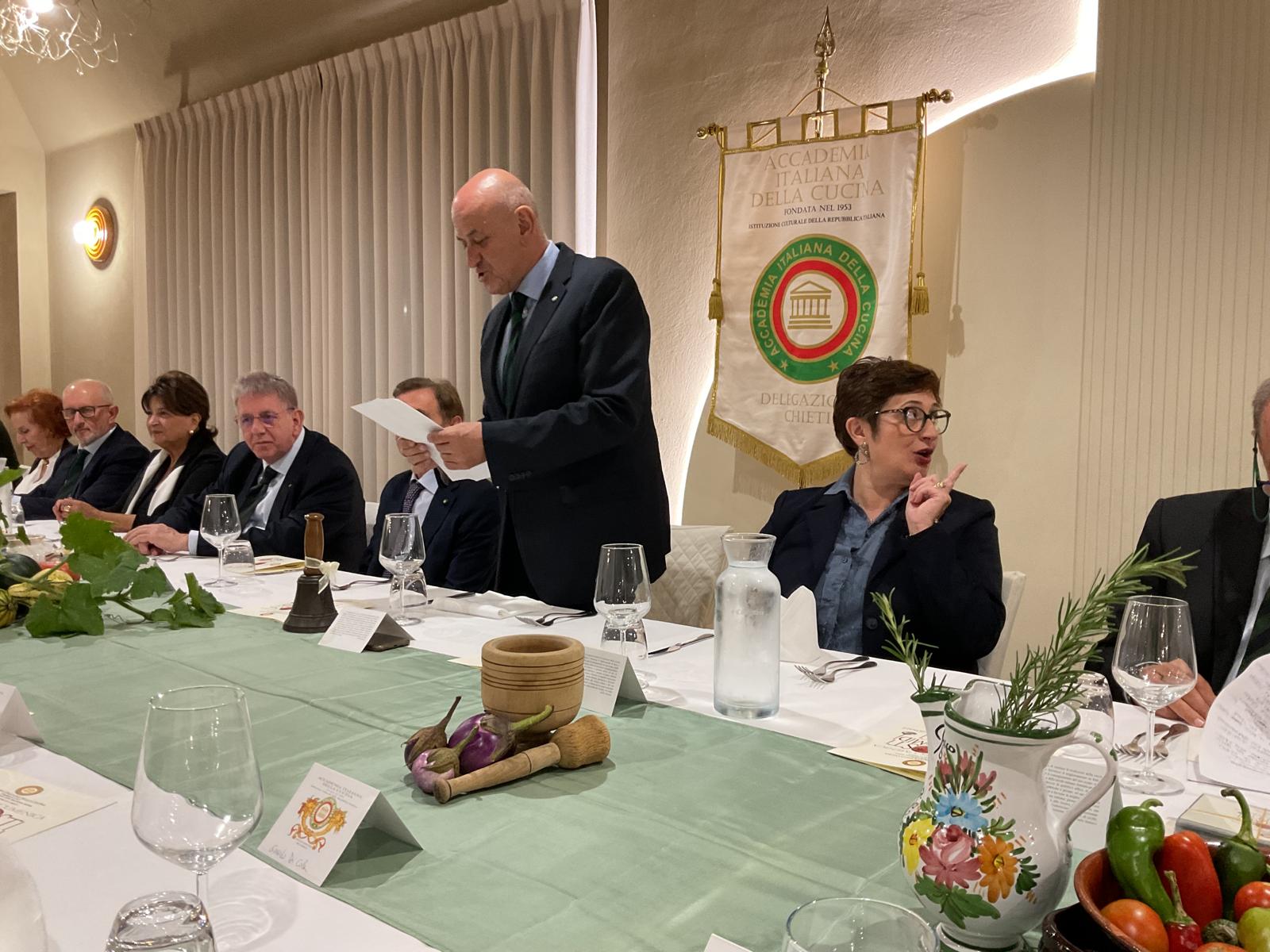 Un’occasione di ripasso e di crescita culturale per gli ospiti presenti: questo è stato, in sintesi, lo spirito della Conviviale Ecumenica 2025 nella Delegazione di Chieti. Gli Accademici si sono riuniti presso il ristorante “Il Casolare” di Miglianico, insignito proprio quest’anno dall’Accademia del “Diploma di Buona Cucina”. Durante la serata hanno potuto ascoltare la dotta relazione del Direttore del Centro Studi Territoriale, Maurizio Adezio, il quale, presentando il volume relativo al tema scelto per il 2025, ha chiarito i termini arrosto, bollito, umido, fricassea, salmì, brasato, stracotto, stufato, spezzatino e civet, collocando così nella giusta dimensione ogni riferimento alle preparazioni culinarie che la chef Antonina Di Giacomo ha dedicato all’ecumenica, sapientemente selezionate dal Simposiarca Rocco Del Conte. La serata è risultata gradevole e di alto livello, tecnico e culturale, impreziosita dalla presenza del prefetto di Chieti, Gaetano Cupello.