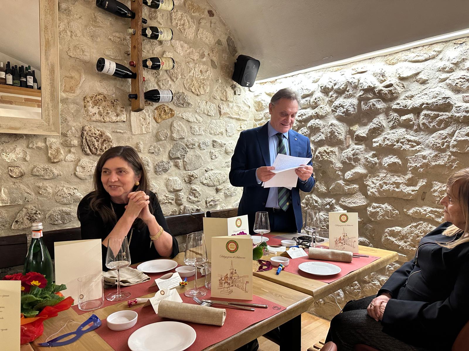 La riunione conviviale di apertura dell’anno 2026, dedicata a “Il mare di Puglia tra tradizione e innovazione”, si è svolta a Cerignola presso il ristorante “La Volpe & l’Uva”. Ha introdotto la serata il Delegato e Simposiarca Valerio Antonio Vinelli, il quale ha parlato del riconoscimento UNESCO alla Cucina italiana ed ha precisato che lo stesso è stato promosso e sostenuto prevalentemente dalla nostra Associazione. Ha, quindi, illustrato le caratteristiche del locale e il menu della serata. Molto apprezzato l’intervento del Coordinatore Territoriale Puglia Nord e Delegato di Bari Vincenzo Rizzi, che ha offerto una riflessione sul ruolo dell’Accademia e degli Accademici come custodi e difensori della cucina, fornendo spunti di grande interesse anche per i nuovi soci e gli ospiti presenti. Il menu ha raccontato l’Adriatico pugliese con equilibrio e tecnica: riso, patate e cozze in chiave contemporanea; seppia con grana di pane e tartufo nero dei Monti Dauni; risotto al datterino giallo con gambero rosso crudo e cotto; tubettini in brodetto di cozze e vongole; pescatrice in guazzetto e cannolo di pane raffermo con ricotta e amarene. Il ristorante, sorto nel 2011, erede del mitico “Bagatto”, è condotto dal titolare Beppe D’Agostino, coadiuvato dalla moglie Miriam Sforza, chef unitamente allo storico chef Luigi Oratore. A conclusione della serata, il Delegato ha consegnato ai coniugi Beppe e Miriam la vetrofania dell’Accademia e il guidoncino della Delegazione di Foggia, quale apprezzamento per il loro operato.
