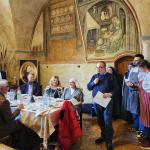 La Delegazione ha organizzato la cena ecumenica presso la Foresteria di Casa Zonin 1821 a Gambellara, sede dell’omonima cantina vinicola. Il menù, illustrato con immagini della location, era accompagnato da uno studio del Delegato – Simposiarca per l’occasione – dedicato al tema dell’anno: la carne arrosto, bollita e in umido, con storia, curiosità e un approfondimento sul dipinto del Veronese “Le nozze di Cana” (1563). La serata si è aperta con un aperitivo di finger food ispirati al tema, comprendente stracotto di manzo su polentina, nervetti in insalata con cipolla di Tropea caramellata, cotechino con zabaione salato, faraona arrosto con melograno e crema di zucca e tartellette con tacchino al vapore in spuma al Marsala e miele. Dopo l’introduzione del Delegato dei piatti a base di carne arrosto, bollita ed in umido nella tradizione veneta e vicentina, il consultore Roberto Garzaro ha illustrato i piatti e i vini abbinati, insieme al sommelier di Casa Zonin. Il menù della cena prevedeva, come primo piatto, una zuppa di trippe alla veneta; come secondo, una guancetta di vitello brasata ai funghi porcini con verdurine di stagione; e, per concludere, un dessert composto da tortino alle nocciole con cuore morbido, salsa alle amarene e parfait alla vaniglia. A conclusione, il cuoco Diego e il personale di sala sono stati elogiati per l’ottima riuscita dell’evento e omaggiati con il menù e il libretto tematico redatto dal Delegato.