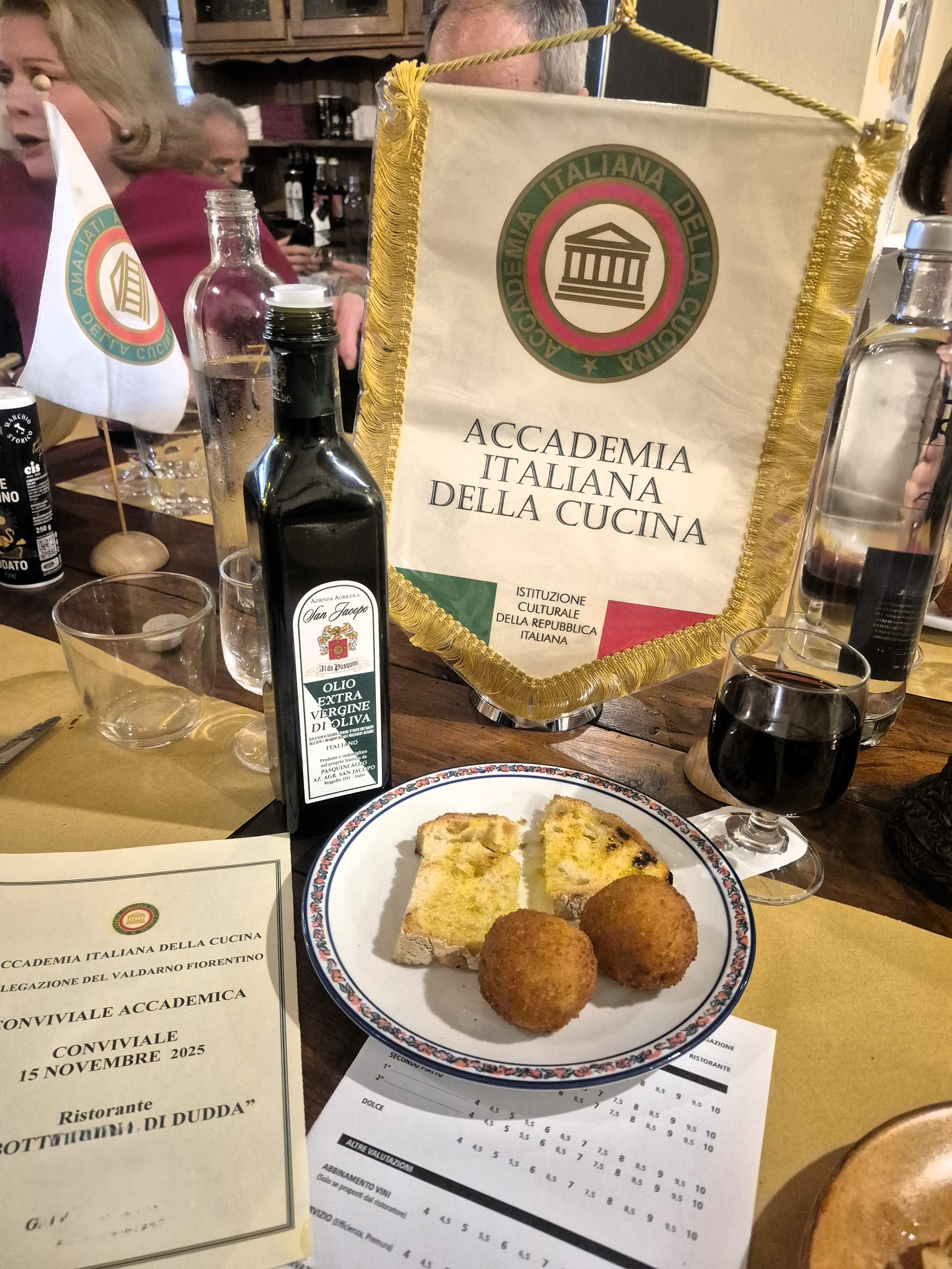 La riunione conviviale di novembre del Valdarno Fiorentino si è tenuta alla Botteghina di Dudda, organizzata dal Simposiarca Max Ferranti. Tipica trattoria nel cuore del Chianti, è caratteristica per l'ambiente familiare e le pietanze semplici, genuine e molto gustose. Per il pranzo sono stati serviti come antipasti: polpettine all’orientale, la fettunta con olio novo; il primo, la specialità della casa, spaghetti alla mollica; il secondo, fritto misto della nonna e per finire la torta della nonna. Gli Accademici sono rimasti colpiti dalla semplicità dei piatti ma nello stesso tempo dal loro sapore deciso e originale. La cuoca, signora Francesca Golino, ha salutato i commensali, elargendo anche alcuni piccoli segreti e suggerimenti sulle ricette proposte, tra gli applausi generali.