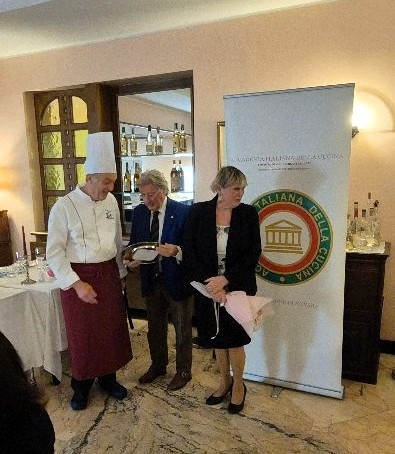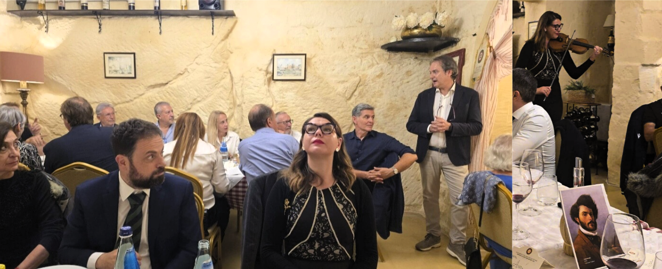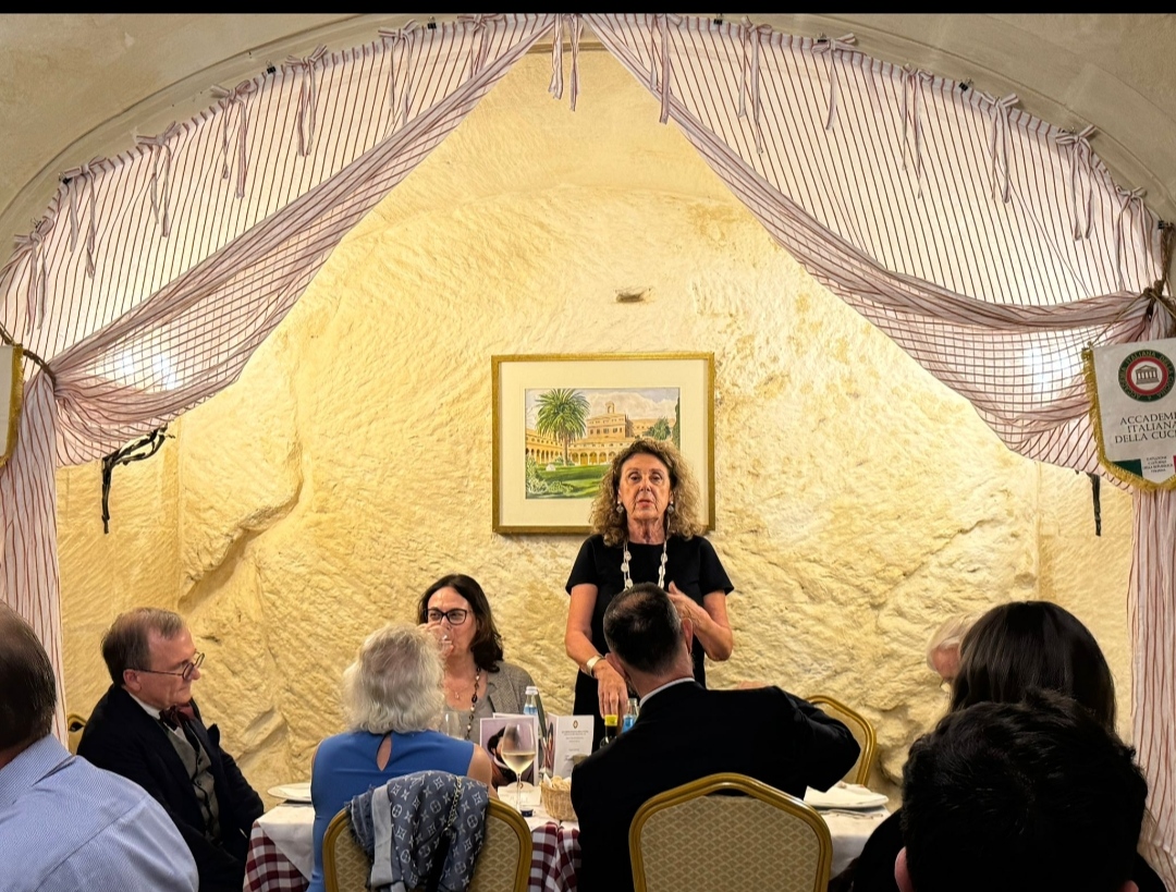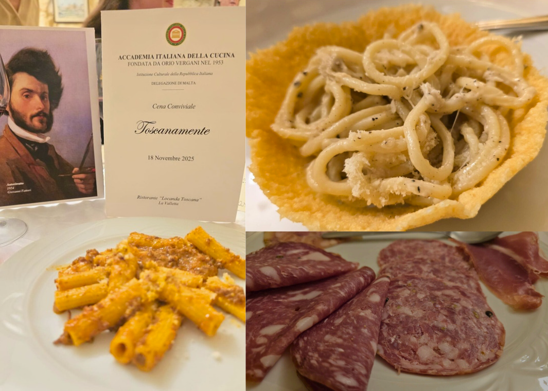 La riunione conviviale di novembre si è svolta alla “Locanda Toscana” nel cuore di Valletta, con un menu tipico dell’omonima regione e materie prime italiane di grande qualità. Il ristorante è gestito da Giulia e Andrea Gentili: lei ai fornelli, lui in sala a raccontare storie sui piatti. Mentre viene servito il tagliere, Andrea parla di una cucina povera ma “degna della tavola di un re”, come la pappa al pomodoro, nata per recuperare il pane “sciocco” citato da Dante. Racconta dei salumi della Val d’Orcia, della cinta senese, del pecorino di Pienza prodotto da pecore sarde che pascolano su terreni argillosi. Con i pici fatti a mano e la cacio e pepe nel cestino di parmigiano ha riportato i presenti ai tempi degli etruschi, mentre il cinghiale alla maremmana richiamava antiche scene di caccia. Presente l’ambasciatrice S.E. Valentina Setta, che ha apprezzato lo spirito della serata, animata dall’ironico intermezzo dell’Accademico Giovanni Costantino, ispirato a “Toscano per caso” di Giammaria Vassallo. La serata si è chiusa sulle note di “Volare”, suonate al violino da Snizhana Lityahina, con un sentito grazie a Giulia e Andrea per l’accoglienza.