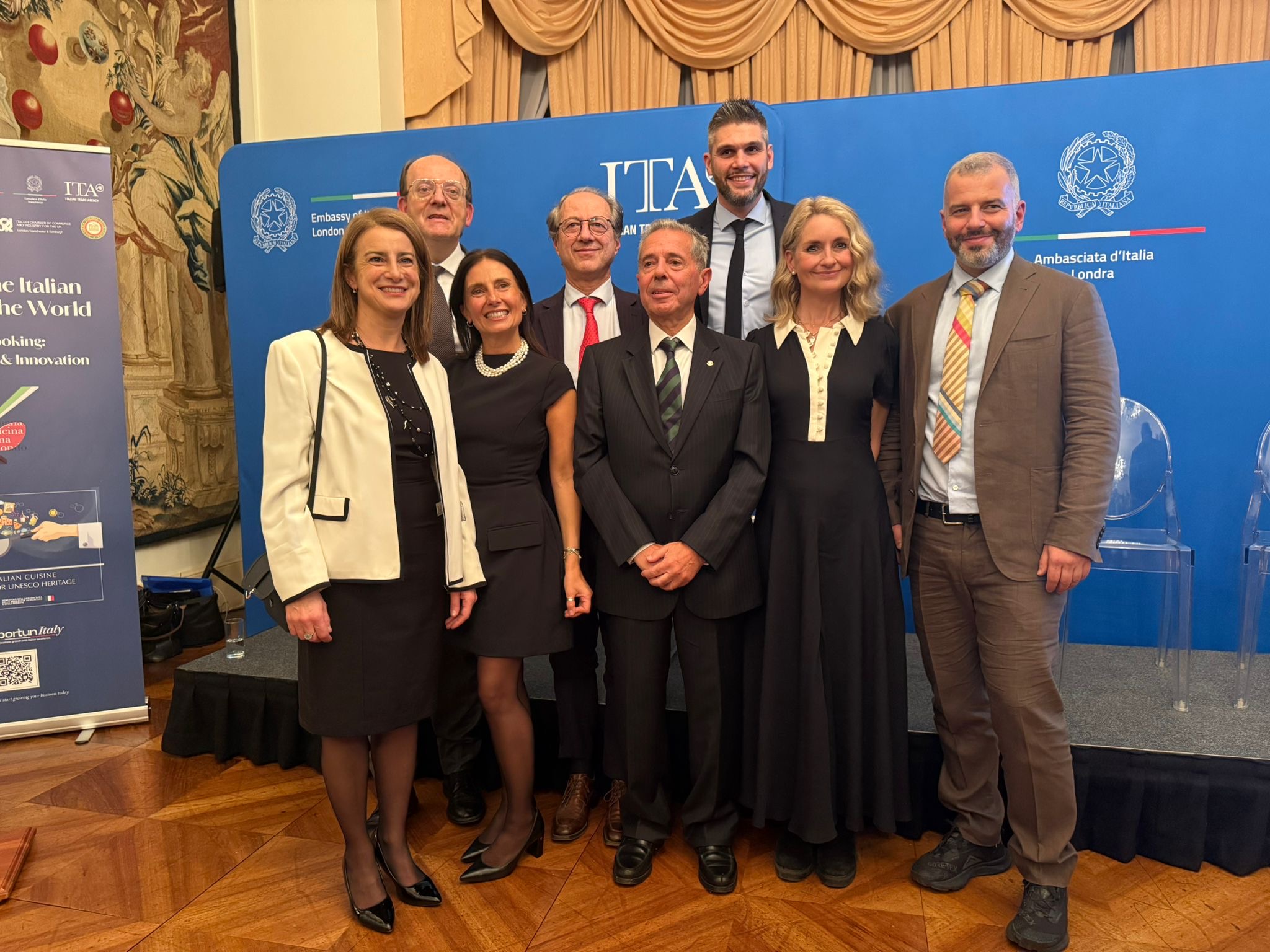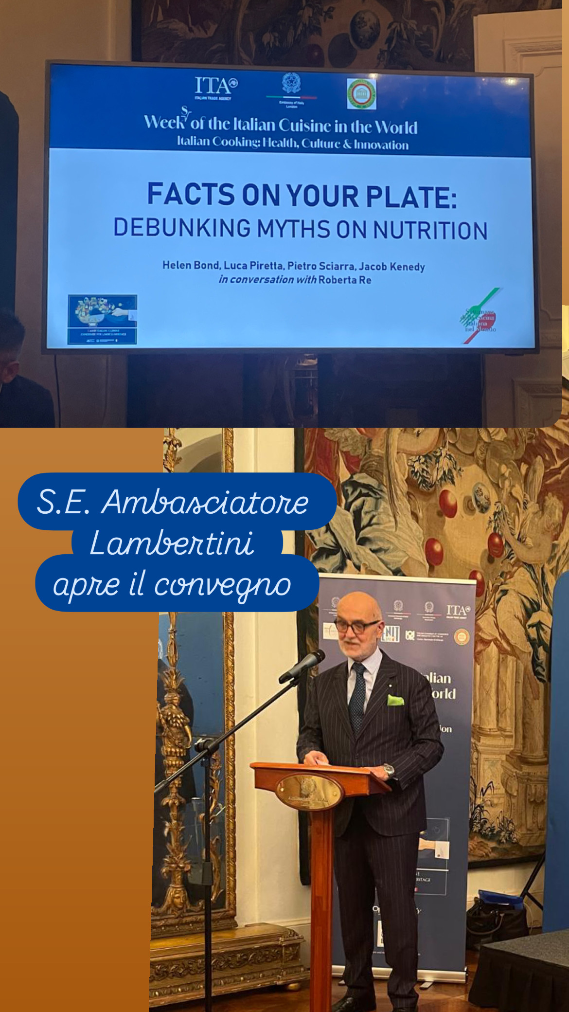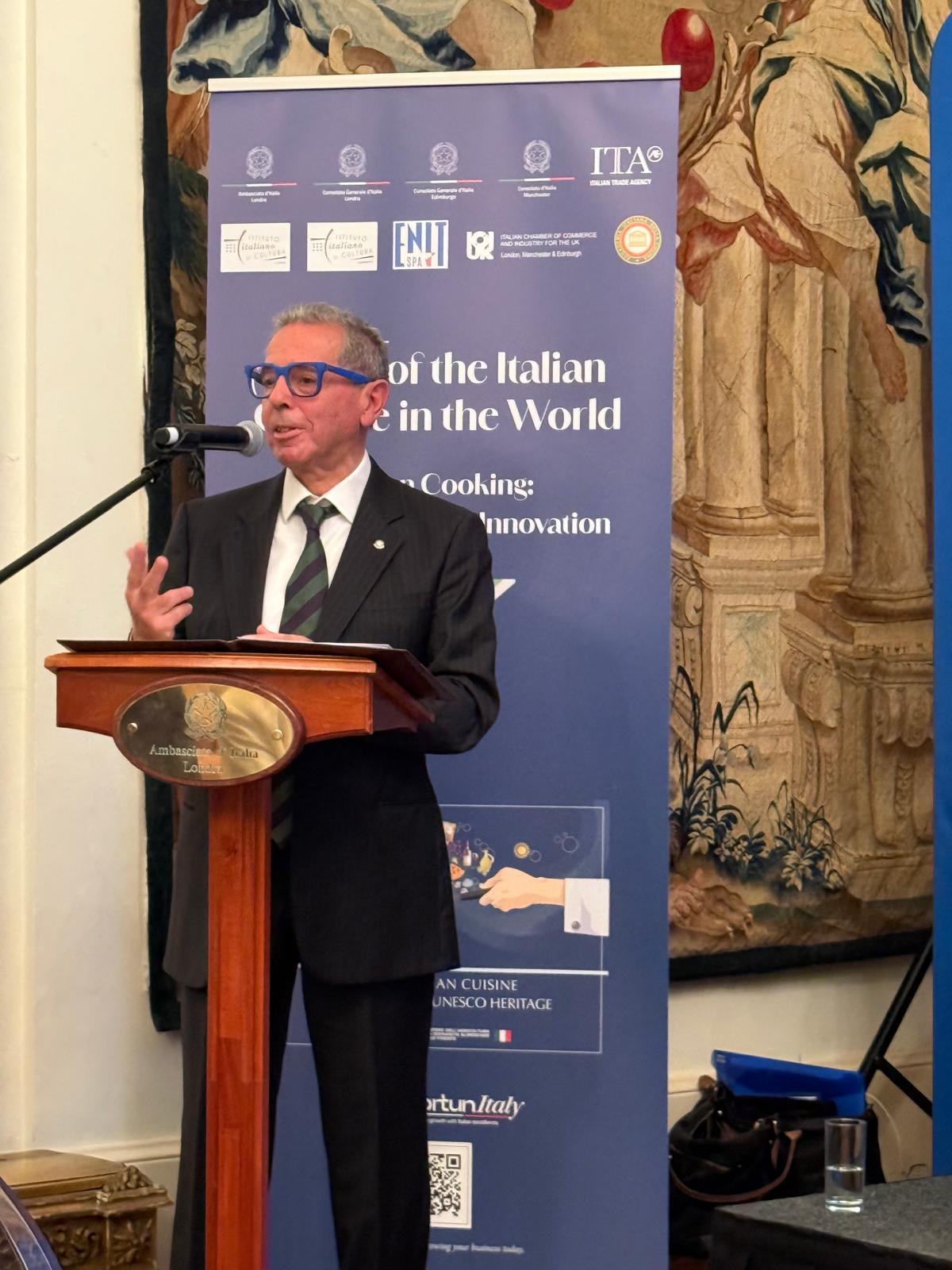 In occasione del quarantennale della Delegazione e della 10ª Settimana della Cucina Italiana nel Mondo, negli eleganti saloni dell’Ambasciata d’Italia si è svolto il convegno “I falsi miti della catena alimentare e della nutrizione” (Facts on your plate: debunking myths on nutrition). Organizzato dalla Delegazione con l’Ufficio Politiche Agricole dell’Ambasciata, diretto da Gabriella Manfredi, e con ITA/ICE guidato da Giovanni Sacchi (Accademico Onorario), ha riunito circa 150 ospiti. L’Ambasciatore, S.E. Inigo Lambertini, anch’egli Accademico Onorario, ha aperto l’evento elogiando il ruolo dell’Accademia. Dopo gli interventi di Manfredi e Sacchi, sono seguite le relazioni della dietologa Helen Bond, del gastroenterologo Luca Piretta, di Pietro Sciarra di De Cecco e dello chef Jacob Kennedy. Con la moderazione di Roberta Re del Cambridge Food Institute, si è discusso di proprietà degli alimenti, fake news su carne rossa, corretto consumo di pasta e della frequente confusione tra allergie e intolleranze. Centrale il richiamo a moderazione e varietà come base di una dieta equilibrata. Nel suo intervento conclusivo, il Delegato ha ringraziato Consulta e Accademici, ribadendo l’impegno dell’Accademia nell’educazione alimentare dei giovani, dal volume Storia della cucina italiana a fumetti, tradotto in otto lingue anche grazie al Ministero degli Esteri, alle iniziative rivolte alle scuole, luogo chiave per sviluppare corrette abitudini alimentari. Ha inoltre richiamato il valore culturale della cucina italiana e la candidatura a patrimonio immateriale UNESCO, con decisione attesa il 15 dicembre a Nuova Delhi. La serata si è chiusa con un vivace dibattito e un ricevimento per celebrare il successo dell’iniziativa e i quarant’anni della Delegazione.