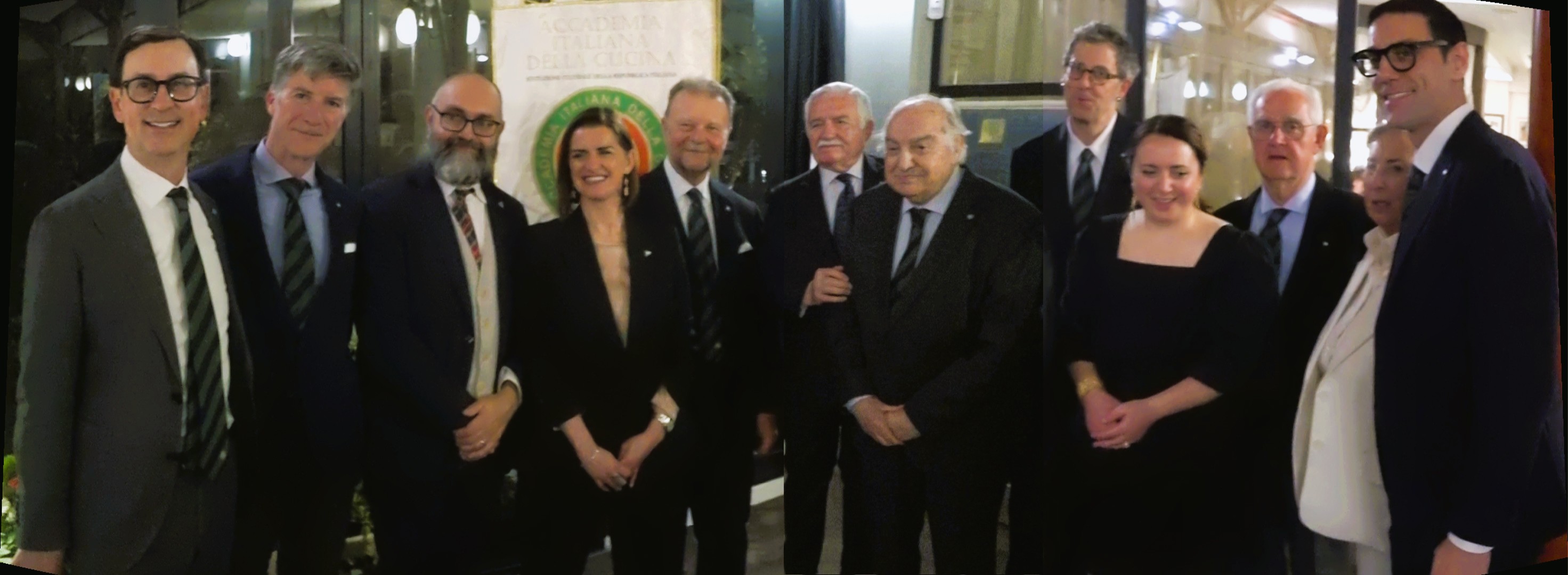 L’evento accademico per celebrare il riconoscimento UNESCO a Monaco di Baviera si è svolto alla presenza di numerosi ospiti istituzionali, tra cui il Console Generale Min. Fausto Panebianco, presente al convivio nel suo primo giorno di incarico. Tra le istituzioni intervenute figuravano l’Istituto Italiano di Cultura, la Camera di Commercio Italo-Tedesca, l’Associazione Dante Alighieri, l’Ente Nazionale del Turismo, l’Unione degli Ufficiali in Congedo, oltre ad associazioni gastronomiche tedesche, fondazioni e giornalisti. Momento centrale della celebrazione è stato l’intervento di Peter Peter, autore, giornalista e critico gastronomico, che ha ripercorso i principali riferimenti storici della cucina italiana, dalle origini antiche fino alle pubblicazioni del Novecento, soffermandosi anche sui valori culturali e conviviali legati alla tradizione della tavola. I Simposiarchi Mattia Dalla Costa e Luca Pelosi hanno presentato il menu, un connubio di portate creative e di elevata maestria in cucina, accompagnate da piatti della tradizione, piemontese in questo caso: gli agnolotti del plin e il brasato al barolo. In chiusura di serata i Simposiarchi hanno invitato ad intervenire il cuoco Mario Gamba, il quale ha reso il ristorante Acquarello un riferimento del più elevato livello della cucina italiana a Monaco, ed ha continuato a mantenere questa posizione durante 35 anni di attività.