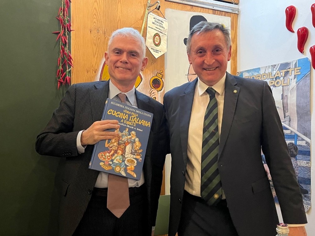 Nel cuore della Città murata di San Marino, nelle sale dell’Hotel Titano e del Ristorante La Terrazza, è stata organizzata, in collaborazione con l’Ambasciata d’Italia a San Marino, la conferenza “La Cucina Italiana Patrimonio dell’Unesco” tenuta dal professor Massimo Montanari, Accademico Onorario della Delegazione di Imola e Presidente del Comitato Scientifico che ha presentato la candidatura della cucina italiana all’UNESCO. L’evento si è concluso con un aperitivo, durante il quale è stata accolta ufficialmente la nomina del neo Accademico Guido Mattioni. A seguire, il convivio ecumenico dedicato ai piatti della tradizione, espressione dell’identità gastronomica del territorio. Presente anche il Segretario di Stato per l’Istruzione, la Cultura, l’Università, la Ricerca Scientifica e le Politiche Giovanili, Teodoro Lonfernini, che ha ringraziato la Delegazione per le iniziative volte a valorizzare la cultura della buona tavola, promuovendo tradizione, innovazione e prodotti tipici di qualità, evidenziando il ruolo delle Delegazioni quali custodi dell’autenticità dei sapori locali. Nel menu non potevano mancare i cascioni con le rosole e le erbe di campagna, tradizionalmente presenti sulle tavole sammarinesi il 19 marzo. Ringraziamenti finali del Delegato Stefano Valentino Piva all’Ambasciatore d’Italia a San Marino, S.E. Fabrizio Colaceci, per la preziosa collaborazione, e a tutti i presenti per la partecipazione, con augurio di sereno rientro.