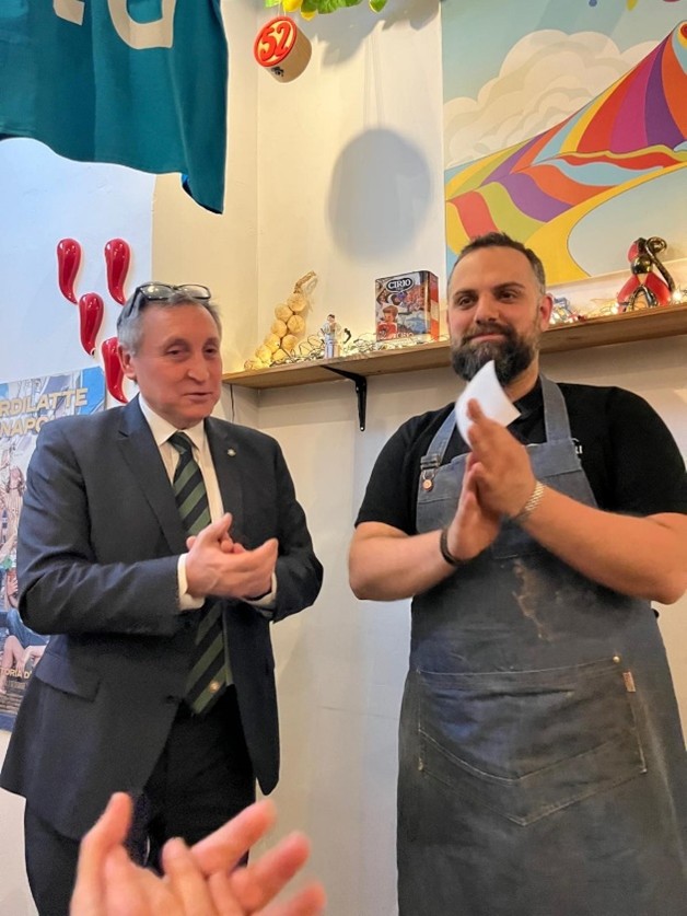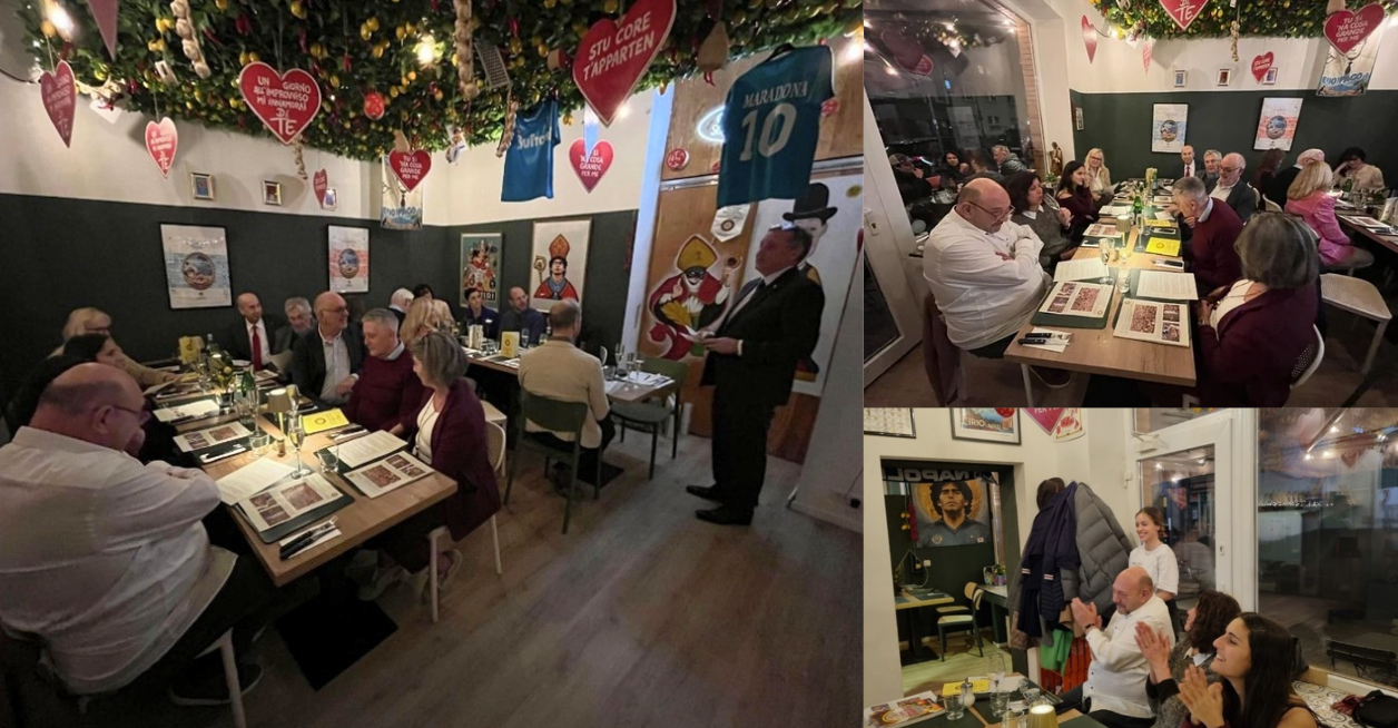 Per celebrare il prestigioso riconoscimento UNESCO della Cucina Italiana quale Patrimonio Culturale Immateriale dell’Umanità, la Delegazione di Colonia si è riunita presso il ristorante “Spaccanapoli”: un presidio di cultura, passione e identità partenopea. Le persone che rendono possibile questa esperienza sono Raffaele, cuoco, pizzaiolo e anima del locale, e sua moglie Valentina, che accoglie gli ospiti con grazia e naturalezza, trasformando il ristorante in uno spazio familiare. La proposta culinaria dello Chef Raffaele Mastellone, magistralmente descritta dal Simposiarca Natale di Rubbo, ha reso omaggio alla tradizione napoletana, partendo da un ricco antipasto iconico fino ai primi piatti classici, come la pasta e patate con provola e gli ziti alla lardiata. Protagonista assoluta è stata la pizza, proposta in una versione raffinata, seguita dai dolci simbolo della città: la torta ricotta e pera e il soffice babà. Il percorso, accompagnato da vini campani e birra artigianale, ha testimoniato la vitalità della cucina campana oltre i confini nazionali. Grazie alla dedizione dei titolari, “Spaccanapoli” si è rivelato un autentico ponte culturale tra Italia e Germania, capace di valorizzare le radici italiane attraverso un perfetto equilibrio tra gastronomia e passione. La Delegazione ha avuto l’onore della partecipazione del Console Generale a Colonia, recentemente insediatosi, Dott. Massimo Cipolletti, il quale ha ringraziato e ribadito come il riconoscimento UNESCO rappresenti un traguardo di straordinario valore simbolico e culturale, che onora l’identità nazionale e riconosce nella tradizione gastronomica un’alta espressione di storia, civiltà e coesione sociale.