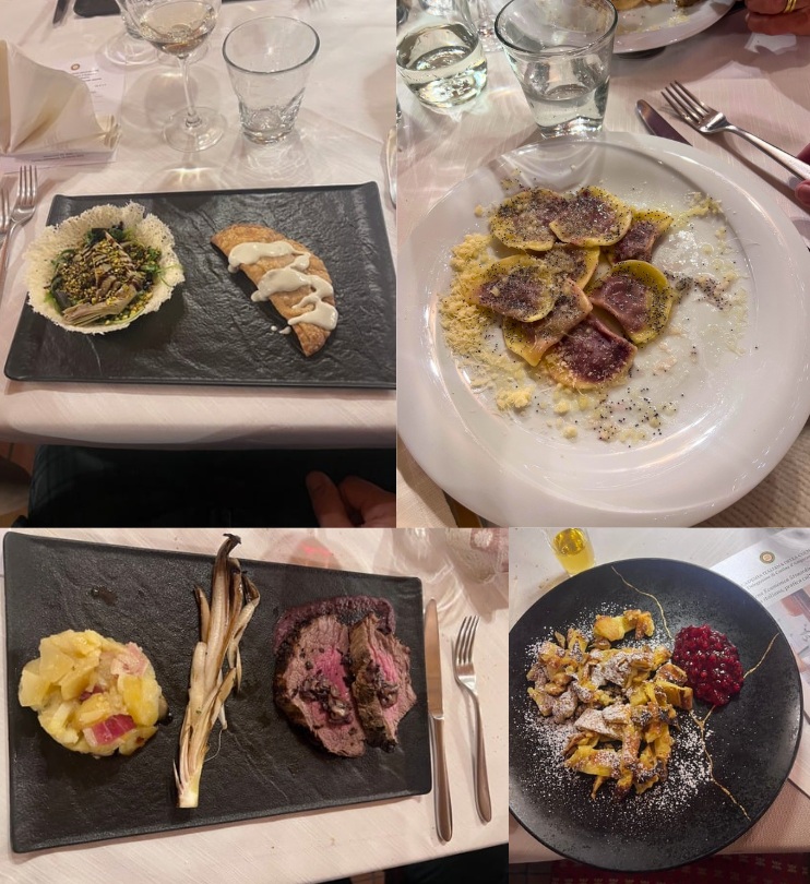 In occasione della Conviviale Ecumenica Straordinaria, la Delegazione di Cortina d’Ampezzo si è riunita presso il ristorante Rio Gere, appartenente alla famiglia Bellodis sin dal 1957 e gestito a quel tempo dai nonni dell’attuale proprietario e cuoco: luogo perfetto per portare in tavola piatti della tradizione ampezzana, come casunziei e kaiserschmarnn. La cucina locale nasce in una zona di passaggio con scambi commerciali fin dall’epoca romana. Cortina fu sotto la Repubblica di Venezia dal 1420, e poi sotto gli Asburgo dal 1511 fino al 1919, per questo la cucina unisce influenze venete e mitteleuropee. In origine era una cucina povera, legata alla sopravvivenza e alle risorse locali. Tra i piatti tipici ci sono casunziei, chenedi (canederli) e goulash. Molti dolci derivano dalla tradizione austro-ungarica, come strudel e kaiserschmarrn. La cucina ampezzana è quindi il risultato di tradizione locale e influenze storiche esterne, ed è necessario ricordarne le origini per non perdere identità e cultura.