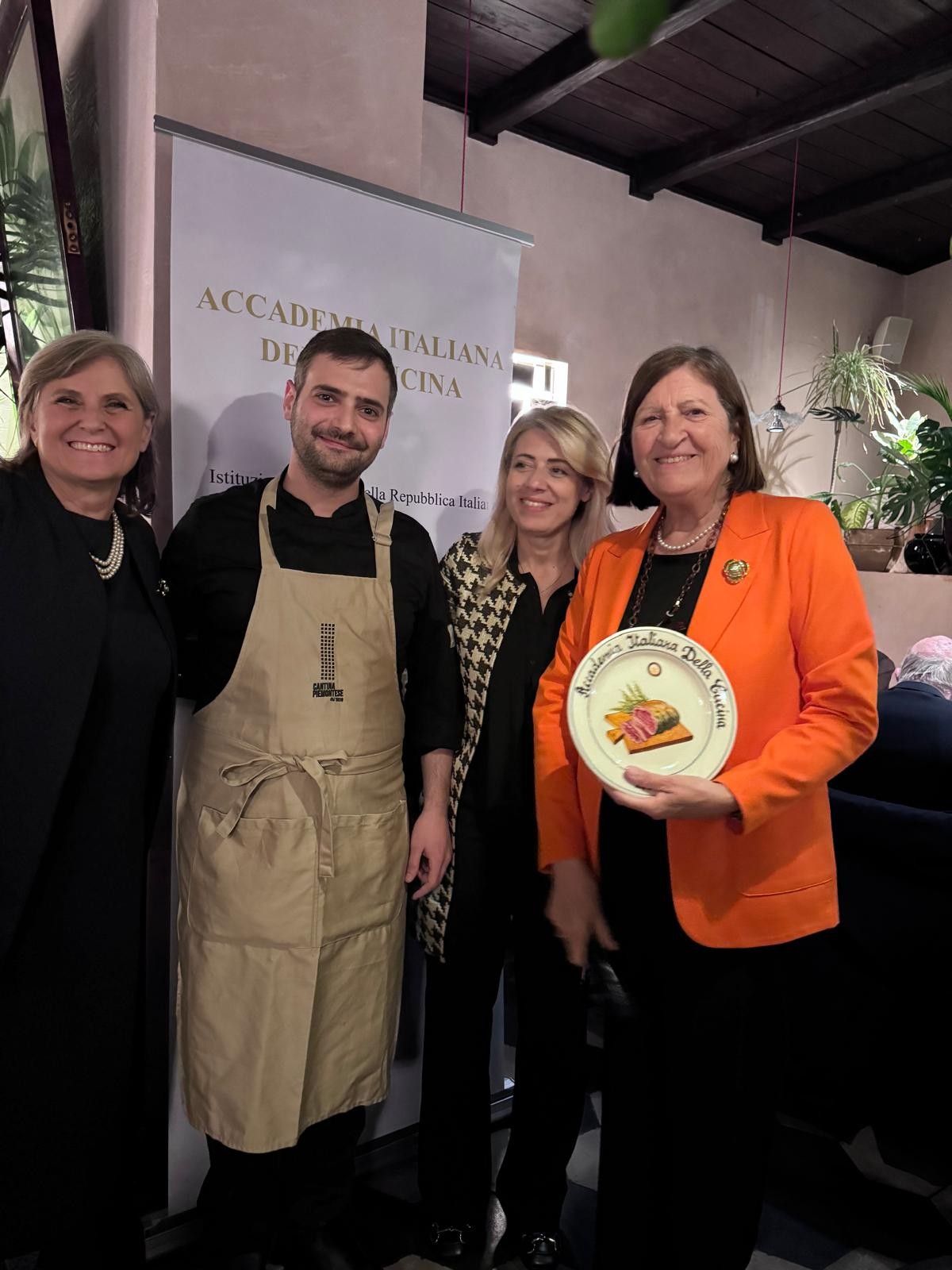 Come da tradizione, la Cena Ecumenica della Delegazione di Malta si è svolta al ristorante Sabbagata. Il menu, incentrato sulla carne, scelta non semplice vista la tendenza a ridurne il consumo, ha riscosso grande successo grazie alla creatività dello chef Salvo Pavone, punto di riferimento della Delegazione per gli eventi più importanti e sempre pronto ad accogliere le sfide dell’Accademia nella realizzazione dei menu tematici. Attraverso sei portate dai titoli evocativi, Pavone ha guidato i convitati in un percorso gustativo unico, dove la carne, pur protagonista, lasciava spazio a cotture innovative e accostamenti sorprendenti, fino al “bollito nascosto”: un tortello al caffè ripieno di ossobuco in salsa di zafferano. Ogni piatto è stato abbinato a un vino delle Tenute Lombardo, tra cui il più apprezzato, il Sualtezza 650 rosé, coltivato a 650 metri sul mare. La delegata ha introdotto la serata trattando del consumo della carne come espressione d’identità socio-culturale, alimento simbolo di status, lusso o desiderio, protagonista dei banchetti rinascimentali e dei pranzi borghesi fino ai giorni nostri, dove, pur con maggiore consapevolezza, resta il fil rouge che unisce quasi tutte le cucine del mondo. Ospite d’onore l’attore Elio Crifò, che con maestria e ironia ha letto la novella del Boccaccio “Chichibio e la gru”, aggiungendo un tocco d’arte e allegria a una serata che ha saputo fondere genialità culinaria, cultura e teatro.