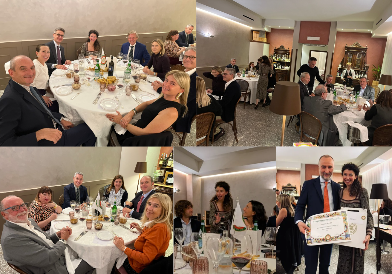 La Cena Ecumenica della Delegazione di Monaco di Baviera si è svolta in un clima di grande convivialità presso l’Osteria Italiana, il più antico ristorante italiano ancora attivo in Germania, fondato nel 1890. Durante la serata sono stati consegnati due riconoscimenti: l’Attestato di Benemerenza a Beppe Cannici, per i quarant’anni di appartenenza all’Accademia, e il Diploma di Appartenenza venticinquennale ad Eva Janda. Entrambi hanno espresso gratitudine verso l’istituzione e gli altri membri, sottolineando il ruolo dell’Accademia nella diffusione della cultura gastronomica italiana. Stephanie Deiters, Simposiarca dell’evento, insieme al gestore Prisco De Stefano e allo chef Umberto Bressanin, ha sviluppato il tema dell’anno proponendo un bollito misto servito al carrello, accompagnato da salse preparate in cucina. Il menù, aperto e concluso da portate dai sapori autunnali e da un primo dedicato alle carni arrosto, ha ottenuto grande apprezzamento, anche per la scenografia del bollito e la preparazione a vista dello zabaione. L’abbinamento dei vini e l’eccellente servizio di sala hanno completato la serata.