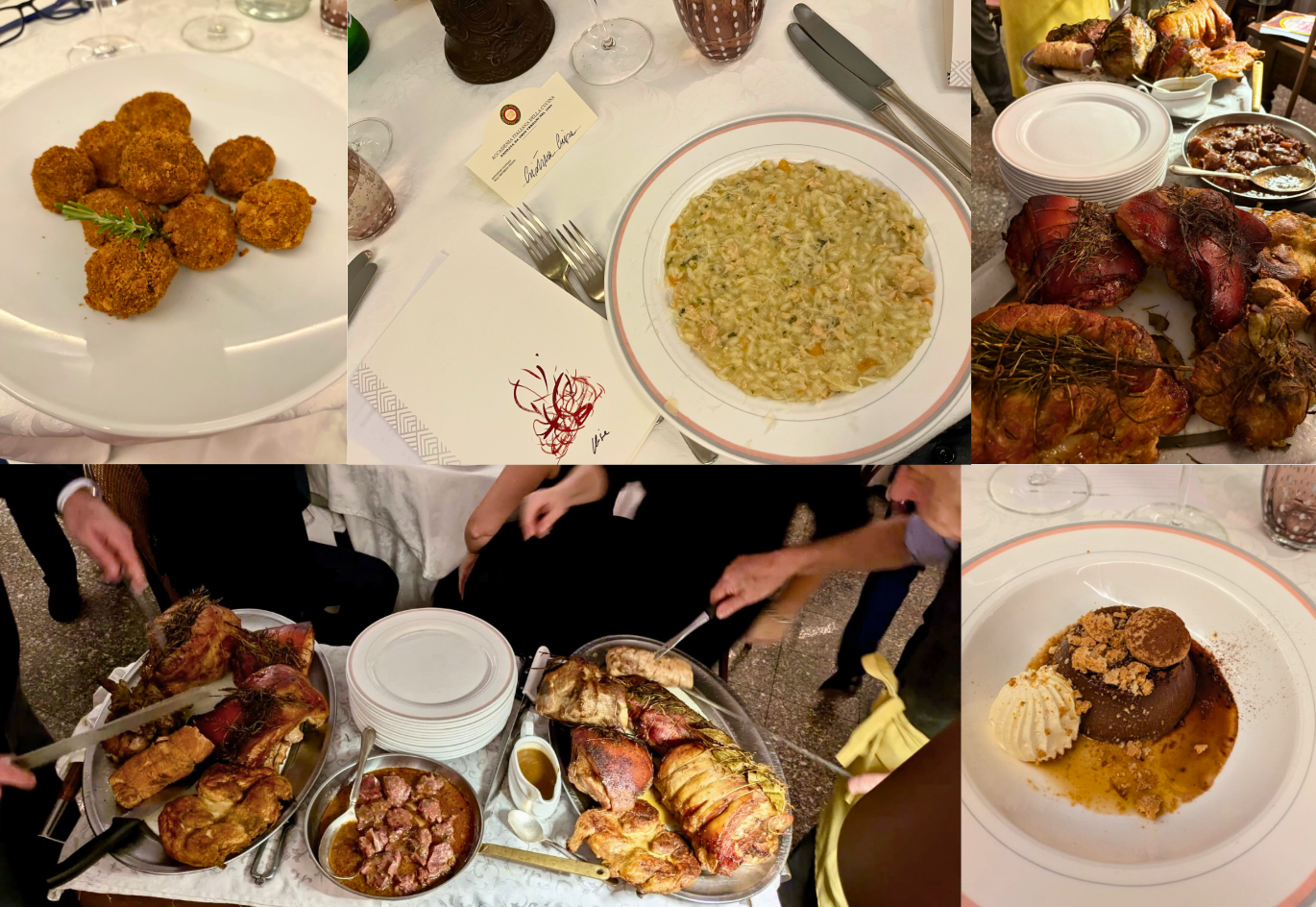 La tradizionale cena ecumenica della Delegazione reatina si è svolta alla trattoria “La Palazzina” di Rieti. Dopo i saluti del Delegato Francesco Maria Palomba e la presentazione del menu nella veste di Simposiarca, l’Accademica Valeria Lettera ha tenuto un intervento culturale. I vini sono stati illustrati da Enrico Maria Concutelli, responsabile di area della Cantina Casale del Giglio. Tra i partecipanti: il Prefetto di Rieti Pinuccia Niglio, il Colonnello Valerio Marra, il Colonnello Gianluca Ferraro e il Dr. Michele Tota, Vice Questore Vicario. Dopo l’aperitivo di polpettine fritte di “allesso”, i partecipanti hanno degustato le porchette PAT di Selci (Giorgio Giorgini), Poggio Bustone (Oreste Battisti) e Cantalice (Enzo Crosti), accompagnate da una giardiniera e da altre preparazioni della chef Oksana Pidhorodetska, eccellente interprete della cucina reatina. Il menù comprendeva polenta in umido con spuntature, salsicce, polpettine e pancetta; “allesso” di gallina, lingua, cotechino, muscolo e biancostato con varie salse; zampetti con salsa verde; patate lesse e fagiolini; e crostata di mele cotogne secondo la ricetta di Bartolomeo Scappi. In abbinamento, i vini di Casale del Giglio.
