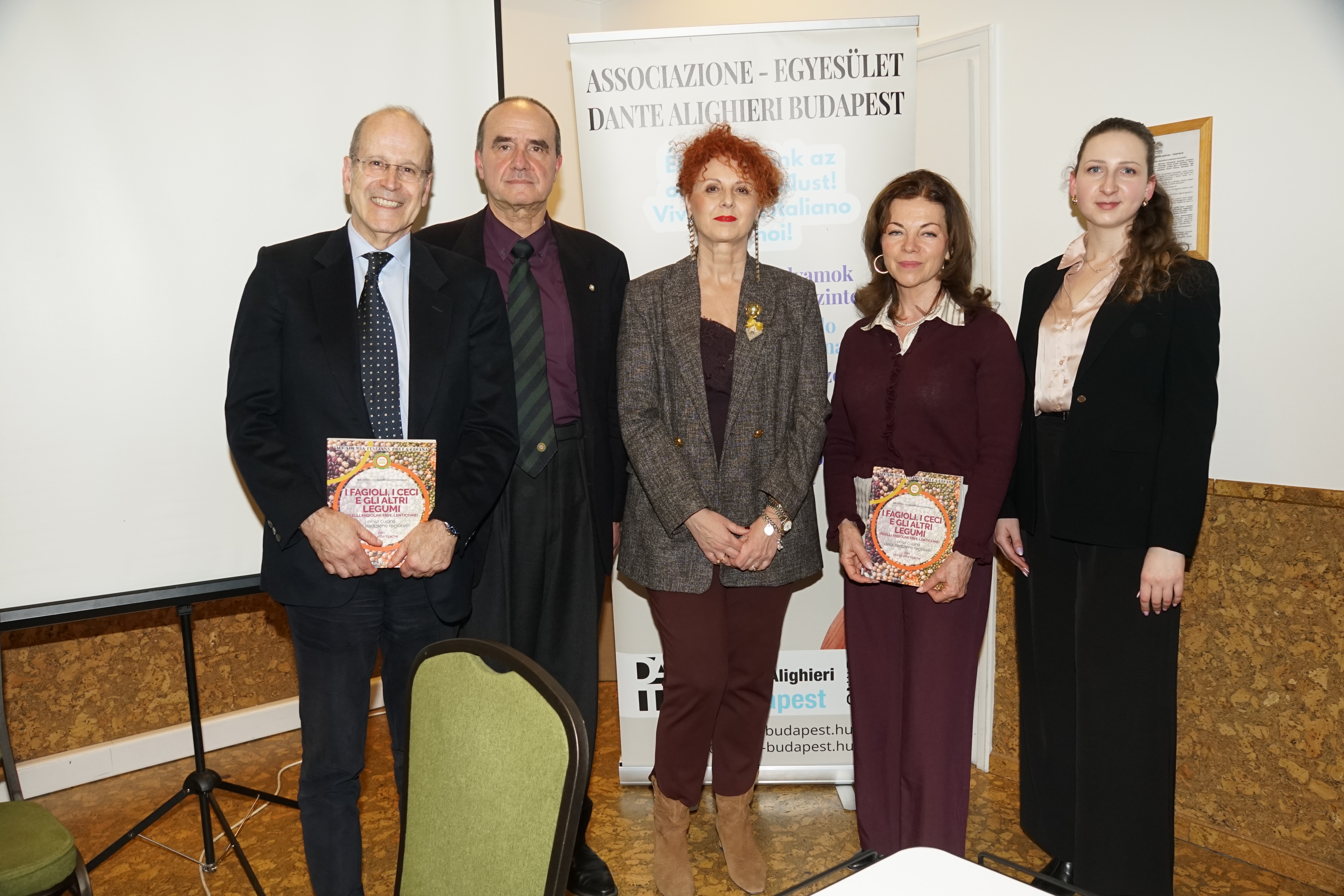 Il 27 febbraio 2026, presso il MagNet Kozossegi Haz di Budapest, si è svolto il Seminario organizzato dalla Delegazione di Budapest con il Comitato Dante Alighieri, parte della Società Dante Alighieri. Dopo i saluti della Presidente Edit Császi e del Delegato Michele Fasciano, la Vice Delegata Maria Carmela Gaetani Aronica ha aperto i lavori con la conferenza “La Cucina Italiana patrimonio immateriale UNESCO”, illustrando il valore del riconoscimento, che celebra identità, tradizioni, innovazioni e saperi trasmessi nel tempo. Ha evidenziato come la cucina italiana sia uno stile di vita fondato su condivisione, rispetto degli ingredienti e biodiversità, e come il riconoscimento UNESCO rafforzi la tutela dei prodotti italiani, affermando il cibo come espressione culturale. Il Prof. Roberto Volpe (CNR) ha approfondito il tema della corretta alimentazione, sottolineando il ruolo della dieta mediterranea nella salute e longevità e l’importanza dei legumi nella prevenzione cardiovascolare. Al termine, il Delegato ha donato il volume “I fagioli, i ceci e gli altri legumi” alla Dott.ssa Császi e al Prof. Volpe, elogiandone l’attività scientifica e divulgativa. La serata si è conclusa con una cena italiana presso il ristorante Krizia, preparata dallo chef Graziano Cattaneo, in un clima di cordiale convivialità.