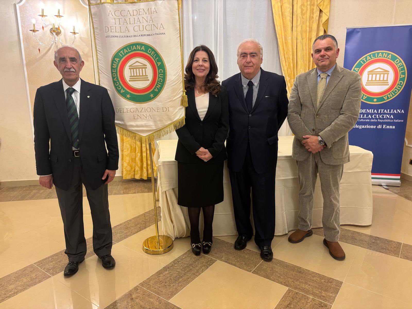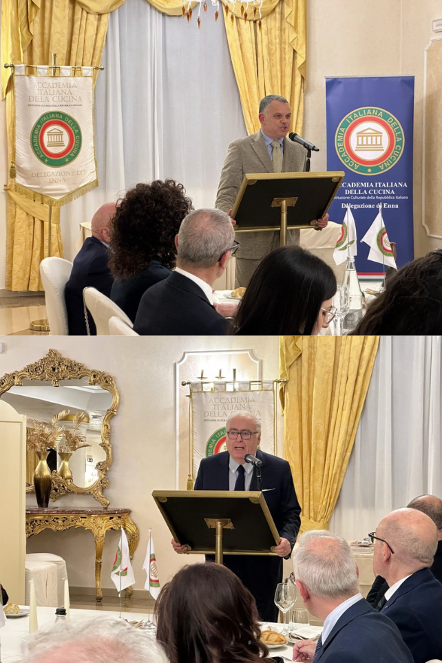 La Delegata di Enna Marina Taglialavore, anche presidente del Club UNESCO di Enna, ha aperto la serata organizzata al Federico II Palace Hotel ringraziando autorità e organizzatori, ricordando il ruolo collettivo che ha portato la cucina italiana al riconoscimento internazionale. Il Presidente nazionale della Federazione dei Club per l’UNESCO, Mauro Micale, ha salutato i presenti in videoconferenza. Hanno preso parte il Prefetto Ignazio Portelli, il Questore Cono Incognito, l’assessore alla Cultura del Comune di Enna Peppe La Porta, l’assessore alla Cultura del Comune di Agira Ausilia Cardaci e Ugo Serra, Segretario del Consiglio di Presidenza dell’AIC. Gli interventi hanno sottolineato il valore sociale e identitario della tavola come luogo di incontro e condivisione. È emersa la consapevolezza che il riconoscimento UNESCO non sia solo celebrazione della qualità gastronomica, ma anche responsabilità, come evidenziato da Taglialavore: conservare, studiare e tramandare pratiche e saperi per mantenerli vivi e autentici. L’Accademia si propone come guida in questo percorso, collaborando con istituzioni e associazioni per valorizzare le tradizioni locali. La cena ha unito radici e pregio: macco di fave, cuori di carciofi, ricotta locale, sformatino di bucatini con sarde, falsomagro e dessert Federico II, applaudito per equilibrio e tecnica. Oltre al gusto, la serata ha offerto una riflessione sui valori immateriali della cucina: memoria, identità, convivialità e legami sociali, ribadendo come il successo della cucina italiana derivi anche da uno stile di vita fondato sulla condivisione.