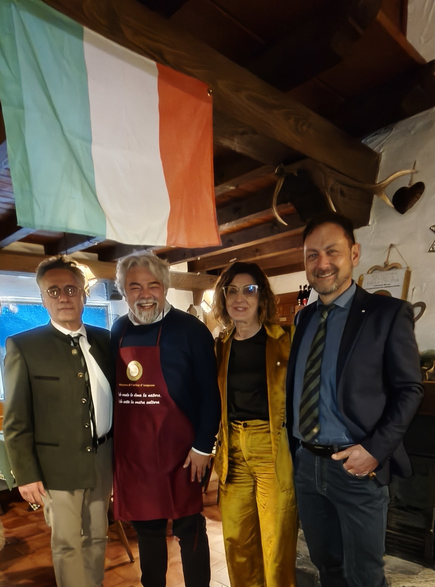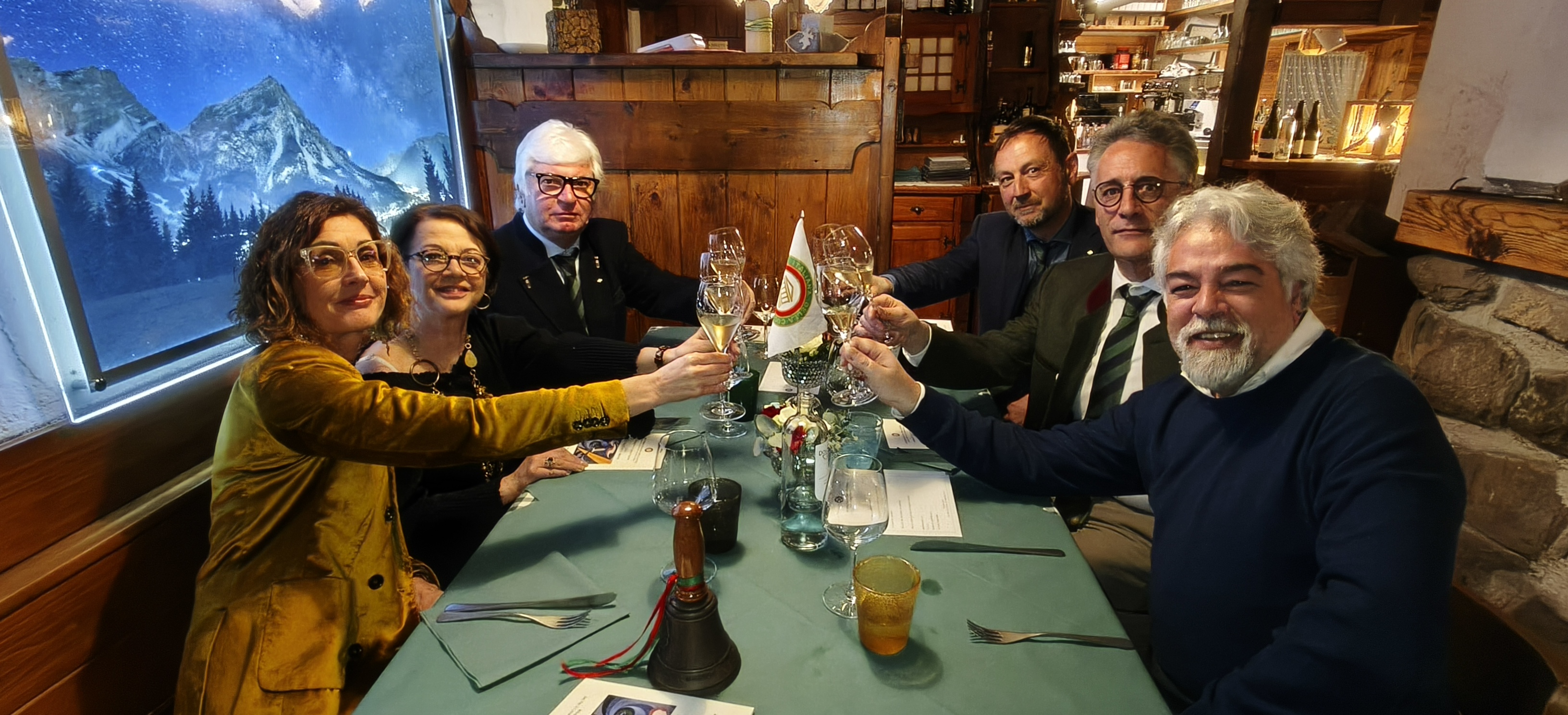 Il 26 febbraio scorso, nell’intervallo tra Olimpiadi e Paralimpiadi, la Delegazione di Cortina d’Ampezzo si è riunita presso il rifugio Larin di San Vito di Cadore per celebrare il tema “il Tricolore ed il rito del Brindisi”. Relatore ospite della serata Alessandro Pizzo, scrittore ed artista, che ha intrattenuto Accademici ed amici con aneddoti e curiosità poco conosciuti sul tema. Il menu, curato dal cuoco Antonio Marinotti e dai Simposiarchi Diego Belli ed Alfonso Sidro, ha visto in tavola piatti rigorosamente tricolori e alcuni vini dei territori vulcanici italiani. Il discreto sottofondo musicale di celebri brani d’opera dedicati ai brindisi ha accompagnato una riuscita serata nell’accogliente atmosfera del rifugio.