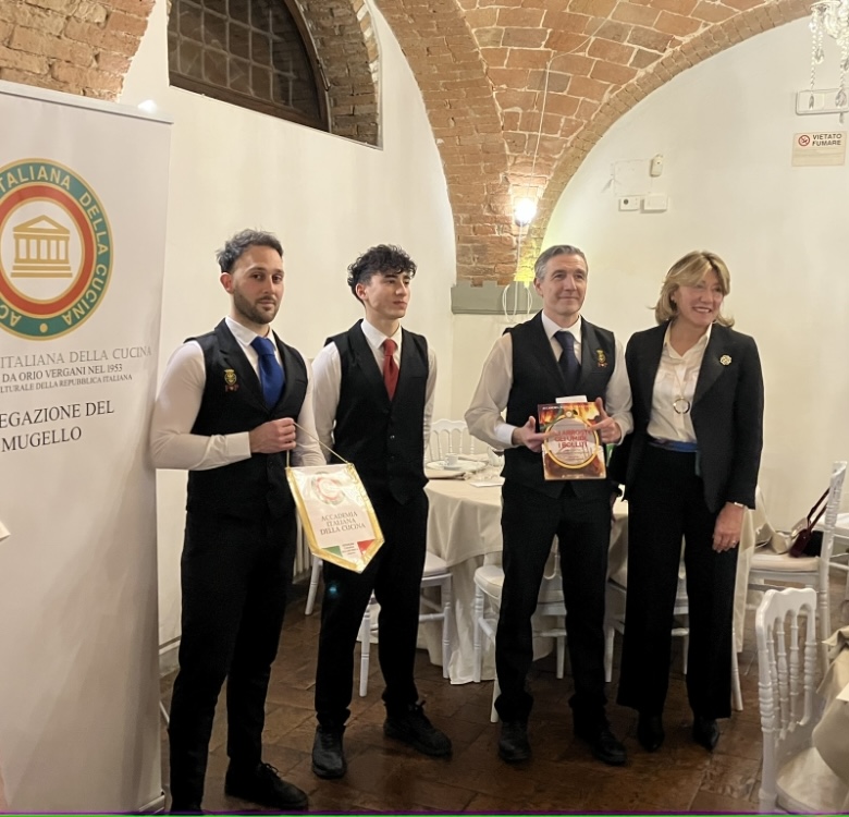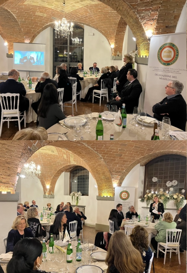 Per celebrare l’Ecumenica straordinaria per il riconoscimento UNESCO della cucina italiana a patrimonio immateriale dell’Umanità, gli Accademici si sono riuniti presso la Fattoria Il Palagio a Scarperia e San Piero. Un ambiente raffinato, gestito da quarant’anni dalla stessa famiglia, con una cucina della tradizione del territorio, in perfetta sintonia con il significato e i valori dell’occasione. Presenti alla serata il Sindaco di Borgo San Lorenzo Leonardo Romagnoli, in rappresentanza anche dell’Unione dei Comuni del Mugello, e l’Assessore alla Cultura Marco Casati per il Comune di Scarperia e San Piero. Dopo la presentazione dell’evento, è stato proiettato il video con il saluto del Presidente Paolo Petroni, accolto con un caloroso applauso. Il menu della serata, in un susseguirsi di antichi e gustosi sapori preparati con passione e maestria da Leonardo Manzani e Cristian Mattia, ha annoverato tra i piatti quello più identitario del territorio: il tortello di patate con ragù di anatra. Tra le altre preparazioni, farinata di cavolo nero, crostini con i fegatini e di polenta con funghi come antipasto, seguiti dall’eccellente maialino al forno. A concludere il convivio, una raffinata dolcezza al cioccolato creata per l’occasione. Ottimi i vini e l’abbinamento proposto da Mirko Manzani, che ha diretto un servizio rapido e premuroso. Una serata di festa durante la quale è stato ripercorso l’iter verso il prestigioso riconoscimento, riflettendo sul suo valore culturale e sull’importanza della nostra cucina.