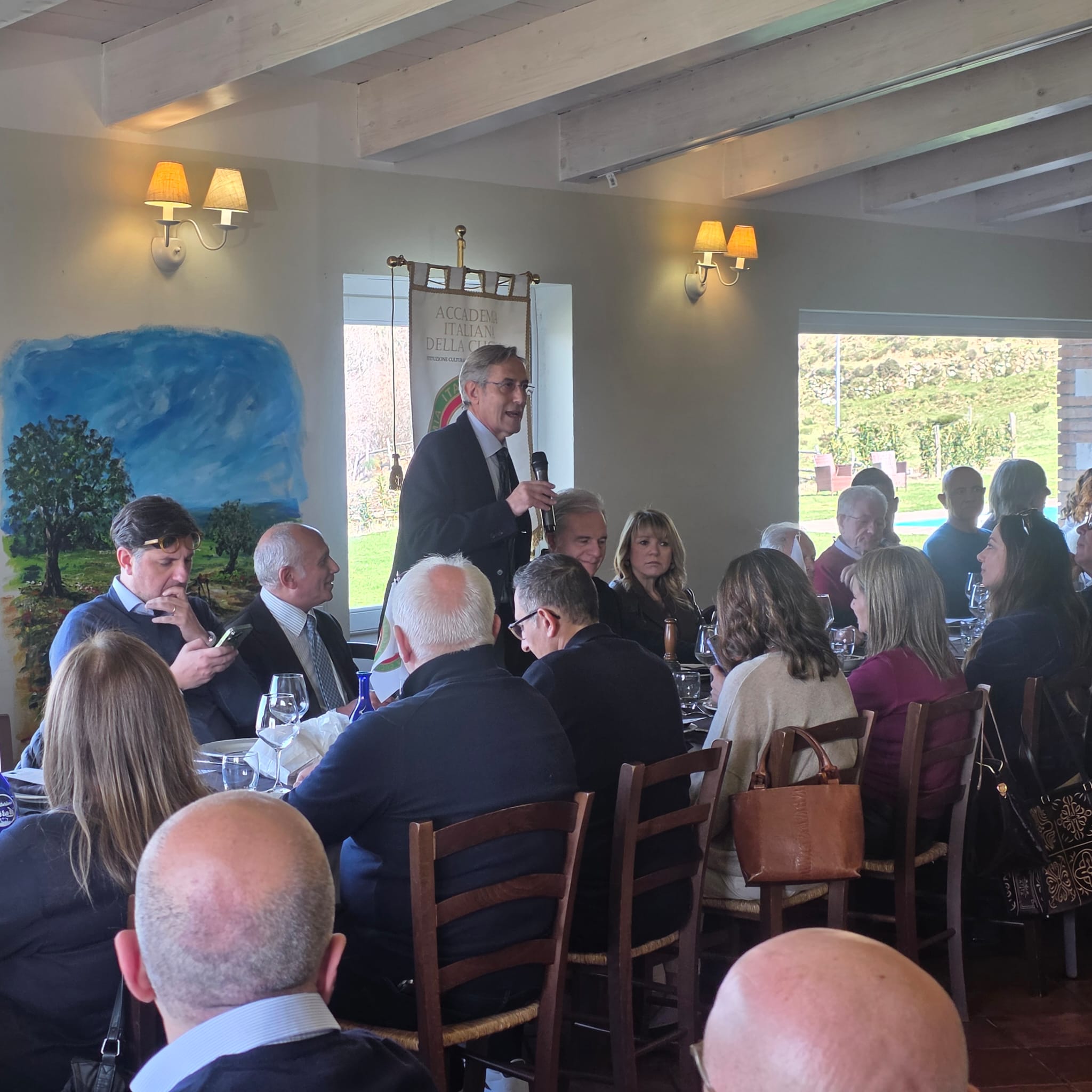 In questa stagione i territori della Repubblica di San Marino e del Montefeltro offrono una straordinaria varietà di prodotti che rappresentano con autenticità la tradizione gastronomica locale, inclusi quelli legati alla rituale lavorazione del maiale, espressione identitaria della cultura contadina locale. Accanto alle eccellenze della norcineria, i boschi generosi donano una ricca varietà di funghi spontanei; tra questi spiccano i pregiati tartufi bianchi e neri, autentici simboli della cucina montefeltrana: ingredienti rari e raffinati, capaci di trasformare ogni piatto in un’esperienza sensoriale intensa e memorabile. Con l’intento di vivere un’esperienza culinaria coerente con questa tradizione è stato scelto, entro le mura della Città di San Marino, il ristorante tipico "Ritrovo dei Lavoratori XXVIII Luglio". L’incontro conviviale si è svolto in un clima piacevole all’interno di un edificio recuperato dall’antico dopolavoro operaio, sebbene l’esperienza gastronomica sia risultata solo parzialmente soddisfacente per alcune criticità riscontrate in parte delle portate. In questa occasione è stato anche ufficialmente accolto il neo Accademico Andrea Berardi. Prima del tradizionale tocco finale della campana, il Delegato Stefano Valentino Piva ha ringraziato i presenti per la partecipazione, augurando a tutti un sereno rientro alle proprie dimore.