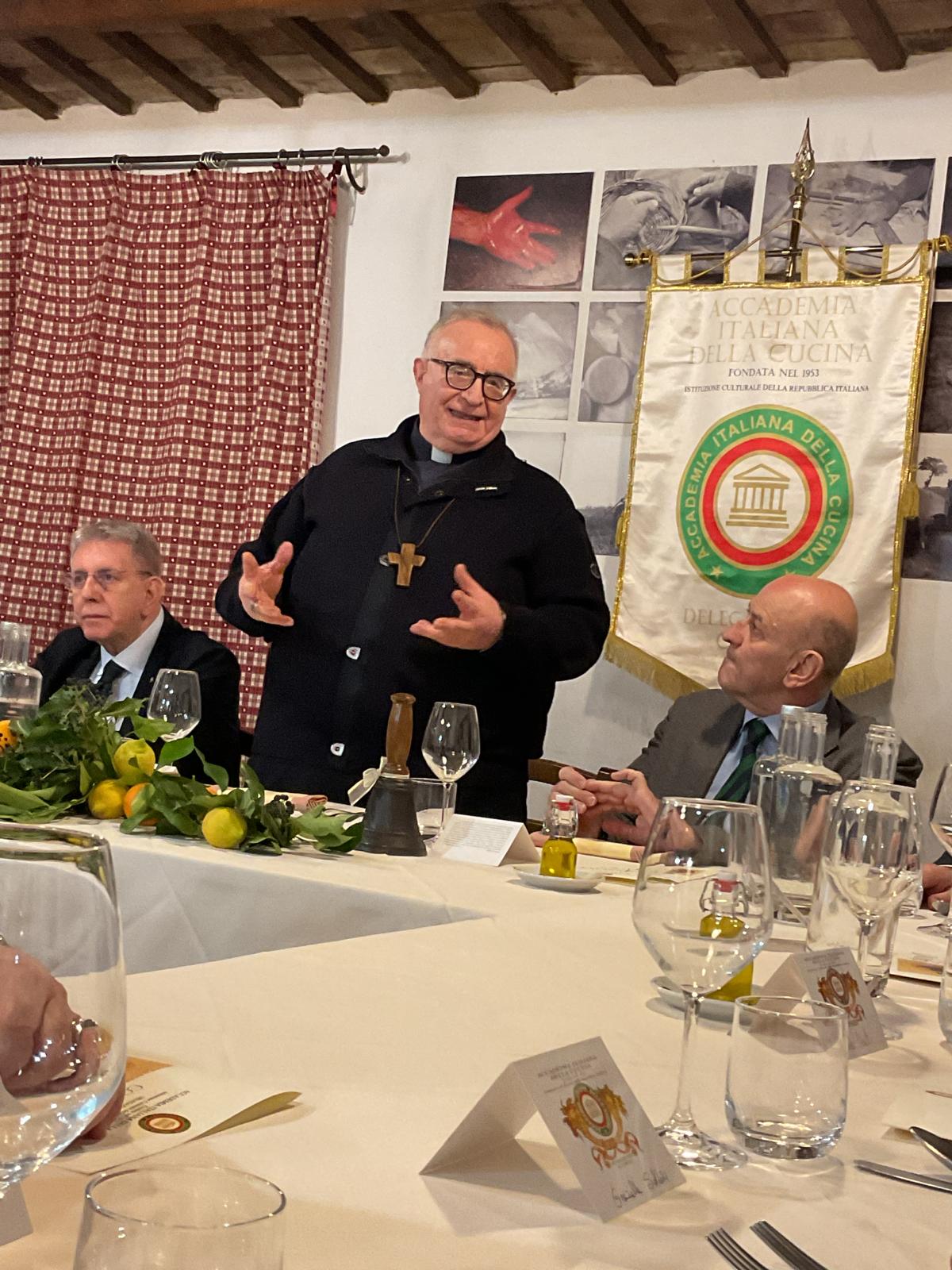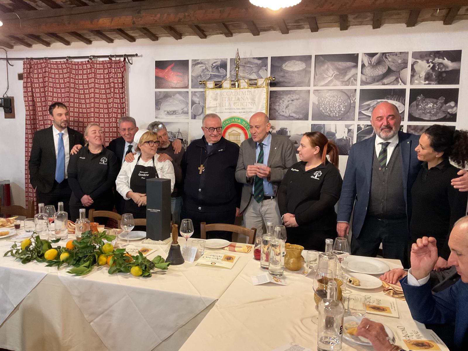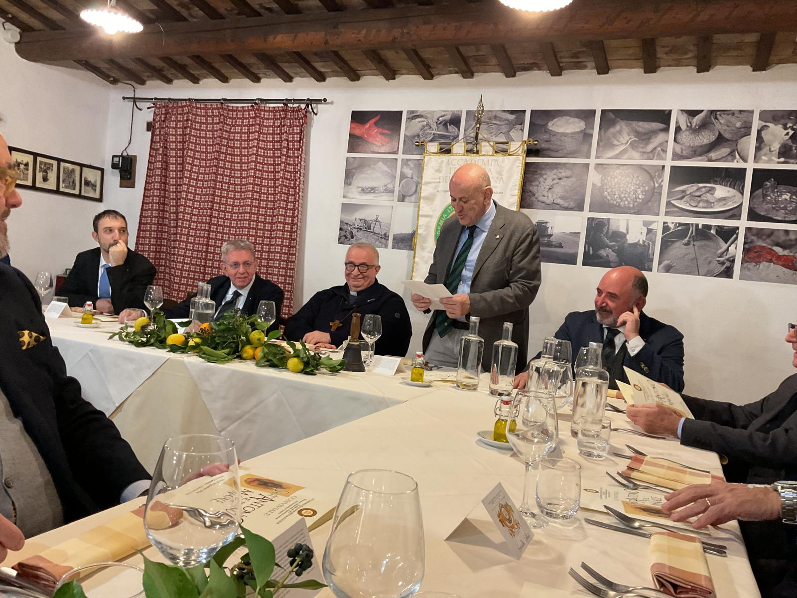 Il 2026 della Delegazione di Chieti si apre con una riunione conviviale dedicata allo speciale legame che, in Abruzzo, unisce Sant’Antonio e il maiale: proprio la sera della vigilia della festa del Santo, gli Accademici e i postulanti si sono ritrovati in uno degli agriturismi più tradizionali del territorio, Caniloro, a Lanciano, per rivivere quella che anticamente veniva denominata la “maialata”, che si svolgeva nelle aie al termine del sacrificio annuale dell’animale domestico, che ogni famiglia contadina abruzzese allevava amorevolmente per un intero anno. La riflessione storico-sociale che ha preceduto la conviviale è stata curata da mons. Emidio Cipollone, arcivescovo di Lanciano-Ortona, che, partendo dalla biografia del santo monaco egiziano, che ha trovato larga eco nell’Occidente cristiano, ne ha raccontato l’iconografia e i legami tradizionali con gli animali “da cortile”. Grazie alle scelte del Simposiarca, Alfonso Di Fonzo, e alla maestria della cuoca, Giuseppina Di Nardo, gli Accademici hanno potuto gustare un menu a base di maiale che ha rievocato i piatti della tradizione abruzzese, con un occhio all’originalità delle proposte, apprezzate anche dall’ospite d’onore, il toscano Emiliano Manfredonia, presidente nazionale delle ACLI.