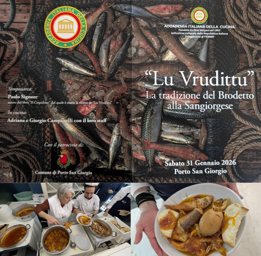 Si è tenuto presso la Sala Castellani di Porto San Giorgio il convegno “Lu Vrudittu. La tradizione del brodetto sangiorgese”, promosso dalla Delegazione di Fermo. Dopo i saluti dell’Assessore Carlotta Lanciotti, del Segretario del Consiglio di Presidenza Ugo Serra e del Coordinatore Territoriale Marche Sandro Marani, il Delegato Fabio Torresi ha introdotto i lavori. Ugo Bellesi, Delegato onorario di Macerata, ha ricordato l’impegno dell’Accademia nel custodire la tradizione del brodetto nelle Marche, anche attraverso il Premio Perini. Alfredo Antonaros Taracchini, presidente della Confraternita del Brodetto di Fano e coautore de “Il Brodetto”, ne ha ripercorso la storia, sottolineando la difficoltà di codificarne una ricetta e citando la più antica, di Anita Spongiafiggi: “olio, pomodoro, aglio, cipolla e varietà di pesce”. Antonio Attorre ha evidenziato come il brodetto nasca dalla necessità delle famiglie di pescatori e dalla creatività domestica, rivalutato solo in tempi recenti. Il prof. Seghetti ha ricordato l’Accademico Corrado Piccinetti, di cui è stato omaggiato il contributo con un piatto in ceramica consegnato alla moglie Gabriella. Dopo la visita ai Cantieri della Civiltà Marinara, la conviviale al ristorante Campanelli ha visto protagonista “Lu Vrudittu”. Nel corso della serata è stato ufficializzato l’ingresso di Paolo Signore, Simposiarca dell’evento e autore de “Il Crapulone”, che ha rievocato, anche nel dialetto locale, la marineria sangiorgese attraverso piatti identitari.