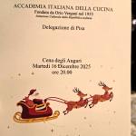 La riunione conviviale per lo scambio degli auguri per le festività natalizie organizzata dalla Delegazione di Cosenza ha rappresentato come sempre un momento di condivisione di valori positivi e di gioie, un piccolo cameo propedeutico al dischiudersi di bel tempo futuro. La Simposiarca Maria Carmela Mauceri ha condotto in maniera coinvolgente gli Accademici in un percorso che ha attraversato le usanze della tradizione, i riti e i principali significati sottesi dai simboli del periodo. Ha evidenziato che il Natale rappresenta un tempo di luce e di speranza, in cui la convivialità diventa centrale e il dono più prezioso è la possibilità di stare insieme agli amici e agli affetti più cari. Ha infine ricordato come, nelle famiglie, l’atmosfera natalizia prenda forma con la preparazione del presepe o dell’albero e con i profumi dei dolci e dei fritti della tradizione. La "squadra" del ristorante Quasimodo del Villa Fabiano ha saputo condurre i commensali lungo un percorso che ha reso merito alle migliori tradizioni gastronomiche e culinarie del periodo. Un seguito musicale è stato il modo di chiudere la serata con leggerezza all’insegna dello spirito e dei valori accademici.