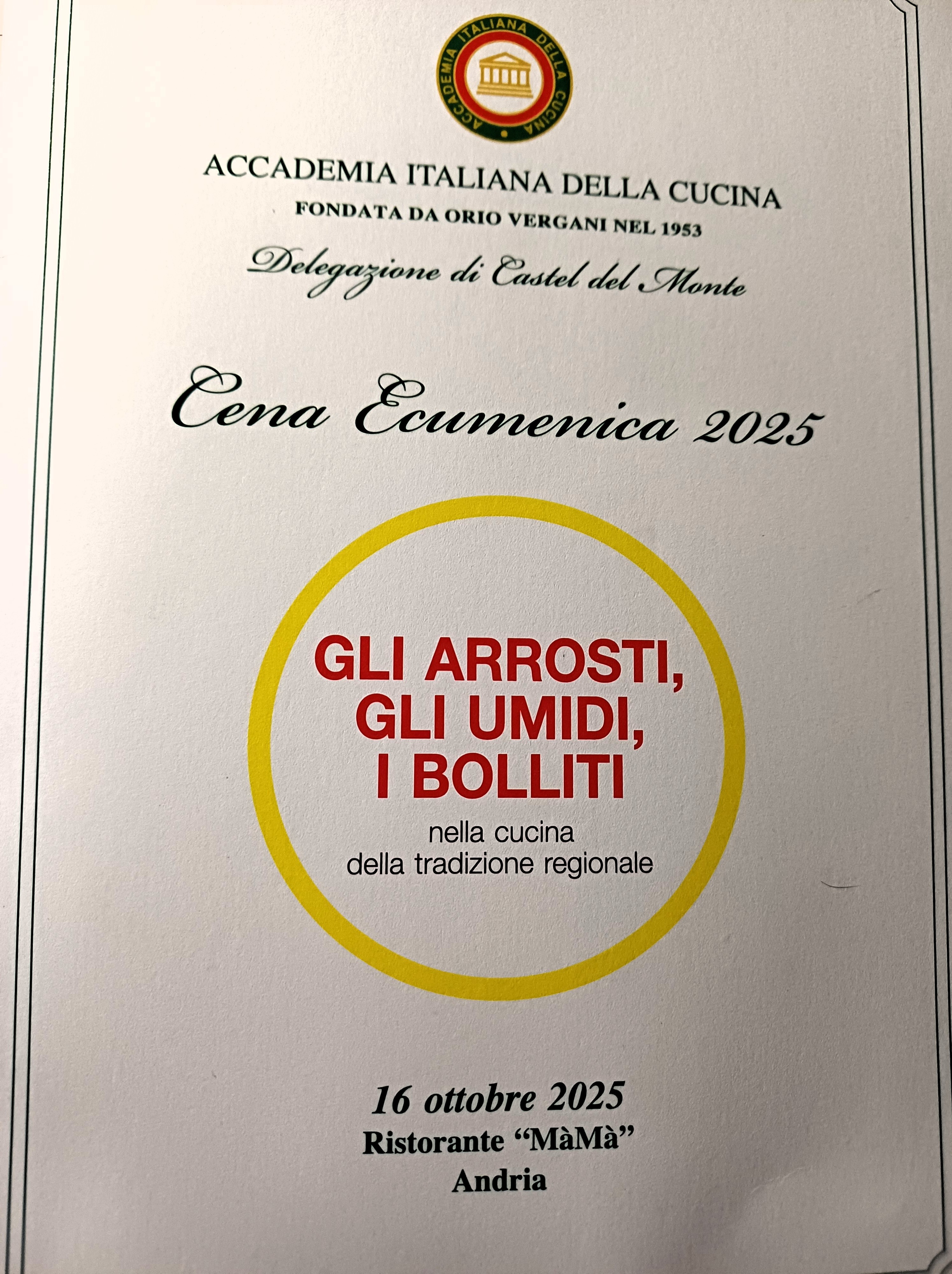 La Delegazione di Castel del Monte si è riunita per la Cena Ecumenica presso il Ristorante Mamà di Andria (BT) con la presenza della quasi totalità degli Accademici. Locale molto elegante e di alto livello per accoglienza e qualità gastronomica. La Delegata Mariagrazia Jannuzzi Sernia ha aperto la conviviale con il tema annuale ed ha introdotto i lavori della giornalista enogastronomica Stefania Leo che nella relazione ha illustrato brillantemente le tradizioni locali sugli arrosti, gli umidi ed i bolliti. La serata si è svolta in un clima di serena convivialità ed amicizia. I piatti dello chef sono stati molto apprezzati dagli Accademici, in particolare la guancia di vitello cotta a bassa temperatura. La cena si è conclusa con le congratulazioni allo chef e la consegna del guidoncino dell’Accademia e della vetrofania.