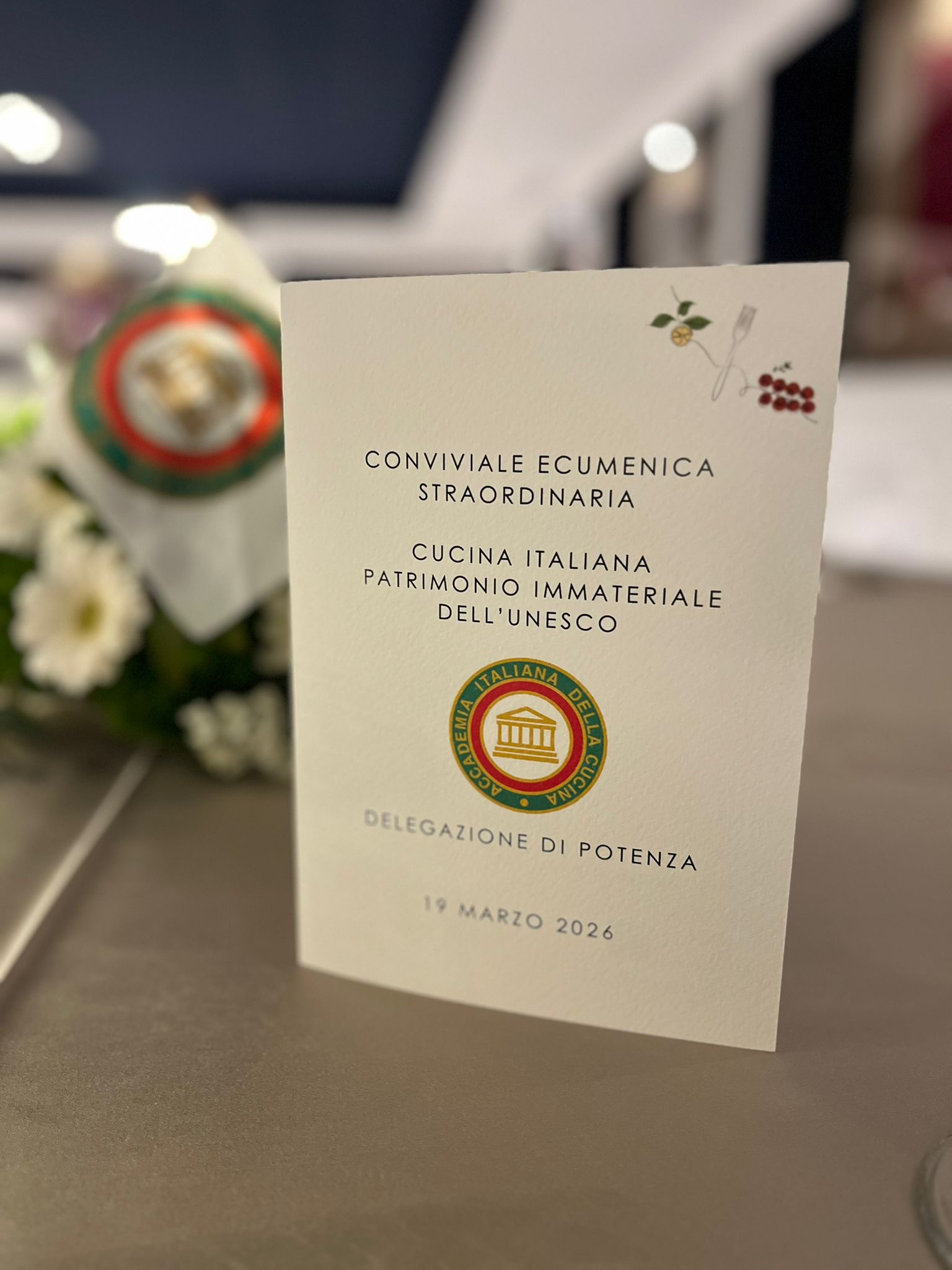 L’evento ecumenico ha rappresentato una preziosa occasione per aprire, una volta di più, la realtà associativa al territorio e far conoscere l’attività e le finalità sociale e culturale dell’Accademia Italiana della Cucina. Sia il Sindaco della città di Potenza, Vincenzo Telesca, che l’Assessore comunale alla Cultura, Roberto Falotico, hanno infatti risposto con entusiasmo all’invito a partecipare all’evento svoltosi in contemporanea con tutte le Delegazioni, portando il saluto dell’istituzione che rappresentano e testimoniando la loro adesione alla missione fondante dell’Accademia, che ha determinato l’importante riconoscimento UNESCO. La cena, che ha visto la presenza di quasi l’intera Delegazione e di due nuovi Accademici, insieme ad alcuni graditi ospiti, ha avuto luogo presso l’Art Restaurant di Potenza, con un menu curato dallo chef Antonio Zirpoli a base di prodotti e piatti tipici lucani. Ad aprire la serata, un aperitivo con polpetta di pane alle cime di rape e sfera di baccalà su vellutata di fave, seguito da un antipasto con uovo poché CBT su fonduta di caciocavallo e peperone di Senise IGP. A seguire, ravioli con cruschi, brasato di suino nero lucano alla birra rossa e, per concludere, zeppole di San Giuseppe. Il tutto accompagnato da Aglianico del Vulture delle Cantine di Venosa.