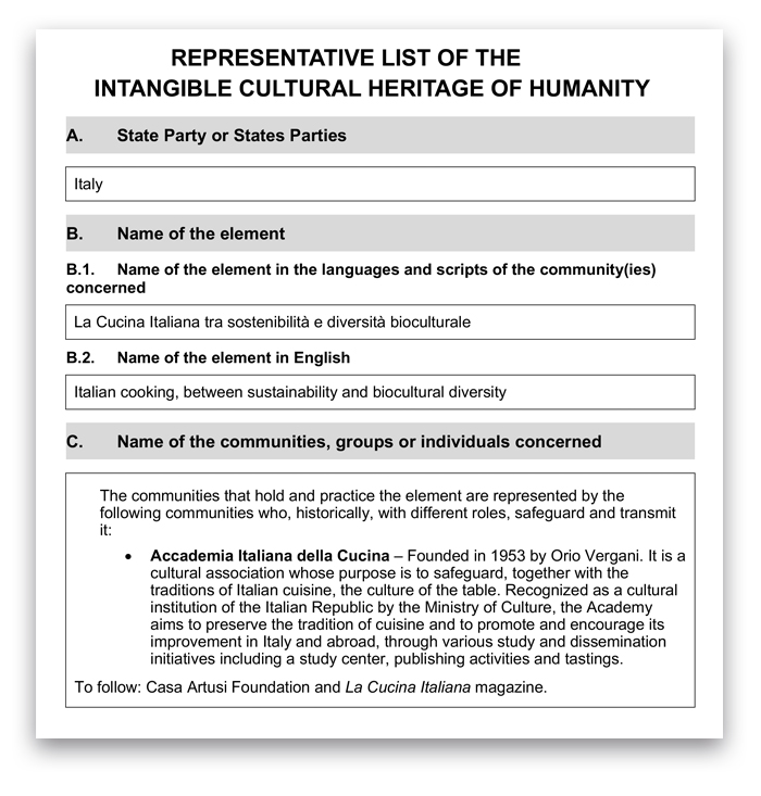 The Italian nomination was formalised through a dossier presented by the communities formed by the Italian Academy of Cuisine, the Casa Artusi Foundation and the magazine La Cucina Italiana. It was then officially presented by the Italian government (the Ministries of Culture, Agriculture and Food Sovereignty, and Foreign Affairs). Scientific support was provided by experts such as Honorary Academician Massimo Montanari and Professor Pierluigi Petrillo.