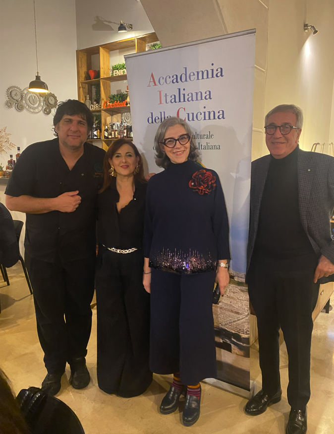 Per la tradizionale riunione conviviale degli auguri natalizi, il Delegato Valerio Antonio Vinelli e la Simposiarca Renata Montini hanno scelto il Ristorante Baracus (dal nome del protagonista di una serie TV degli anni ’80), sorto da pochi mesi nei pressi del Parco "Campi Diomedei”. Voluto dall’ing. Emiliano Bruno, che da bambino sognava di fare il cuoco, il locale è stato progettato dall’arch. Cesare Corfone, che si è ispirato per ambientazione e arredi al film Interstellar. Lo chef Pierluigi Bortone, con lunga esperienza in ristoranti gourmet, ha proposto come menù un percorso mare-terra-monti: antipasto a base di assaggi di baccalà mantecato con chips di risotto allo zafferano, tempura di alice in saor e maionese alle acciughe del Cantabrico, battuta di cervo con polenta fritta e ketchup al datterino giallo, nonché pancotto croccante di mare e polvere di cima di rapa; per primo gnocchetti di ricotta di bufala, funghi caldarelli e crema di zucca affumicata al kamado; per secondo filetto di maialino alla crema di gorgonzola, noci e mosto cotto; per dessert tenerina con crema al mascarpone al pistacchio e panettone artigianale. Il convivio è iniziato con un brindisi augurale, una dedica al riconoscimento della Cucina Italiana come Patrimonio Immateriale dell’Umanità, e la presentazione di tre nuovi Accademici. Si è concluso con la consegna allo chef e al ristorante del guidoncino della Delegazione e l’apposizione della vetrofania dell’Accademia sulla vetrina di ingresso del locale.