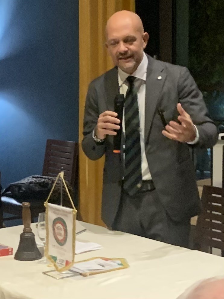Milos Pesole del ristorante Quattro Gatti di Amsterdam ha interpretato benissimo il tema della serata, proponendo un menu di stampo piemontese/toscano con ricette classiche eseguite con maestría. Particolarmente apprezzati gli antipasti, in particolare la lingua morbidissima, e gli agnolotti del plin al sugo d’arrosto. Ha destato curiosità ed interesse la ricetta del cinghiale dolce e forte per il suo sapore speziato, tipico delle ricette rinascimentali. Il bunet finale accompagnato dal bicerin torinese sono stati acclamati. Buoni i vini in accompagnamento e lodevole il servizio. Durante la serata il Delegato (in foto), prendendo spunto dalla presentazione al recente forum dei Delegati, ha parlato di Intelligenza Artificiale in cucina, suscitando una discussione vivace ed interessante.