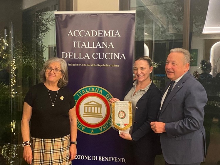 Il ristorante Ama Experience di Benevento ha ospitato l’annuale Cena Ecumenica della Delegazione di Benevento. Quest’anno il tema era “Gli arrosti, gli umidi ed i bolliti della tradizione regionale”. Come ogni anno l’Accademia ha pubblicato un relativo volume (per i tipi di Bolis Edizioni) che è stato presentato dalla Delegata all’inizio della Conviviale e in seguito distribuito agli Accademici. A incorniciare l’evento, l’intervento di Luciano Lombardi. Già giornalista Rai, noto quirinalista, Lombardi ha svolto una relazione che ripercorreva esperienze personali al fianco di grandi intervistati, come Oliver Sacks e Ancel Keys. Memorie, certo, ma più attuali che mai. Lombardi ha invitato i presenti ad essere i custodi del buon mangiare e del mangiar sano, ricordando il contributo dei due scienziati. Il menù, concordato tra lo chef Nazzareno Parisio e la Simposiarca, ha tenuto fede al tema dell’anno, proponendo un secondo piatto che rispettava, allo stesso tempo, l’identità di questo territorio: un cappello del prete, cotto a bassa temperatura, e stufato nel pregiato aglianico del Sannio. Un taglio di carne umile, nobilitato, ammorbidito e insaporito, dal vino delle colline circostanti. Al termine della serata è giunto il plauso degli Accademici al menu, e la Delegata ha consegnato il guidoncino e la vetrofania 2025 dell’Accademia.