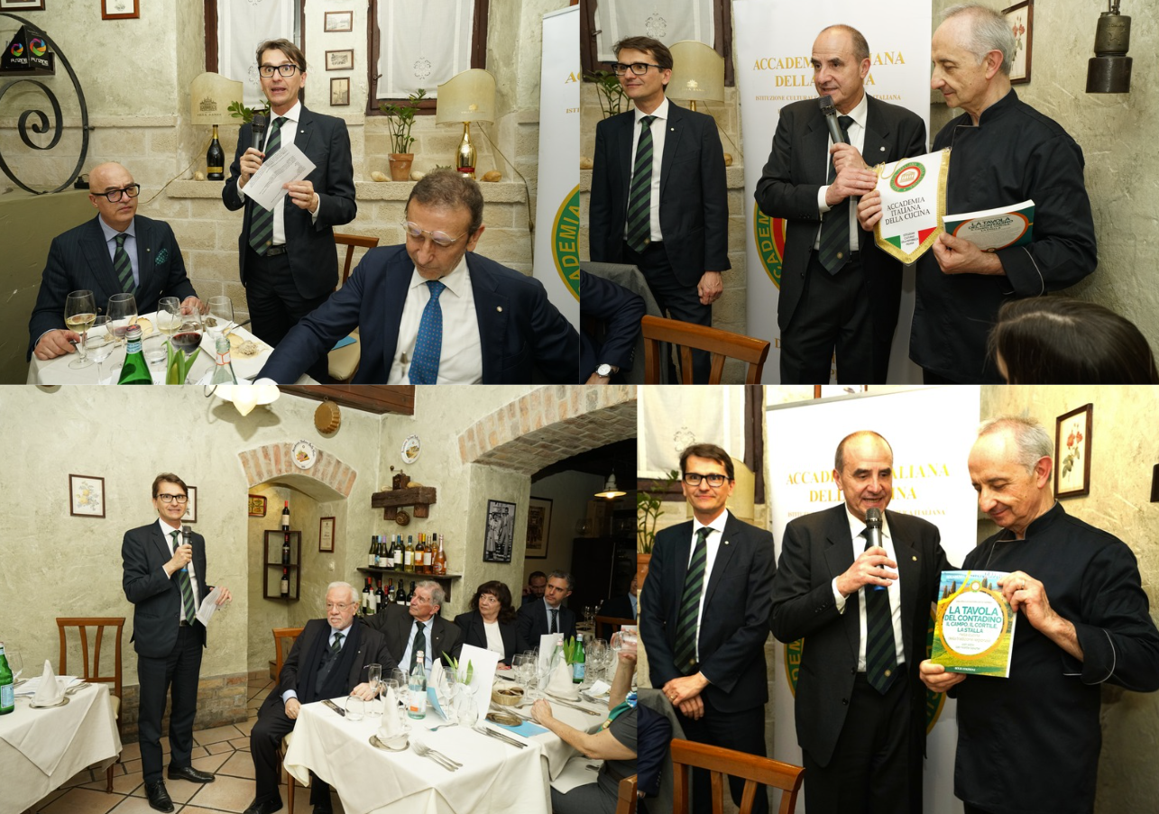 La Delegazione di Alessandria ha celebrato una conviviale ecumenica straordinaria al ristorante La Fermata per omaggiare il riconoscimento UNESCO alla cucina italiana. La serata si è aperta con il video saluto del Presidente Nazionale Paolo Petroni, seguito dalla relazione del cuoco Beppe Sardi, figura storica della ristorazione alessandrina e per oltre quarant’anni alla guida del ristorante “Il Grappolo”. Autore e divulgatore, Sardi ha illustrato con passione le eccellenze gastronomiche della provincia, soffermandosi sulle tipicità e sulle recenti De.Co. A guidare e accompagnare con equilibrio e piacevolezza i diversi momenti della serata è stato Matteo Pastorino, Delegato di Alessandria, che ha saputo condurre gli interventi creando un filo narrativo coinvolgente e armonioso. Il convivio è proseguito con un menu interpretato dallo chef Riccardo Aiachino, che ha valorizzato piatti della tradizione: capunet, ravioli alessandrini dal ripieno autentico e faraona ripiena. In chiusura, la polenta di Marengo, dessert identitario poco conosciuto. Ampio spazio è stato dedicato al riconoscimento UNESCO, frutto anche dell’impegno dell’Accademia Italiana della Cucina, tra i promotori della candidatura, traguardo che rappresenta un onore e uno stimolo a proseguire nella tutela e valorizzazione della tradizione gastronomica italiana.