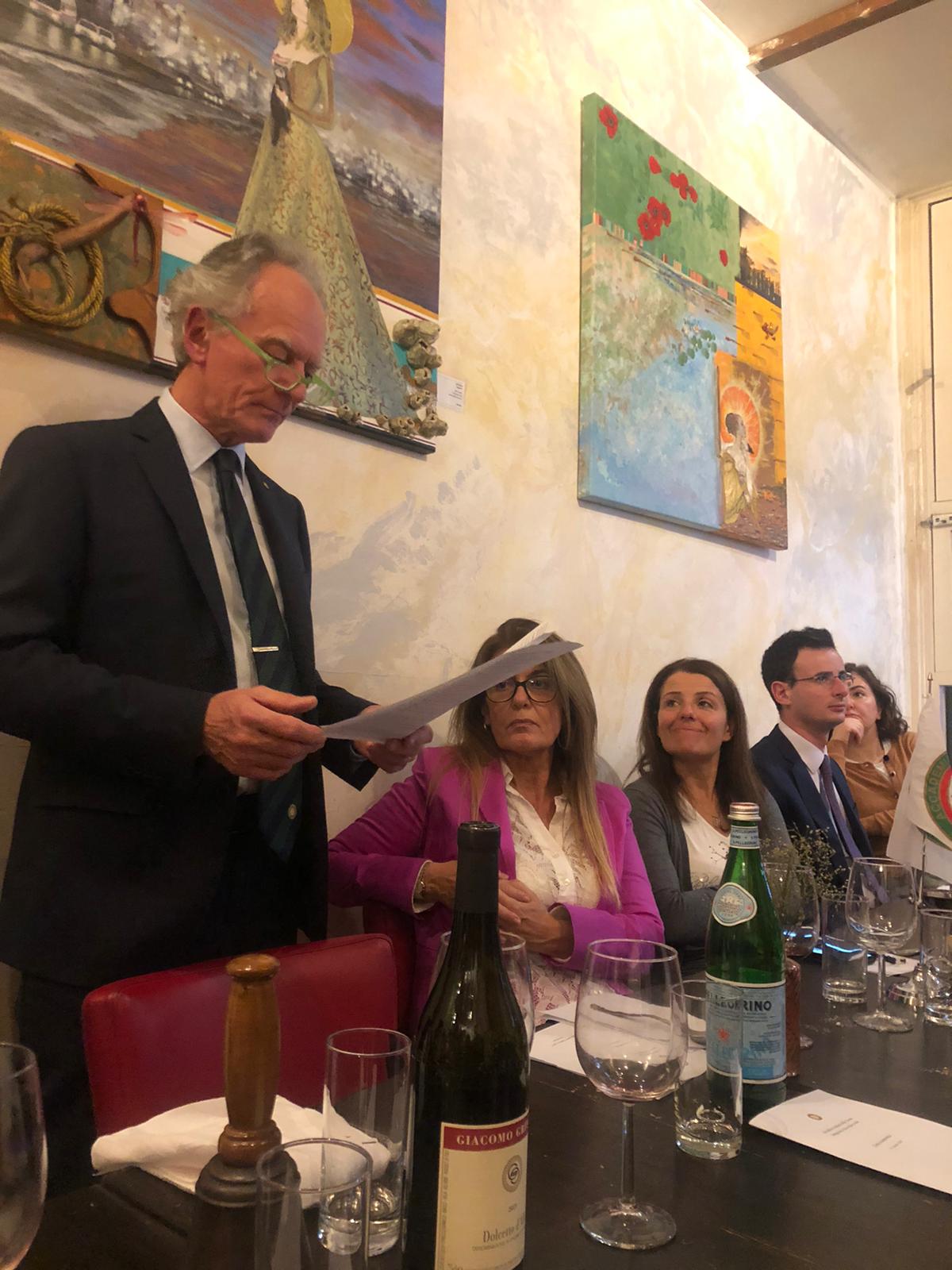 Gli Accademici della Delegazione di Londra e alcuni ospiti, tra cui il Console Generale Domenico Bellantone e consorte, si sono riuniti nei locali della Cantinetta Antinori, ristorante dell’omonima nobile famiglia, per celebrare la Conviviale Ecumenica 2025. Dopo un ricco aperitivo con prodotti tipici toscani, il Delegato ha presentato il volume redatto quest’anno dall’Accademia Italiana della Cucina "Gli Arrosti, Gli Umidi, I Bolliti" illustrando alcune ricette tipiche regionali e la loro evoluzione nel tempo. È stato quindi servito un menu di grande tradizione piemontese e toscana: salumi e formaggi della zona, crostini con pomodorini e basilico; a seguire agnolotti del plin con sugo d’arrosto e arrosto di fesa di manzo, in armonia con il tema della Conviviale, accompagnati da contorni di patate novelle e broccoletti con peperoncino dolce. Entrambi i piatti hanno suscitato commenti entusiasti, così come i cantucci fatti in casa con vin santo. Ottima la selezione dei vini della Cantina Antinori, serviti durante l’aperitivo e la cena. La serata, all’insegna della convivialità e dell’allegria, si è conclusa con un caloroso applauso allo chef Luigi Borelli, al quale il Delegato ha consegnato il piatto ricordo dell’Accademia, e a tutto il personale, nonché alle Simposiarche Silvia Mazzola e Jacqueline McKay per l’impeccabile organizzazione della Cena Ecumenica 2025.