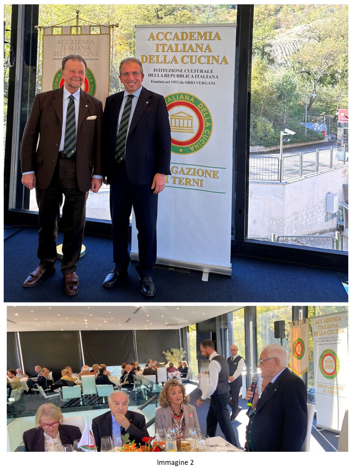 Il loggiato cinquecentesco dell'ex seminario vescovile di Acqui Terme ha fatto da cornice all'ultima riunione conviviale delle Delegazione alessandrina prima della pausa estiva. Gli Accademici si sono ritrovati presso il Ristorante “Il Moncalvo” la cui cucina è affidata al giovane chef Luca Guidetti, idee chiare e tecnica moderna, con l'obiettivo di dare una svolta in chiave contemporanea e gourmet alla cucina della tradizione sin qui operata dalla chef storica Angela Gervino, sempre presente unitamente al marito Filippo Tirri, patron e responsabile della sala. Una serata dal clima un po' autunnale ha visto l'ingresso di tre nuovi Accademici, Laura Kaminski, Stefano Traversa e Luca Garruto, presentati rispettivamente dagli Accademici Giovanni Costa, Giulio Stabilini e Adriano Benzi. Prima della cena un altro appuntamento con le eccellenze della Provincia di Alessandria, a cura di Giorgio Borsino, incentrato sul formaggio Montebore, sul Filetto baciato di Ponzone e sui Baci di Tortona. Consegnata infine la vetrofania 2024 dell'Accademia ai gestori del locale con il plauso dei presenti.