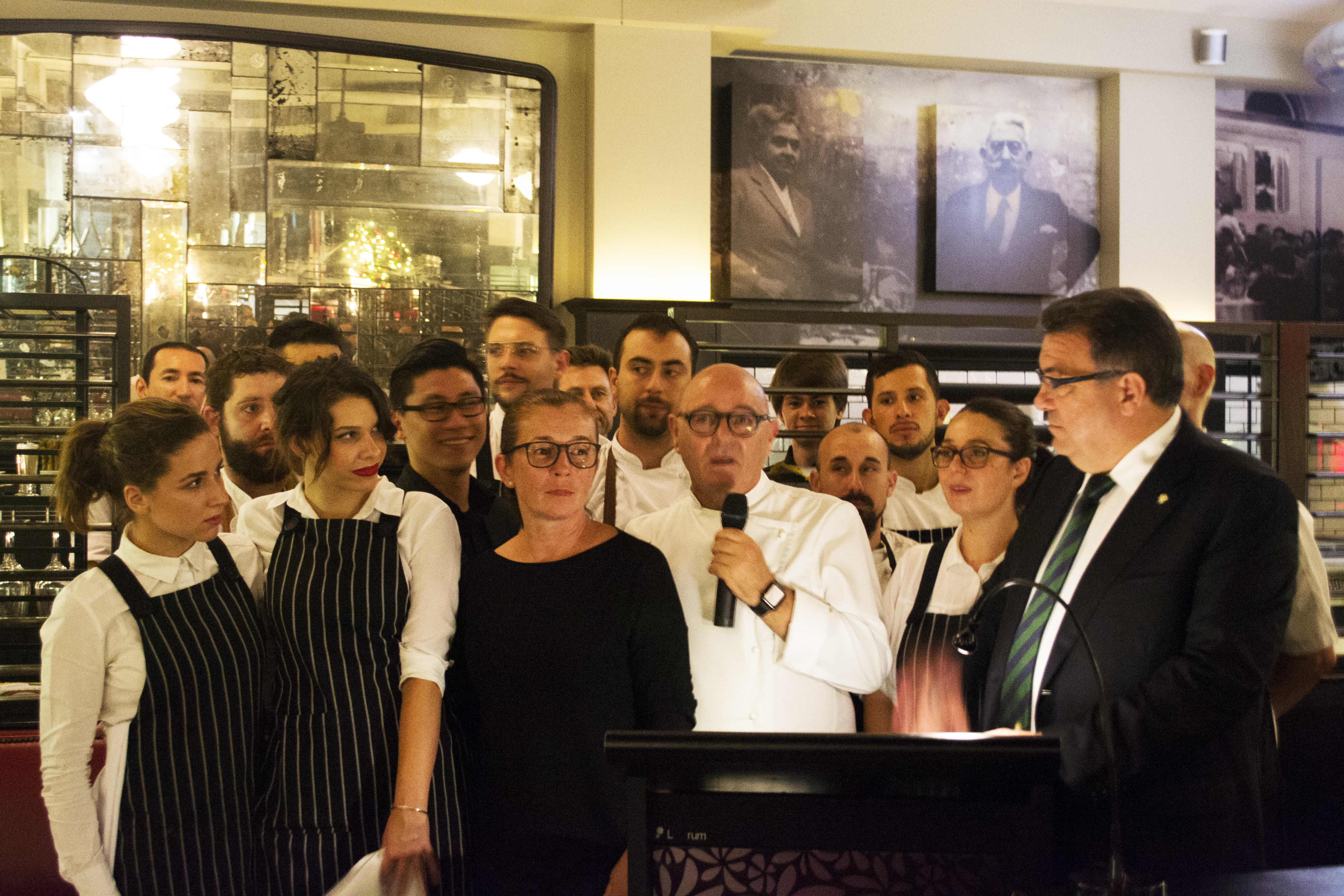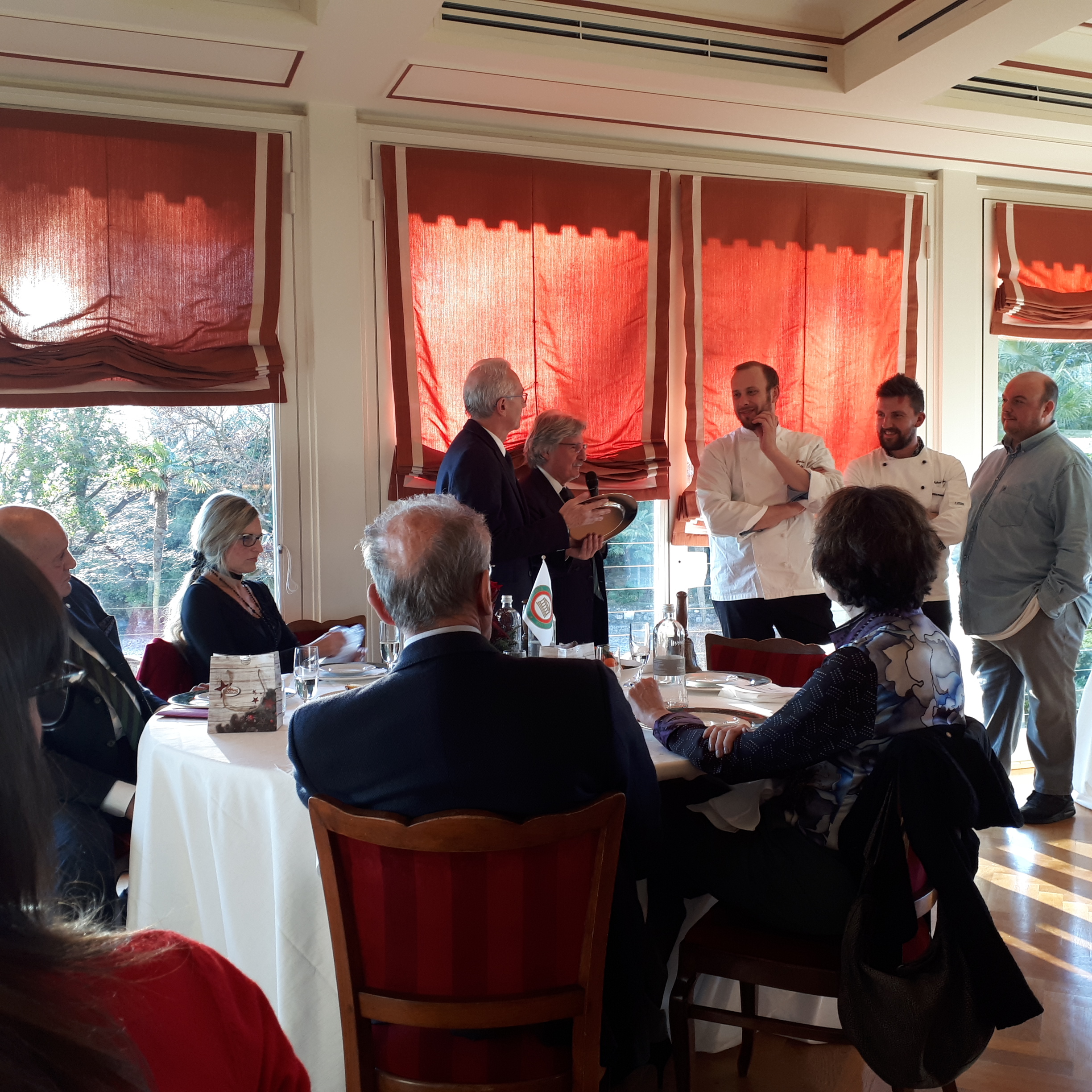 E' avvenuto alla presenza del Presidente Paolo Petroni il passaggio della campana tra il Delegato uscente Paolo Grandi, nominato Delegato onorario, e il neo eletto Delegato Emilio Casati. La cerimonia si è svolta nell'elegante sala dell’Hotel Splendide Royal di Lugano. Foto 1 (da sinistra): i Consultori Alessandro Del Bufalo, Giovanni Frey, Marta Lenzi Repetto, il Delegato onorario Paolo Grandi, il Presidente Paolo Petroni, il Delegato Emilio Casati, il Vice Delegato Massimo Ciocco, il Consultore Segretario Pier Franco Gaggini, i Consultori Francesca Bonifaccio Meschini ed Enea Petrini. Foto 2. Il momento del passaggio della campana. Foto 3. Dal menu: gamberi viola, seppia al vapore, cagliata di latte, caviale di trota e soffice al peperone crusco. Foto 4. torta con logo AIC.
