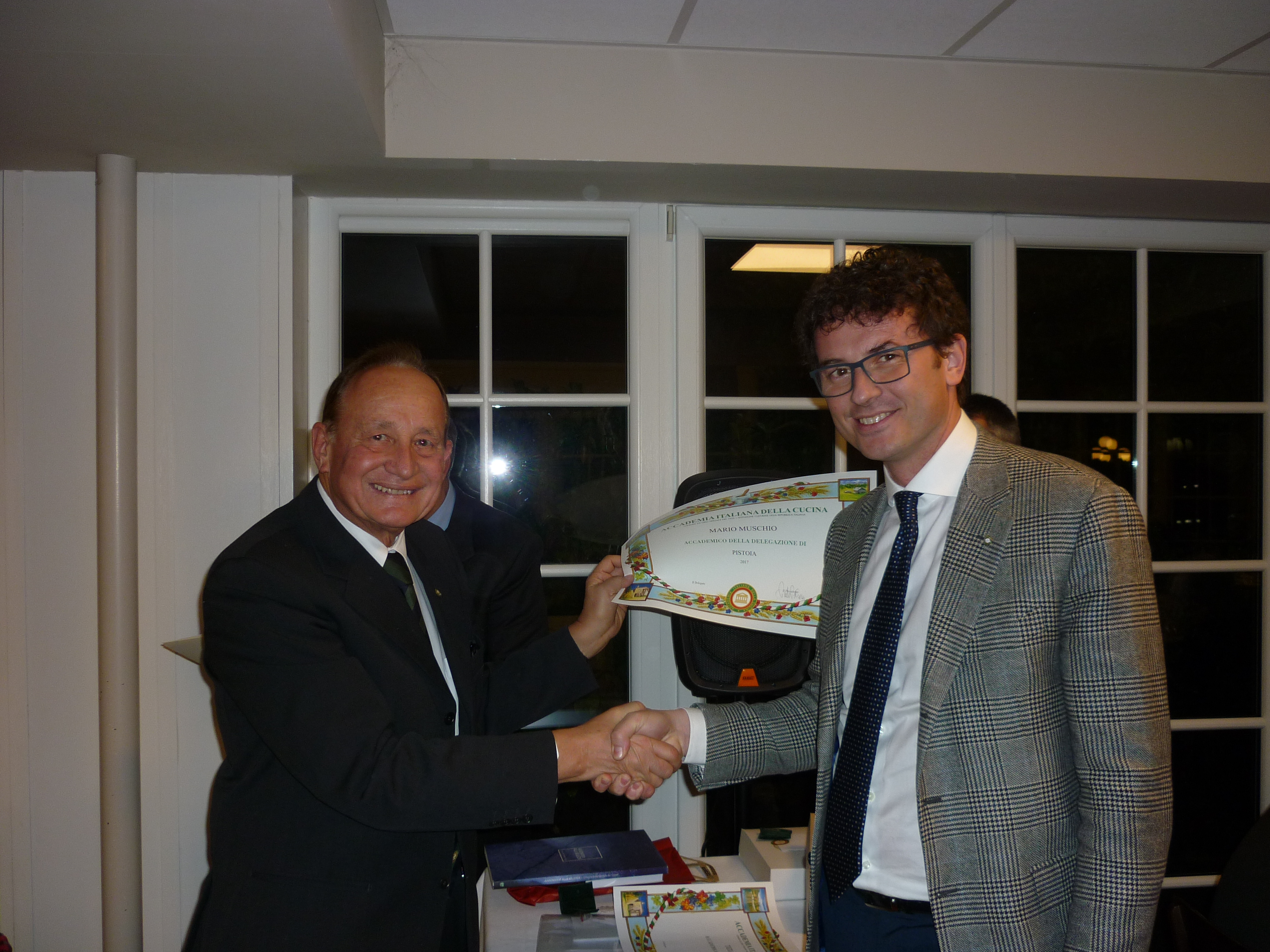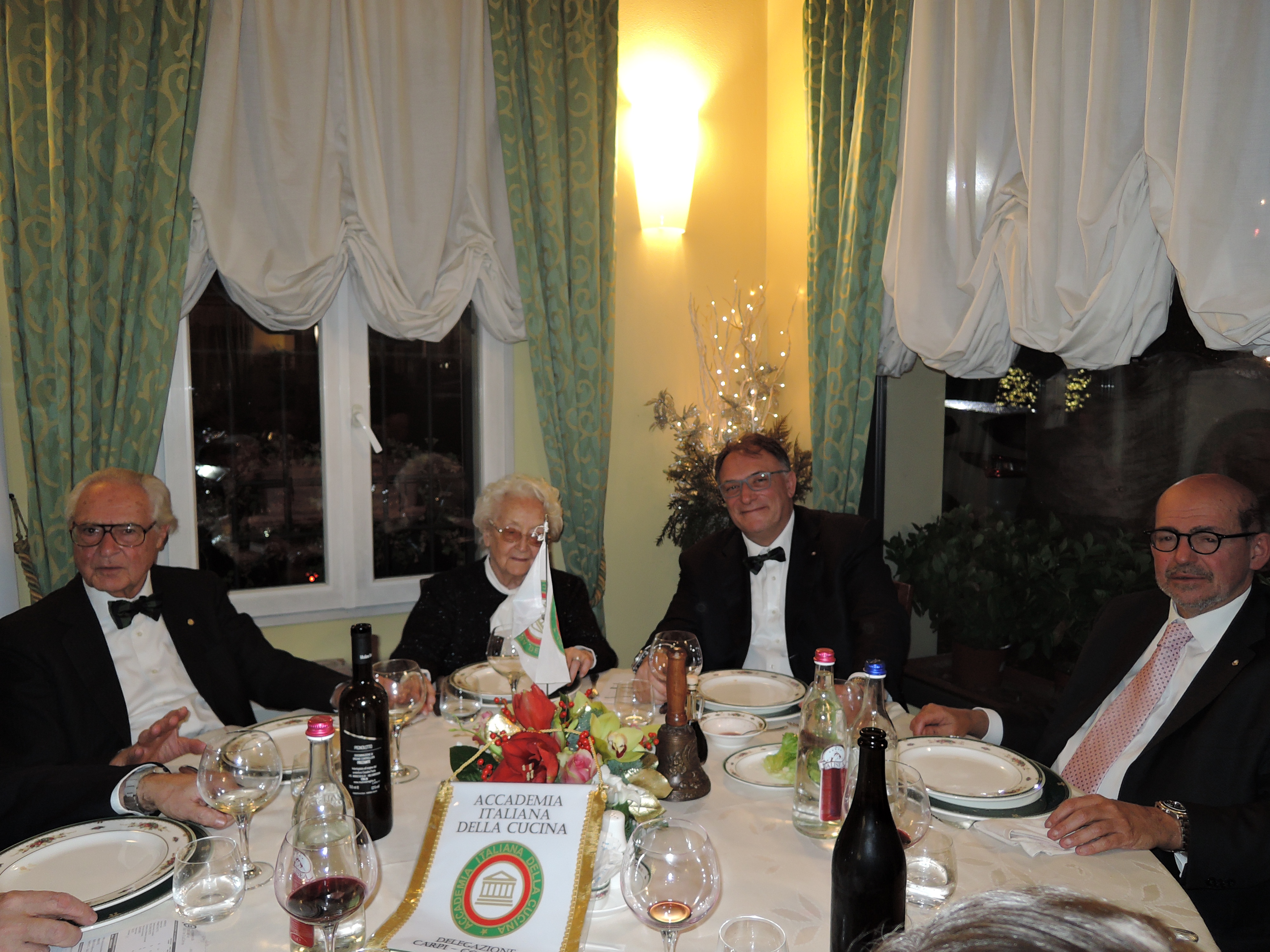 Il ristorante “Hidalgo” di Postal ha ospitato la cerimonia del passaggio della campana tra il Delegato uscente Raoul Ragazzi ed Emanuele Nobili (foto 1 a sinistra Emanuele De Nobili, a destra Raoul Ragazzi). La serata è stata molto partecipata e per l’occasione erano presenti, in segno di amicizia e stima, altri Delegati della Regione: Stefano Hauser di Trento, Germano Berteotti di Rovereto e Piergiorgio Baruchello di Bressanone (foto 2). Foto 3. Il Delegato con la campana dell'Accademia. Foto 4: il Delegato De Nobili consegna al maÎtre di sala il piatto dell'anno 2019 sul tema “le paste fresche, ripiene e gli gnocchi”.