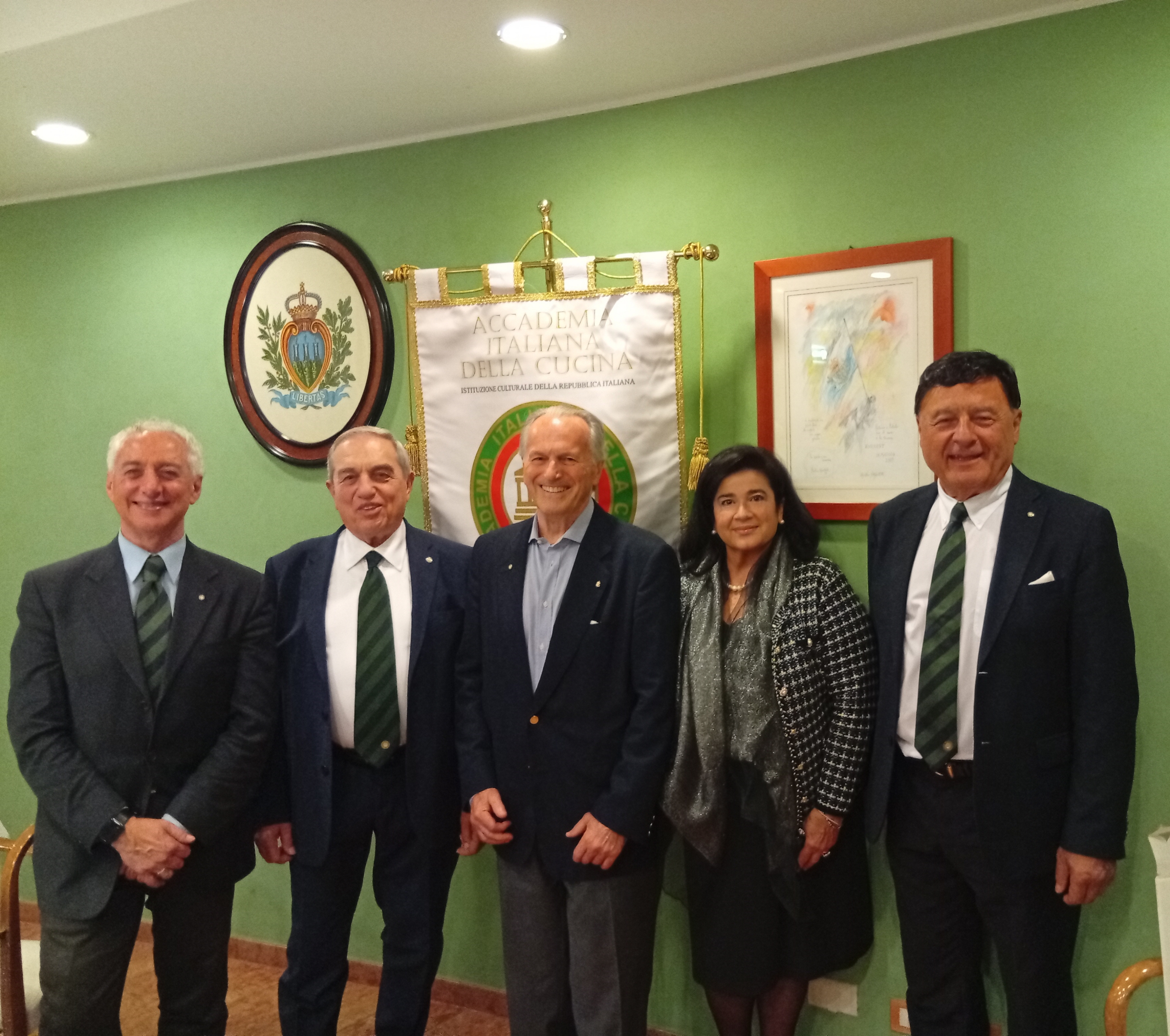 Il Delegato Stefano Valentino Piva ha introdotto la Cena Ecumenica, svoltasi nelle eleganti sale del Ristorante e Hotel Cesare di San Marino, come un momento di incontro e riflessione: non una semplice cena, ma un’occasione di dialogo e valorizzazione della tradizione gastronomica locale, capace di unire storia, cultura e innovazione. ll tema annuale scelto ha richiamato le radici dell’allevamento e della trasformazione dei prodotti della terra, valorizzando la carne come simbolo di civiltà, espressione di una cucina rispettosa dei cicli naturali e del lavoro agricolo. Arrosti, bolliti e carni in umido evocano la convivialità familiare e la sapienza delle antiche cucine domestiche. Il tema dell'anno è stato presentato dal Simposiarca Cesare Tabarrini e dallo Chef Graziano Canarezza. Il menu, frutto di ricerca e rispetto per il territorio, ha proposto piatti eseguiti con materie prime locali: insalata di spinaci con lingua e cotechino, mostarda di pere e pomodori verdi marinati; cappelletti al sugo di arrosto con polentina e guancia di vitello; arrosto di faraona ai funghi spontanei e coniglio in porchetta. Per concludere, una crema al cioccolato bianco e mascarpone con castagne, accompagnata dai vini della Cantina di San Marino. La serata, impreziosita dal conferimento delle insegne ai nuovi Accademico Rodolfo Torelli e Riccardo Fantoni, si è chiusa con il suono della campana, in un clima di convivialità e cultura gastronomica.