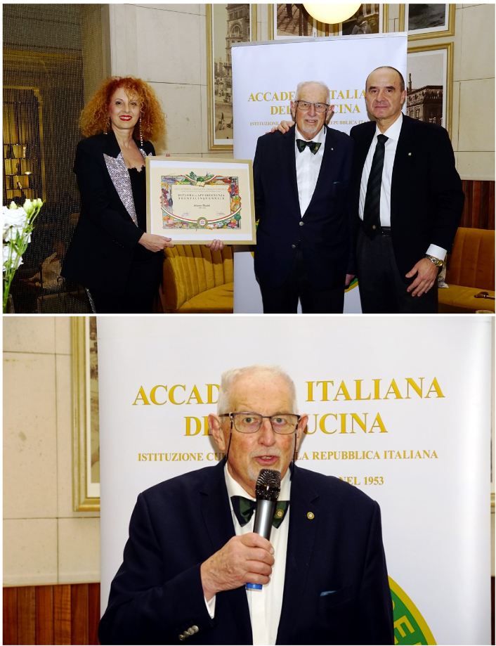 ll seminario organizzato dall'Ambasciata d'Italia in Ungheria e dalla Delegazione di Budapest si è svolto alla "Sala Fellini" dell'Istituto Italiano di Cultura, nell'ambito della IX SCIM. Dopo i saluti del Direttore dell'Istituto, Gabriele La Posta, il Consigliere d'Ambasciata Diego Randazzo, in rappresentanza dell'Ambasciatore e Accademico Onorario S.E. Manuel Jacoangeli, ha aperto i lavori, introducendo il tema dell'incontro.A seguire, il Segretario Generale dell'Accademia Italiana della Cucina, Roberto Ariani, ha fatto pervenire i saluti dell'Accademia. Il Delegato, che ha moderato l'evento, ha sottolineato come "mangiare, come parlare, è comunicare" e l'importanza di un approccio multidisciplinare alla corretta alimentazione. Successivamente, la Vice Delegata Maria Carmela Gaetani Aronica ha tenuto una stimolante presentazione sulla Dieta Mediterranea, esplorandone la storia e il ruolo fondamentale dell'Accademia. Il prof. Győző Szabó, già Direttore dell'Accademia d'Ungheria in Roma, ha illustrato l'influenza della gastronomia italiana sulle tradizioni culinarie ungheresi, evidenziando i forti legami di amicizia tra i due Paesi. A seguire, una tavola rotonda ha coinvolto esperti come Gianni Annoni, del ristorante "Pomo D'Oro", e l'Accademico Carlo Volpe, che hanno approfondito il rapporto tra corretta alimentazione e cultura gastronomica, trattando la cucina come una vera e propria forma d'arte. L'incontro si è concluso con la consegna del libro Storia della Cucina Italiana a fumetti agli studenti dell'Obudai Gymnasium, guidati dalla prof.ssa Terez Nagy Gongyi, e un buffet finale che ha visto la partecipazione attiva e competente dei presenti.