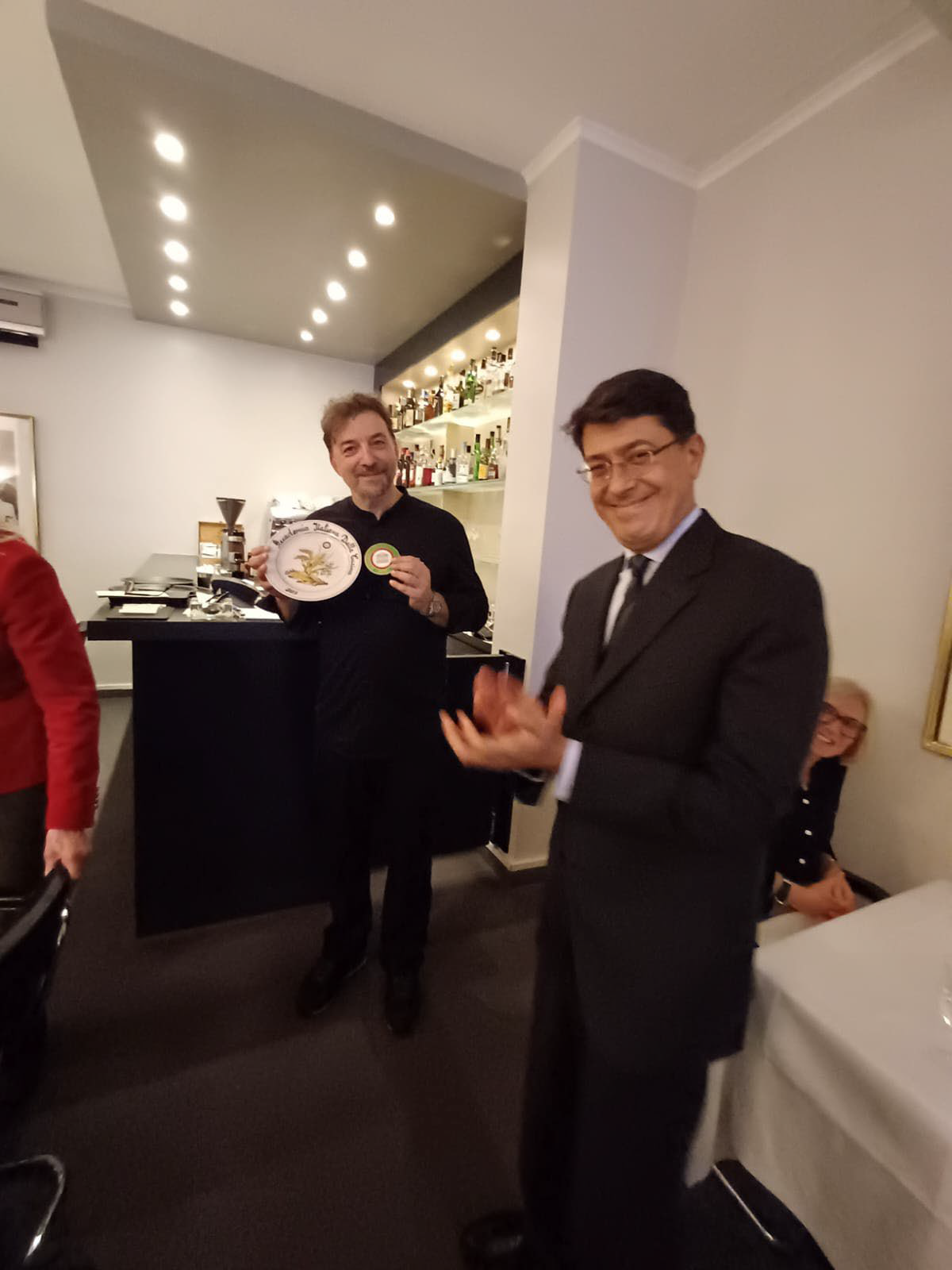 Bellissima riunione conviviale da Paper Moon, recente apertura a Londra dell'iconico ristorante di Milano. Ospiti della serata S.E. l’Ambasciatrice Maria Grazia Lambertini, il Console Generale Domenico Bellantone e Signora Marinù, il Direttore Istituto di Cultura Francesco Bongarrà, il Presidente della Camera di Commercio Alessandro Belluzzo e, graditissima sorpresa, l’indimenticabile Fabio Capello. Festeggiati i 25 anni di Accademia della Consultrice Elena Parigi Adragna Klat con la consegna, da parte del Delegato, dell’attestato di appartenenza e del distintivo. Menu preparato dallo Chef Leonardo, secondo lo stile dell’Accademia, innovazione nel rispetto della tradizione: aperitivo all’aperto di canapè freddi e caldi con Prosecco millesimato riserva Zonin, seguiti da un eccellente risotto alla milanese con tartare di capesante, coda di rospo alla vaccinara (variazione interessante del tipico piatto di carne romano) e panna cotta con frutti di bosco, decorata con una foglia di argento. Grandi applausi alla fine per la brigata di cucina e di sala per un servizio impeccabile; consegna del piatto ricordo da parte del Delegato e del Simposiarca Marco Gubitosi.
