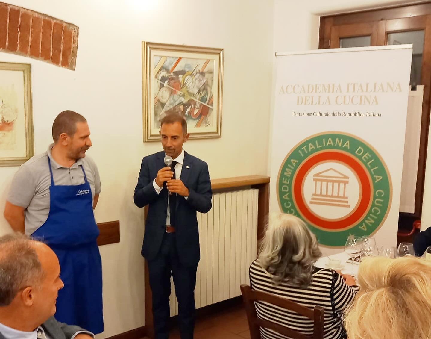 La riunione conviviale si è svolta presso il ristorante Ulivello in Chianti, all’interno dell’omonima azienda agricola, per la prima volta visitata dalla Delegazione. L’azienda, immersa nelle campagne di Greve in Chianti e gestita dalla famiglia Osti dal 2015, ha sede in un complesso storico-rurale ottocentesco che comprende “Villa Ulivello” sapientemente restaurata dalla famiglia. Le Simposiarche Assia Olivieri e Paola Mainardi hanno concordato con il titolare Federico Osti e lo chef Andrea Parronchi un menù gustoso preparato con prodotti locali e verdure dell’orto. In una sala dedicata interamente agli Accademici (foto 1), dopo un pinzimonio di verdure di stagione con olio dell’azienda agricola e cremoso di ceci con pesto di nocciole, si sono susseguiti: risotto con fiori di zucca e zafferano, peposo di capriolo e fagiolini piattellini, cotognata di pere e mele cotogne con ricotta fresca di pecora. Ad ogni piatto è stato abbinato un diverso e ottimo vino dell’azienda o del territorio (foto 2 e 3). Durante il convivio le Simposiarche hanno descritto i piatti e le ricette utilizzate e Paolo Osti, padre di Federico, ha illustrato le particolarità dei vini serviti. Tutto il menù ha ottenuto una votazione molto alta, l’abbinamento dei vini è stato eccellente e il servizio cordiale e premuroso. Al termine della serata il Delegato Sandro Fusari e le Simposiarche hanno ringraziato la famiglia Osti e omaggiato il cuoco con una collezione di volumi dell’Accademia (foto 4).