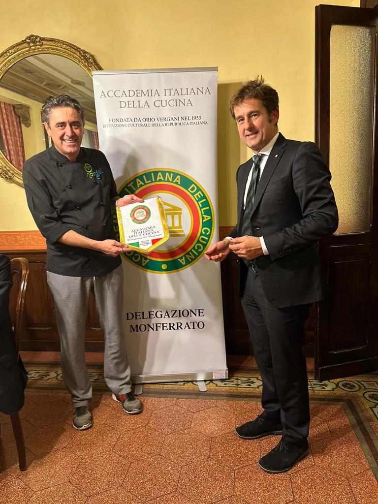 Il loggiato cinquecentesco dell'ex seminario vescovile di Acqui Terme ha fatto da cornice all'ultima riunione conviviale delle Delegazione alessandrina prima della pausa estiva. Gli Accademici si sono ritrovati presso il Ristorante “Il Moncalvo” la cui cucina è affidata al giovane chef Luca Guidetti, idee chiare e tecnica moderna, con l'obiettivo di dare una svolta in chiave contemporanea e gourmet alla cucina della tradizione sin qui operata dalla chef storica Angela Gervino, sempre presente unitamente al marito Filippo Tirri, patron e responsabile della sala. Una serata dal clima un po' autunnale ha visto l'ingresso di tre nuovi Accademici, Laura Kaminski, Stefano Traversa e Luca Garruto, presentati rispettivamente dagli Accademici Giovanni Costa, Giulio Stabilini e Adriano Benzi. Prima della cena un altro appuntamento con le eccellenze della Provincia di Alessandria, a cura di Giorgio Borsino, incentrato sul formaggio Montebore, sul Filetto baciato di Ponzone e sui Baci di Tortona. Consegnata infine la vetrofania 2024 dell'Accademia ai gestori del locale con il plauso dei presenti.