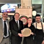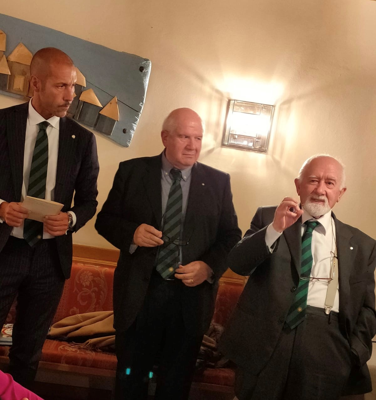 Gradita visita della Delegazione di Fermo ospitata dalla Delegazione messinese presso l’associazione “Il Circolo”. Il Delegato (Foto 1), dopo il caloroso benvenuto al Delegato Fabio Torresi e agli amici Accademici fermani (fra i quali era presente Cristofaro La Corte, già Questore di Messina), ha illustrato il menu, filologicamente basato sulla carta di un ristorante messinese del 1902. È stato il Simposiarca Attilio Borda Bossana, Consultore e Direttore del Centro Studi della Sicilia Orientale, a rappresentare ai numerosissimi commensali nel sontuoso salone d’epoca (Foto 2), l’ultra secolare storia delle pietanze servite, facendo anche riferimento al suo libro “Il Cibo Italiano negli Stati Uniti”, edito dalla Delegazione. Il Delegato ha quindi consegnato il materiale associativo ad alcuni dei nuovi Accademici (Foto 3, da sinistra Emilia Ciriaco, Marisa Renda, Natale Naccari e Luigi Hyerace). Unanime l’apprezzamento manifestato allo chef Massimiliano Usbergo e alla sua squadra di cucina e di sala da parte di tutti gli Accademici e dagli Accademici marchigiani, festosamente ritratti nella foto 4.